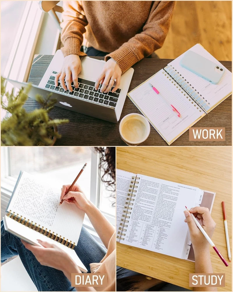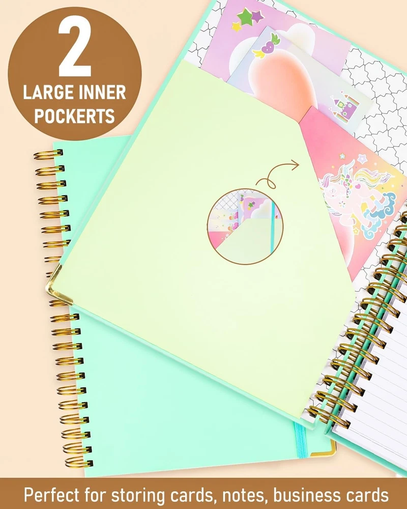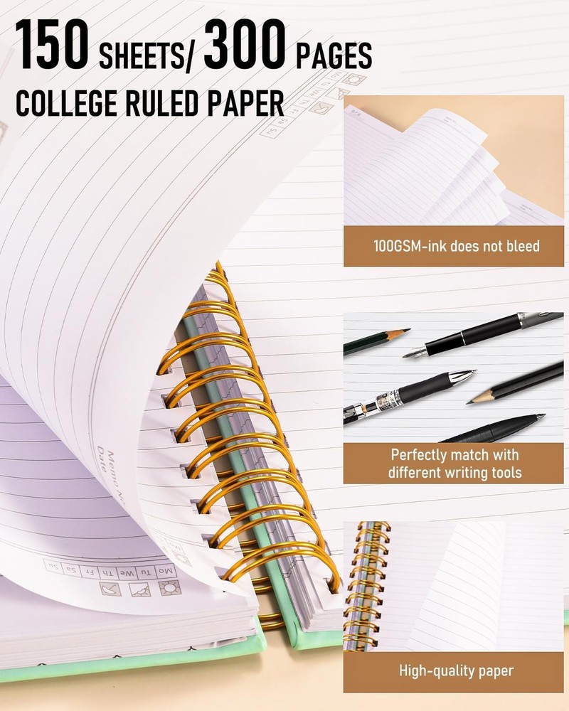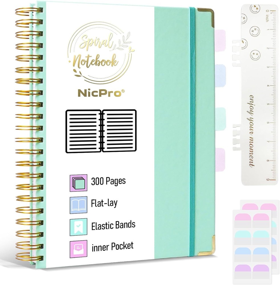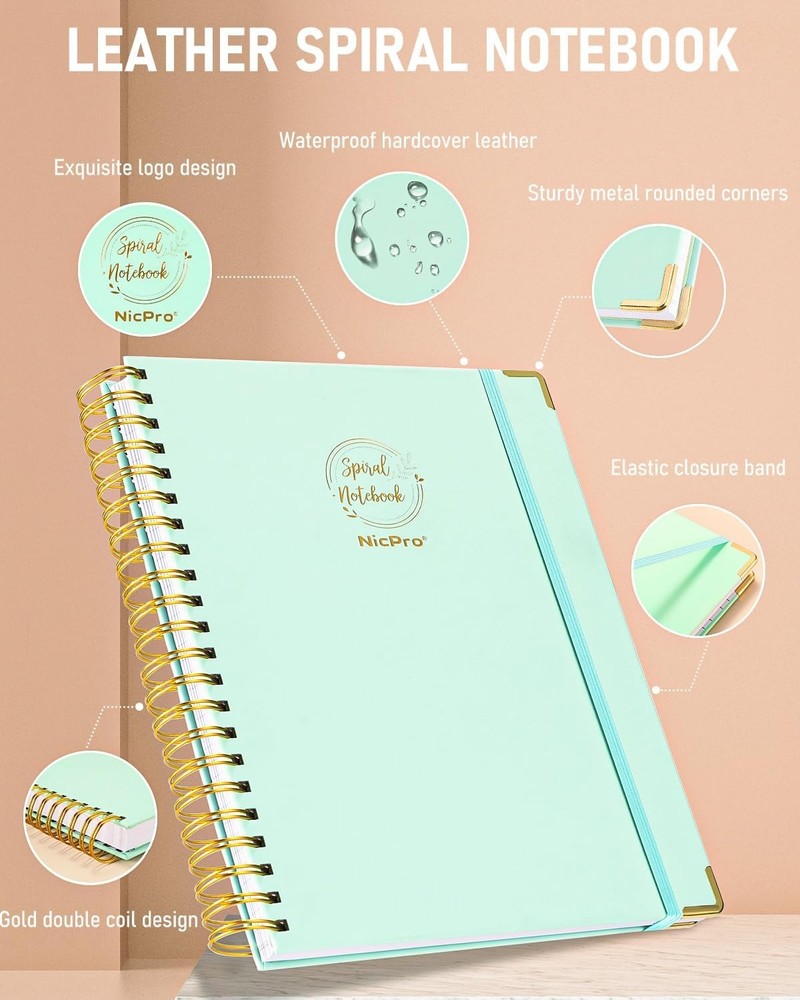 Nicpro Spiral Notebook 8.5"x 11", 300 Pages Leather Hardcover Sea Green Product Details Manufacturer: NICPRO CO.,LTD Brand: Nicpro Item Weight: 2.57 pounds Package Dimensions: 11.38 x 10 x 1.34 inches Color: Sea Green Cover Material: Leather Number of Items: 1 Ruling: Ruled Sheet Size: A4 Manufacturer Part Number: MG713 Brand: Nicpro Color: Sea Green Theme: Book Sheet Size: A4 Pages: 300 Cover Material: Leather Style: Lined Ruling Type: Ruled Special Feature: Hard Cover Number of Items: 1 A4 Hardcover Spiral Notebook. The hardcover notebook cover is waterproof leather hardboard, and has an elastic band and 4 thick rounded corner protectors, which can well protect the paper of the meeting notebook from spillage and wrinkles, thick and durable, and can be written when standing. Built-in pockets on the front and back covers can store paper, business cards, labels, etc., to prevent loss. 300 Pages&100 GSM Notebooks College Ruled. A4 Spiral notebook size 8.5" x11", A4 size is just perfect. There's plenty of space for notes, sketches, and even the occasional doodle. 300 pages of university regulations paper can last all year round. 100GSM college regular paper, smooth surface, ink will not seep out the next sheet when writing, no smudges, no ghosting, can be used on both sides, so that you have a very good writing and drawing experience. Subject Lined Notebook 60pcs Sticky Labels. College Ruled Notebook has "Memo Number" and "Date" at the top of each page to record the weather, day of the week, date, and numbered pages. Comes with a removable ruler and 6 sticky labels (60) in different colors to facilitate topic classification and finding records. It can be written on both sides and is easy to stick and disassemble and does not bend easily, making it ideal for marking and indexing meeting notebooks at work. Double Helix Journal Notebook. A4 notebook cover gold logo design, high-end atmosphere. The gold dual-coil design makes it durable and sturdy. Allows you to easily open and close books and unfold it to 180 degrees. Easy page turning, easy to tear off, writing and flipping through notes easier and smoother. It can be used for diary, note-taking, work meetings, making sketches and drawings, wide applications. Acid-free paper to avoid yellowing. Hardcover notebook paper is thick, smooth, and resistant to pen ink, making it ideal for offices, homes, schools, work organizations, businesses, colleges, students, travelers. Use as a diary, sketchbook, personal daily notebook, travel diary, work notebook in college classes or conferences.