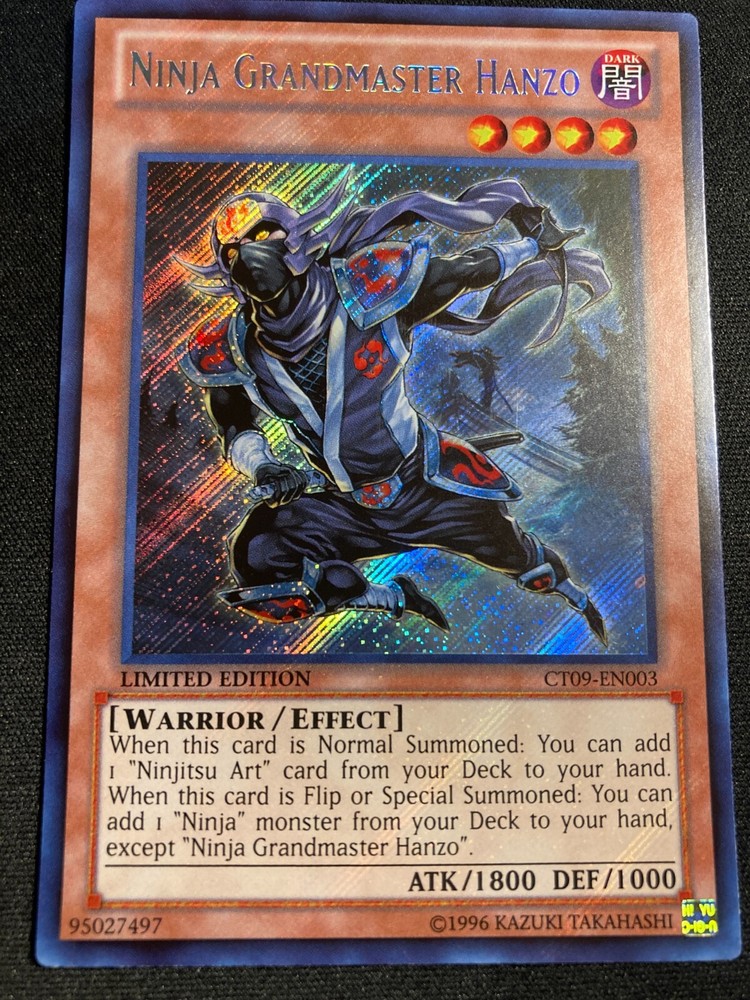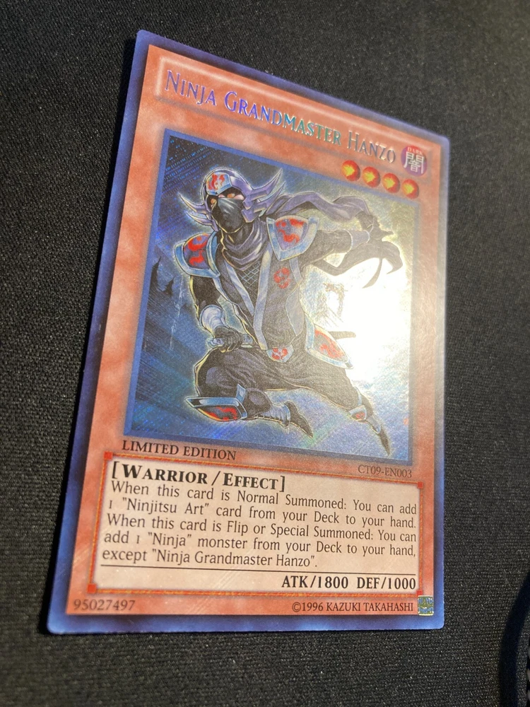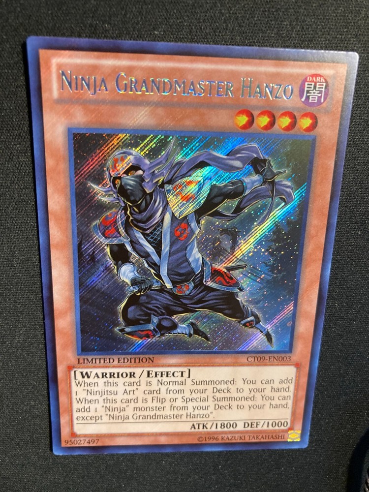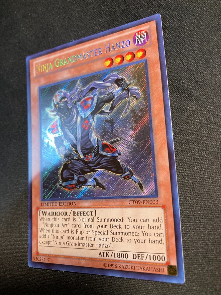 Ninja Grandmaster Hanzo CT09-EN003 - Secret Rare - Limited Edition - LP You are bidding/buying one (1) card. If you would like additional pictures, just ask. _________________________________________________________________________________________________________ Please check out my other listings @ https://www.ebay.com/str/lechungscards I ship all cards in a penny sleeve put into a top-loader and put into a standard envelope. If you have any question or concerns, please feel free to send me a personal message using the e-bay system. Thanks! !NO INTERNATIONAL SHIPPING OR SALES! (Including Canada)