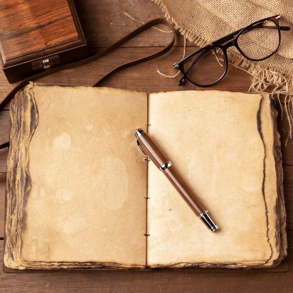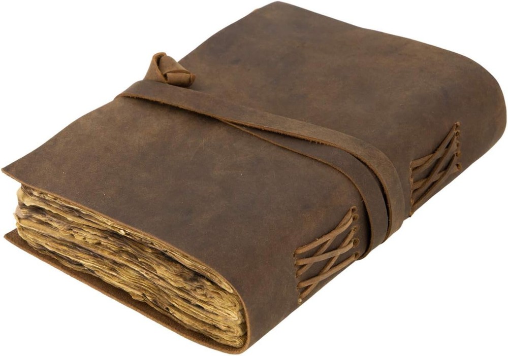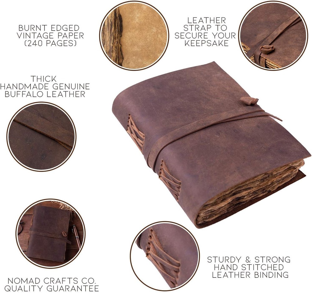 NomadCraftsCo. Vintage Leather Journal - Burnt 11.5" x 8.25", Brown Product Details Brand: NomadCraftsCo. Color: Brown Material: Cotton Sheet Size: 11.5 x 8.25 inches Paper Finish: Watercolor Product Dimensions: 11.5"L x 8.25"W Recommended Uses For Product: Drawing, Calligraphy, Doodling, Watercolor, Painting, Sketching Sheet Count: 240 Number of Items: 1 Manufacturer: NomadCraftsCo. Unit Count: 1 Count Item Weight: 2 pounds Item model number: NCRCO-Vintage-Burnt Cover Material: Leather Material Type: Cotton Size: 11.5" x 8.25" Ruling: Plain Manufacturer Part Number: NCRCO-Vintage-Burnt Brand: NomadCraftsCo. Color: Brown Material: Cotton Sheet Size: 11.5 x 8.25 inches Paper Finish: Watercolor BURNT ANTIQUE PAPER - Our newest Vintage Paper Leather Journal is made of unique burnt vintage paper which looks like it was pulled from history. You will love the old looking burnt handmade cotton paper (240 pages) which is unique to our vintage journals. USE ANY KIND OF PEN - Sketch, Doodle, Write on your journal notebook with a Calligraphy Pen Fountain Pen, Brush Pen, Ball Pen, Acrylic Colours, Watercolor and many more. PREMIUM SOFT SUPPLE THICK GENUINE LEATHER - The Nomad Leather Journal is made from cruelty free naturally tanned full grain Leather which feels and smells Amazing. It's soft and very comfortable in the hands. Don't be fooled with competitors using cheap substitutes, this is the real deal. STYLISHLY MEDIEVAL - Ancient looking rustic burnt cotton paper combined with the beauty of distressed leather, hand stitched by Artisans, creates a keepsake you will cherish forever. Makes a great gift for the men, women, and wiccans in your life! STURDY BINDING AND LEATHER WRAPAROUND - Sturdy hand stitched binding to make sure that no paper comes out loose from your vintage notebook . The leather wraparound keeps the papers of the journal safe and secure. Bring out your inner creativity with the NomadCraftsCo. Antique Leather Bound Writing Journal for Women and Men!The deckle edged vintage paper looks and feels like a thousand years old is treat to write on. The paper is made from environentally friendly cotton and jute canvas. The paper is acid-free and pH nuetral therefore is a timeless piece of art. No more worries about ink messing up the pages either. The thick pages are ideal for pen, pencil, crayons and even charcoal! We can guarantee no bleed through!The vintage leather journal is a perfect sketchbook, book of shadows,grimoire, wicca, calligraphy journal, scrapbook, art journal, leather sketchbook and leather bound journal made from antique paper is a treasure that you can pass down the leather is soft and supple to the touch and smells amazing. The leather will age over time and will get better and better. Its the perfect travel companion to cherish memories or even to jot down precious ideas and there is not better way preserve your memories for your future Yourself The Most Valuable Travel Companion Today – Never Have To Travel Alone Again.Handcrafted by skilled artisans with a lot of love and care. Here’s Why This Vintage Leather Bound Writing Journal Is What You Are Looking For:1. Soft Luxurious Durable and Supple Rustic Leather Bound Cover which ages with time.2. 240 Pages of Thick Antique Vintage Cotton Paper which looks like thousand years old. 3. Sturdy Leather Binding Technique will make sure that the pages never fall off. 4. Large size 11.5 by 8.25 inches rustic scrapbook/organizer.5. Being hand-made, no two journals are quite the same.