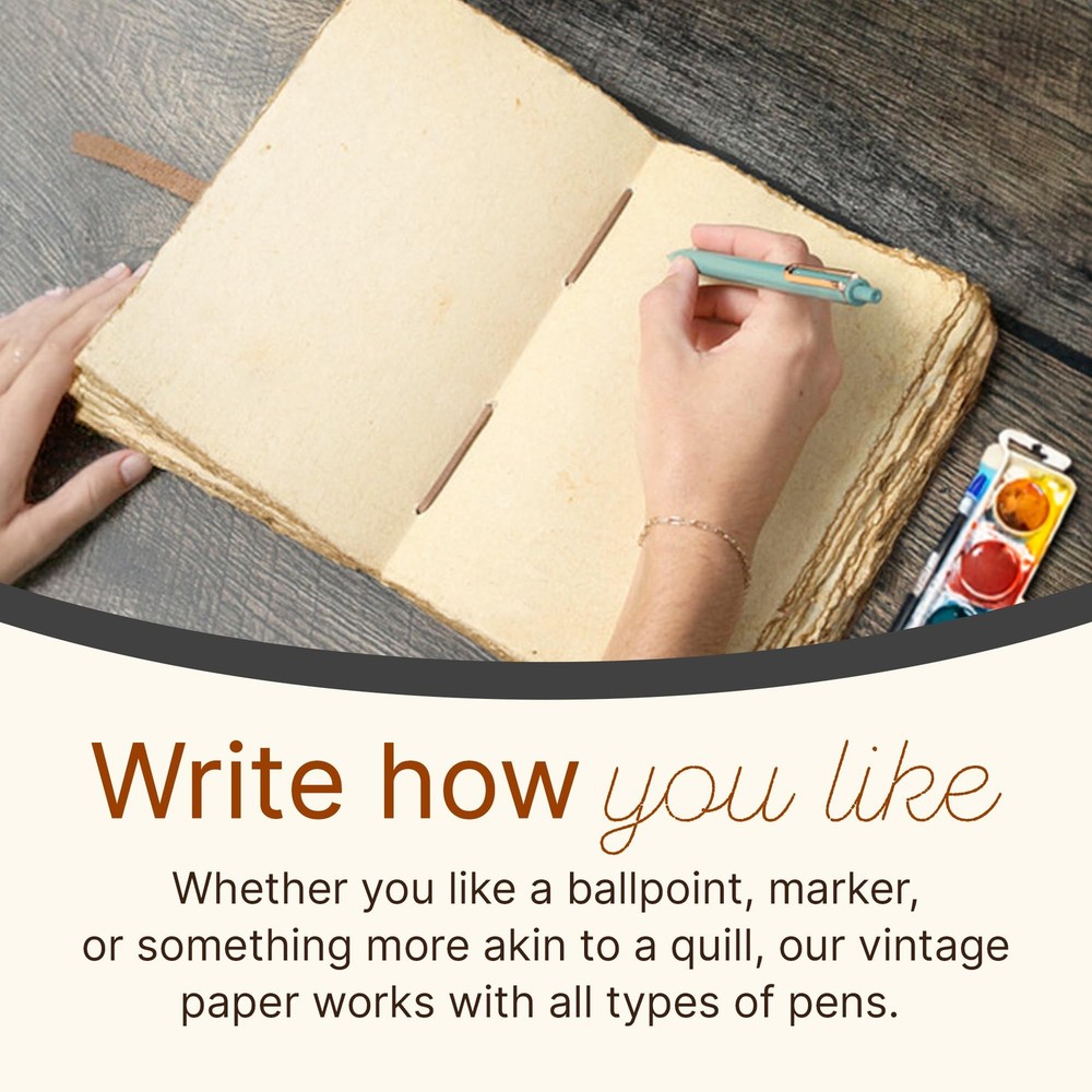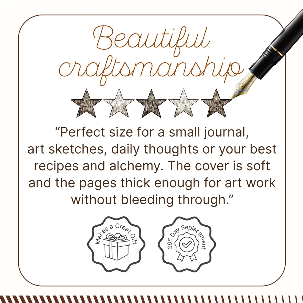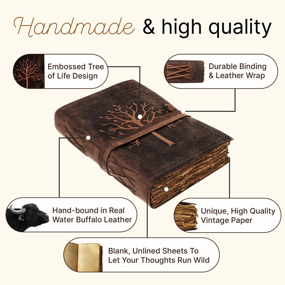 Get Yourself The Most Valuable Travelling Companion Today – Never Have To Travel Alone Again The deckle edged vintage paper looks and feels like a thousand years old is treat to write on. The paper is made from environmentally friendly cotton and jute canvas. The paper is acid-free and pH nuetral therefore is a timeless piece of art. No more worries about ink messing up the pages either. The thick pages are ideal for pen, pencil, crayons and even charcoal! We can guarantee no bleed through! The vintage leather journal is a perfect sketchbook , book of shadows,grimoire, wicca, calligraphy journal, scrapbook, art journal, leather sketchbook and manymore. The leather bound journal made from antique paper is a treasure that you can pass down the generations. Here’s Why This Vintage Leather Bound Writing Journal Is What You Are Looking For: 1. Durable and high quality leather bound cover. 2. 240 pages Vintage Paper for drawings, sketches, stories, pregnancy thoughts, writing prompts, food and exercise planning, fitness tips, and more! 3. Travel notebook for weight watchers, poets, writers, pen fountain lovers, artists, parents, world explorers, and yourself! 4. Medium size rustic scrapbook/organizer easily portable. 5. Being hand-made, no two journals are quite the same Manufactures Warranty applicable only if purchased from "NomadCraftsCo." Scroll Up & Click Add To Cart Now! UNIQUE HANDMADE VINTAGE PAPER - Nomad Crafts Co. Vintage Journal is made with 240 pages of Antique Paper which looks like it was pulled from history. You will fall in love with the the antique handmade cotton paper which is very unique to our Nomads Vintage journal. ANY KIND OF PEN - Sketch, Doodle, Write on your Leather Bound Journal with a Calligraphy Pen Fountain Pen, Brush Pen, Ball Pen, Acrylic Colours, Watercolor and many more. EXQUISITE & UNIQUE EMBOSSED TREE DESIGN: The Leather Bound Journal is made from thick Dark Brown Water Buffalo Leather which is Soft & Supple to the touch. We have taken extra to make sure that the emboss is perfect in every piece.The leather is tanned with a special oil that will allow you to create your own distressed style if you fold the leather. Our Journals are proudly made by Gifted Artisans and use the best genuine leather that is available. STURDY BINDING AND LEATHER WRAPAROUND - Sturdy hand stitched binding to make sure that no paper comes out loose from your vintage notebook . The leather wraparound keeps the papers of the journal safe and secure. OUR 365 DAY REPLACEMENT PROMISE - We are very confident that you will fall in love with your Vintage Journal that we offer a 1 year guarantee .If you are not happy with your leather journal for any reason we will offer a FULL REFUND or a FREE REPLACEMENT. No Questions asked!