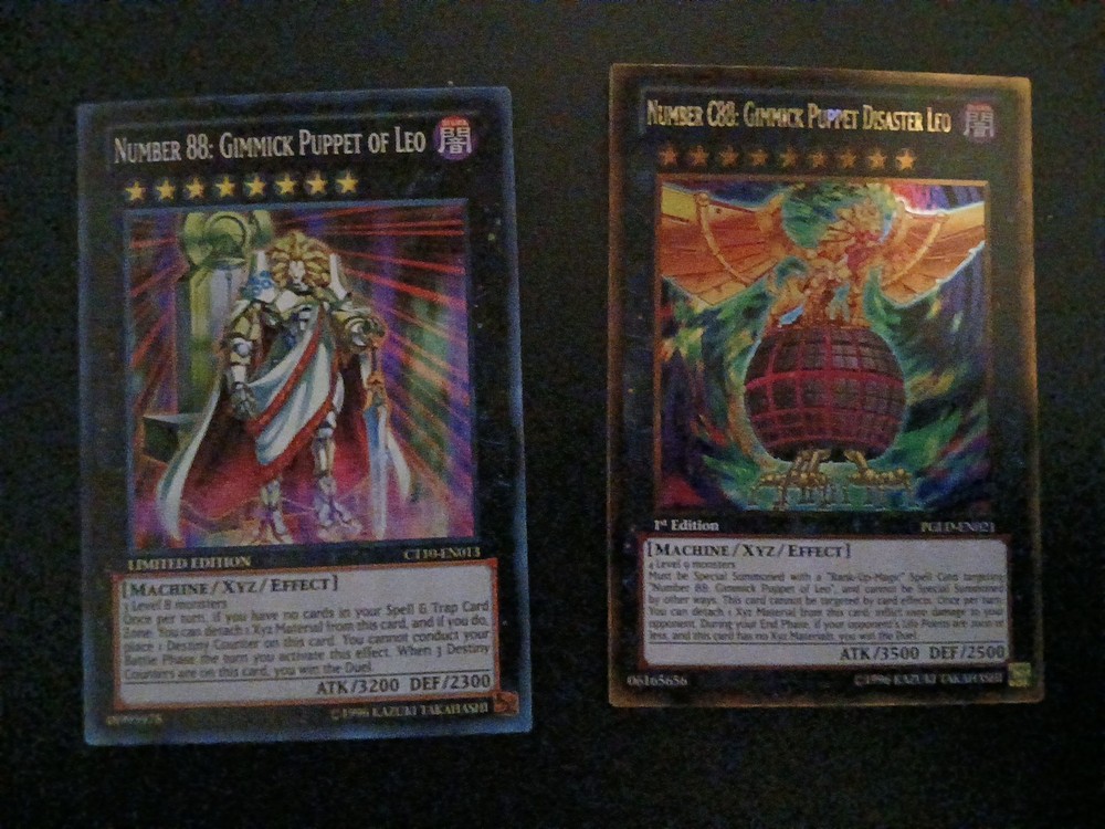 GREETINGS NUMBER HUNTERS!!! Number 88: Gimmick Puppet Of Leo (CT10-EN013) is a Super Rare, Limited Edition, English Yu-Gi-Oh! TCG card from the 2013 Collectors Tins set. Number C88: Gimmick Puppet Of Disaster Leo (PGLD-EN021) is a Gold Rare, 1st Edition, English Yu-Gi-Oh! TCG card from the Yu-Gi-Oh! Premium Gold set. Both cards are highly sought after by collectors for their unique designs and rarity within the Yu-Gi-Oh! trading card game. As seen in the photos, the Number 88 card has a vertical scratch on the back. As such, I have lowered the asking price for that card from $5 down to $2.50. The Number C88 card is in Near Mint or better condition ... asking price of $7 for that card.