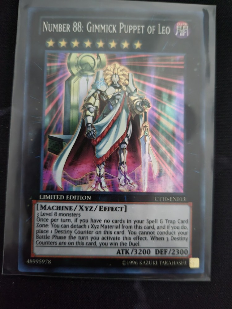 The Number 88: Gimmick Puppet of Leo (CT10-EN013) is a limited edition Yu-Gi-Oh! Trading Card Game card from the 2013 Collectors Tins set. With a dark attribute, machine creature type, and super rare rarity, this English-language card boasts a defense of 2300 and an attack power of 3200. Manufactured by Konami, this Xyz and Effect card is a valuable addition to any collector's deck.