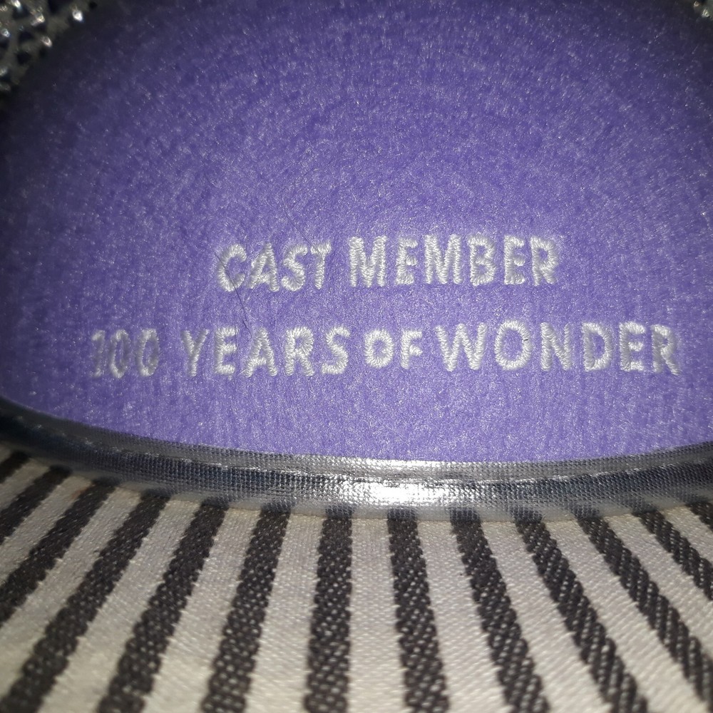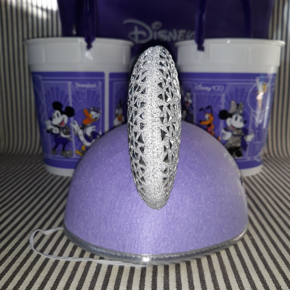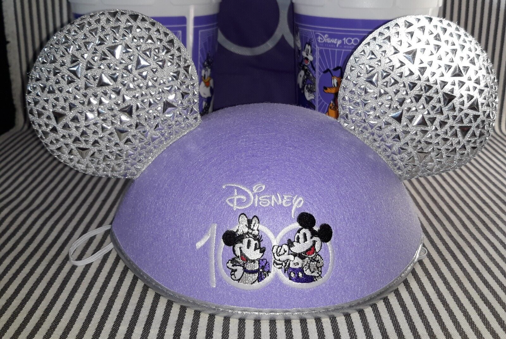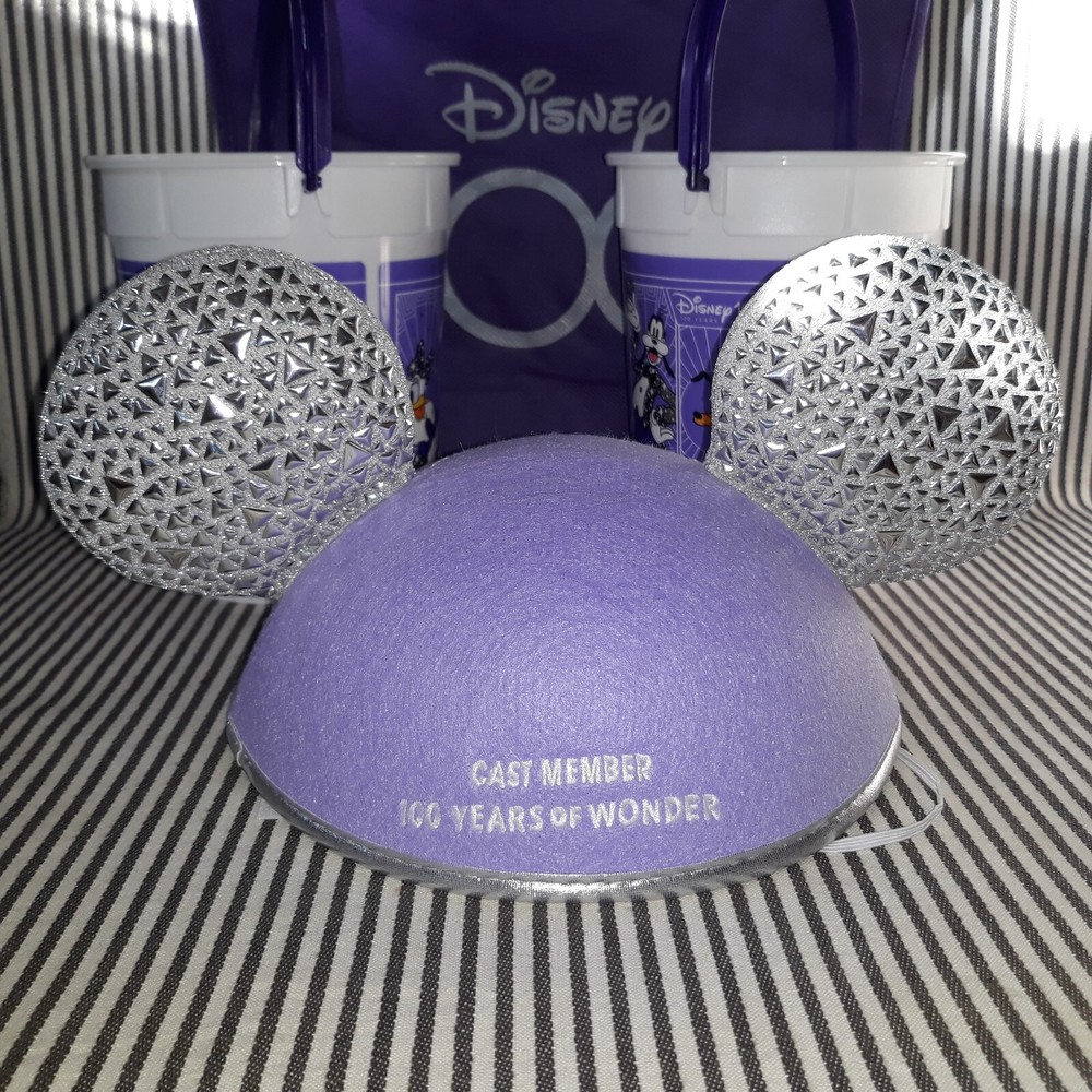 THIS AUCTION IS FOR THE RARE HARD TO FIND NEW WITHOUT TAG NwoT DISNEY PARKS CAST MEMBER MICKEY & MINNIE MOUSE ADULT SIZE EAR HAT SILVER & LAVENDER PURPLE FOR THE YEARS OF WONDER. ON THE FRONT ARE MICKEY AND MINNIE MOUSE INSIDE THE 100 LOGO OF THIS LAVENDER HAT HAS A CHIN ELASTIC WITH SILVER PATTERNED EARS AND TRIM WHILE THE BACK HAS BEEN ENSCRIBED WITH " CAST MEMBER ... 100 YEARS OF WONDER"!! THIS ONE SIZE EAR HAT MEASURES APPROXIMATELY 11"w w/EARS x 6-1/2"d x 8"w AT CAP. THIS CAST MEMBER EAR HAT WAS ONLY BRIEFLY WORN ONCE FOR PHOTO OP SO IS IN NEW CONDITION WITH VERY MINIMAL TO NO SIGNS OF USE OR WEAR ... NO RIPS, TEARS, DINGS, DENTS, FADING, STAINS, DISCOLORATIONS, OR REPAIRS ... NICE :) GREAT FOR EVERYDAY WEAR :) BUT WOULD BE FABU FOR NEW YEAR'S!!!