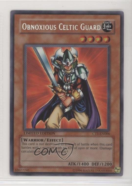 2004 Yu-Gi-Oh! Collectors Tin - Promo [Base] - Ultra Secret Rare Misprint #CT1-EN006 Obnoxious Celtic Guard COMC Item: 70896750 - YuGiOh Card - Featuring Obnoxious Celtic Guard Search for more: 2004 Yu-Gi-Oh! Collectors Tin Search for more: 2004 Yu-Gi-Oh! Collectors Tin - Promo [Base] - Ultra Secret Rare Misprint View all of our Listings Auctions Buy It Now About Us Located in the beautiful Pacific Northwest, COMC (Check Out My Cards) is the world's largest consignment service for trading card singles. More than 10,000 people have used our consignment service to list over 50 million trading cards. Find out how we can help you consign your items on eBay by contacting us through eBay messaging. COMC -- "The Safe & Easy Way to Buy & Sell" Raw Condition for Modern Cards Unless otherwise noted, raw modern cards are listed in Near Mint-Mint condition or better. A NM-MT card appears to be Mint at first glance, but upon closer inspection, may exhibit some of the following: minor print defects (e.g. roller marks, print line, dimple), minor scratches, slight edge wear, and slight corner wear. Centering is clearly visible in the images provided and does not factor into our condition assessment. Raw Condition for Vintage Cards Unless otherwise noted, raw vintage cards are listed in Excellent condition or better. An EX card may exhibit some of the following: minor rounding of corners, surface wear, print defects, light scratches, and slight edge wear/chipping. Centering is clearly visible in the images provided and does not factor into our condition assessment. Domestic Shipping Combined shipping for multiple items is available. To receive combined shipping, please ensure all desired items are in your eBay shopping cart before proceeding to checkout. eBay limits orders to 40 items per order. We automatically combine multiple orders placed on the same day. If you place multiple orders on the same day, please contact us to request a refund of applicable shipping costs. Signature confirmation may be required on invoices over $400. All cards are protected and shipped securely. International Shipping COMC offers eBay's International Shipping (EIS) for international orders under $2,500* (see country exceptions below). All duties and import fees are paid at checkout; in the rare event that there are additional import fees upon delivery, these are borne by the buyer. EIS packages route through a shipping hub in Erlanger, KY before shipping to their final destination. Please note that EIS does not allow for combined shipments. The shipping rates are determined by eBay and cannot be adjusted. *Maximum sale price exceptions: Colombia, Kuwait ($2,000); Taiwan ($1,539); Chile, Costa Rica, Guatemala, Honduras, Trinidad and Tobago ($1,000); Antigua and Barbuda, Aruba, Belize, Dominica, Grenada, Philippines, Saint Kitts and Nevis, Saint Lucia, Montserrat, Turks and Caicos Islands ($500); Dominican Republic, El Salvador ($200). Please request a shipping quote through eBay messaging for orders that exceed the maximum sale price supported by eBay's International Shipping. You will be responsible for all duties and import fees for international orders shipped outside the EIS. All cards are protected and shipped securely. Payment COMC does not accept offers on our cards through our eBay storefront. COMC utilizes eBay’s managed payments system. If you are experiencing difficulties making a payment, please contact eBay for assistance. Return Policy Returns are only accepted on the rare occasion the item is not as described. If you are making a return, please initiate the return process through eBay so a mailing label can be provided for you. Prior to listing, our expert team carefully assessed this item to represent it accurately. Please review the description and high-definition images prior to purchasing to ensure this item meets your satisfaction. We welcome you to contact us if you have further questions about this item. Trust and Integrity COMC carefully assesses each item consigned to us to prevent fraudulent items from entering the marketplace. If you believe an item offered on COMC may be fraudulent, please contact us with details so we can investigate the issue. Items we determine are outside our supported items policy may be removed. Last Modified: 5/30/2025 8:58:20 PM PDT