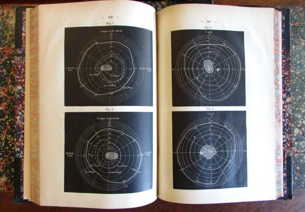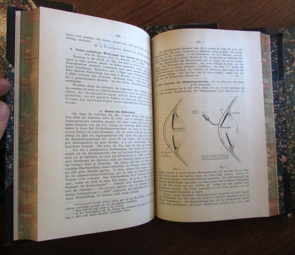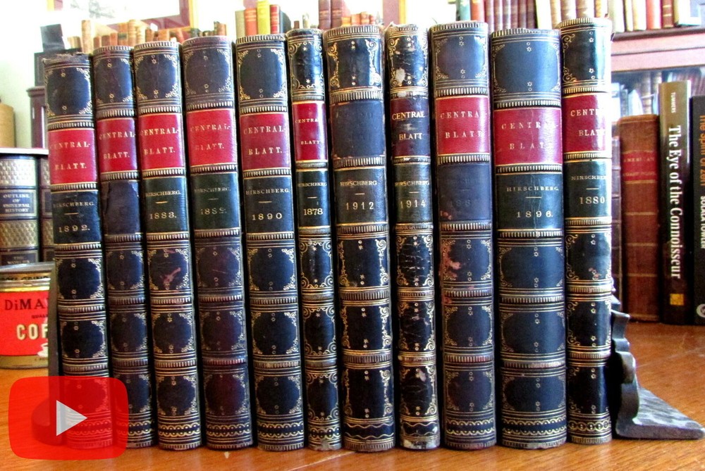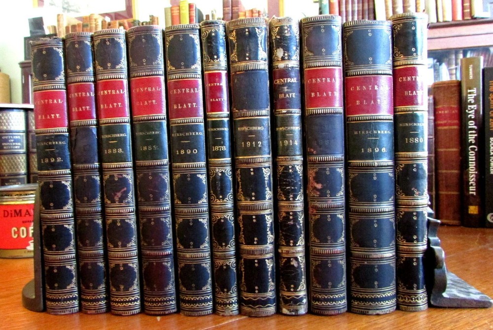 Ophthalmology Medical Journal German Eyes 1878-1914 Leather books 11 vols Ophthalmology Medical Journal German Eyes 1878-1914 Leather books 11 vols Click here to view a short video presentation of this item. Ophthalmology- Eyes- Medical journal Nice broken run of eleven bound volumes, each containing a years worth of monthly journals. Scartterings of illustrations throughout. Period European 3/4 leather bindings, marbled boards & endpapers. Some scuffing and wear, but still overall handsome on shelf and worthy of ownership and display. Centralblatt fur Praktische Augenheilkunde, by Dr. J. Hirschberg. Leipzig, Verlag von Veit & Comp. Volumes composed of monthly issues published in the following years: 1878. 1880. 1882. 1883. 1884. 1885. 1890. 1892. 1896. 1912. 1914. Books measure: 9 1/4" H X 6 1/2" W. Set along the shelf measures: 12 3/4". [V675] Guaranteed authentic - old. We do not sell modern reprints.