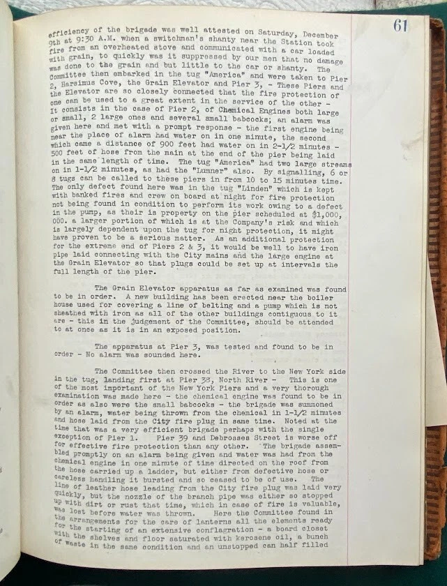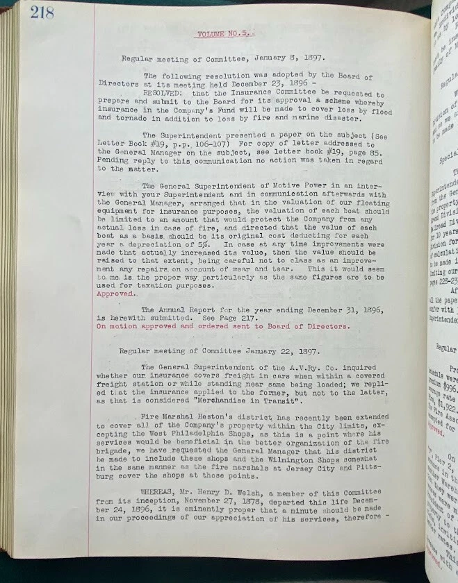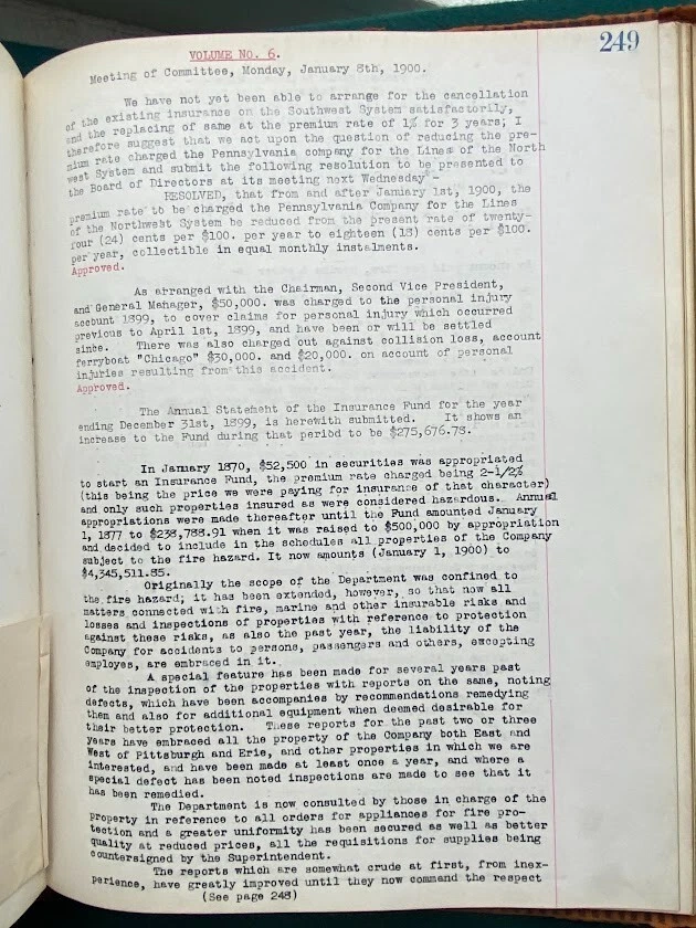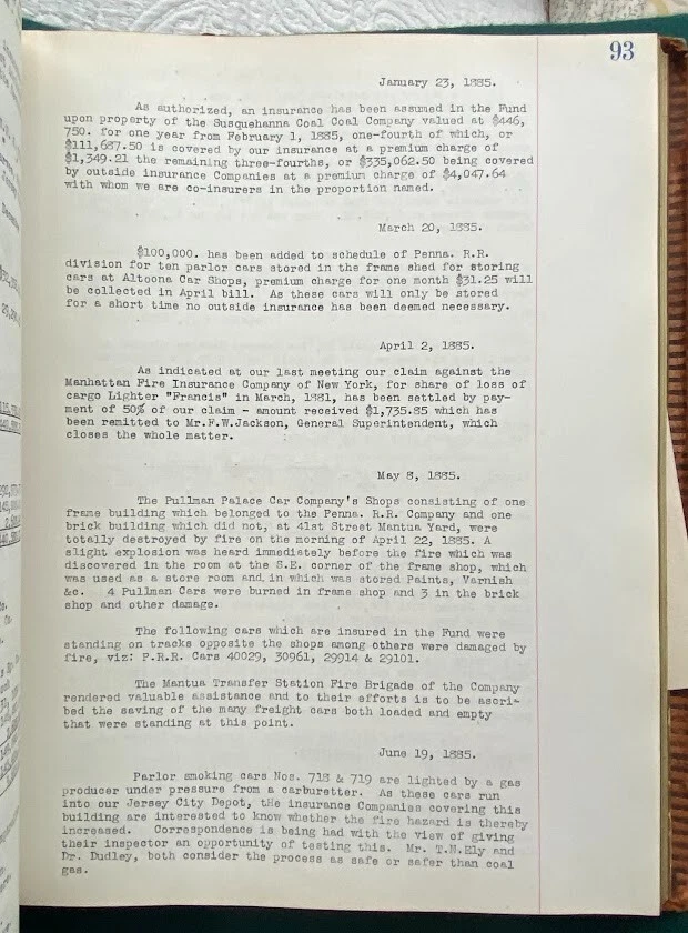 Minutes Insurance Committee P.[ennsylvania] R.[ail] R.[oad] Co.[mpany]. A single volume containing 284 pages of typescript extracts from the minutes of the meetings of the PRR Insurance Committee, dated 27 November 1878 – 22 December 1902. [Probably compiled circa 1910-30]. Large quarto (12 ½ x 10 inches). 248 typescript pages, with occasional manuscript corrections or additions. Original reversed calf, labels to upper cover and spine, marbled paper endpapers (extremities damaged). A fascinating and wide-ranging series of extracts. An almost random sampling: Nov. 26, 1878 PRR Subcommittee on Insurance reports that PRR should also self-insure non-hazardous properties and goods in transit. (MB) Nov. 27, 1878 PRR Board approves creation of Insurance Bureau, reporting to Board, effective Jan. 1, 1879 Dec. 10, 1878 PRR Subcommittee on Insurance makes second report on creating a Standing Committee on Insurance and an Insurance Bureau. (MB) Jan. 22, 1879 PRR Board authorizes creation of a Standing Committee on Insurance and an Insurance Dept. (not Bureau as earlier); orders trustees of insurance fund established in Dec. 1876 to turn over funds to new Insurance Committee. (MB) Feb. 12, 1879 PRR Board grants Altoona Library Association $500 plus a room in the shops; appoints W.W. Curtin Clerk of the Insurance Dept. Feb. 26, 1879 Thomas T. Firth relieved as head of Insurance Fund; made registrar of Consolidated Mortgage bonds. (Watkins) Apr. 1, 1881 Thomas T. Firth resigns as Treasurer of the Insurance Fund and Secretary & Treasurer of the sinking fund of the Consolidated Mortgage because of health. (MB, RRGaz) Oct. 1, 1882 Hugh B. Ely (1838-1907) named Secretary of the Insurance Dept. as new department head, replacing W.W. Curtin, Clerk of the Insurance Dept., resigned. (MB) Dec 22, 1882 report of the Committee who toured and inspected the Piers and Buildings in New York Harbor Apr 9, 1886 report of a disastrous fire, Camden, N.J. Sep. 22, 1886 PRR Insurance Dept. enlarged to cover marine risks. (MB) Sep 1, 1887 complimentary report submitted by Hugh B. Ely Sept 4, 1891 report that Hugh B. Ely named Insurance Agent of the Northern Central Railway. (AR) Apr 7, 1893 report of some of the changes during re-organization, including Hugh B. Ely named to new position of Superintendent of Insurance Dept. (RRGaz). Nov 17, 1893 report of claim for cotton bales ‘damagd by fire’ – owner had outside insurance, Ely does not want to pay. Apr 7, 1899 resolution reported: PRR extends Insurance Fund to cover personal injuries except those to employees. Jan. 8, 1900 Value of PRR’s Insurance Fund is $4,345, 511.85 million. (MB)