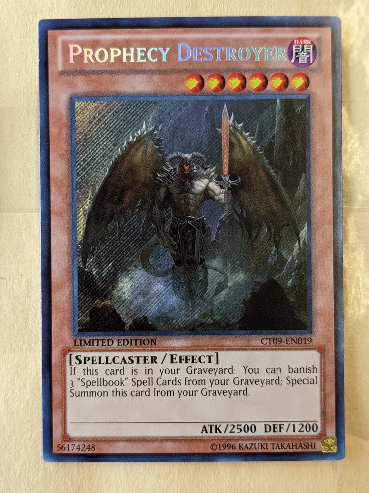 You are bidding on a YUGIOH-PROPHECY DESTROYER-LIMITED EDITION SECRET RARE-CT09-EN019 This card is not graded but in good condition. The edges are a little rough with discolouration. You get the card shown in the pictures. I will ship your card in a top loader, bubble wrap then cardboard mailer. I will combine shipping. My shipping price is $2.99 for up to 9 regular thickness cards and $3.99 and up for anything over 10 cards. Payment must be made within 3 days of purchase. I will ship 2 business days after receiving payment. I don't ship on Saturday or Sundays. To ALL my customers, please be patient as the mail has slowed down due to the VIRUS. THANK YOU for your patience and understanding. Be safe!! There is a delay at customs, my US customers, please note it could take up to 60 days to receive your cards. If you have any questions, please don't hesitate to contact me. Please check out my other items at Jethro's cards and collectibles. Have a great day, cheers!