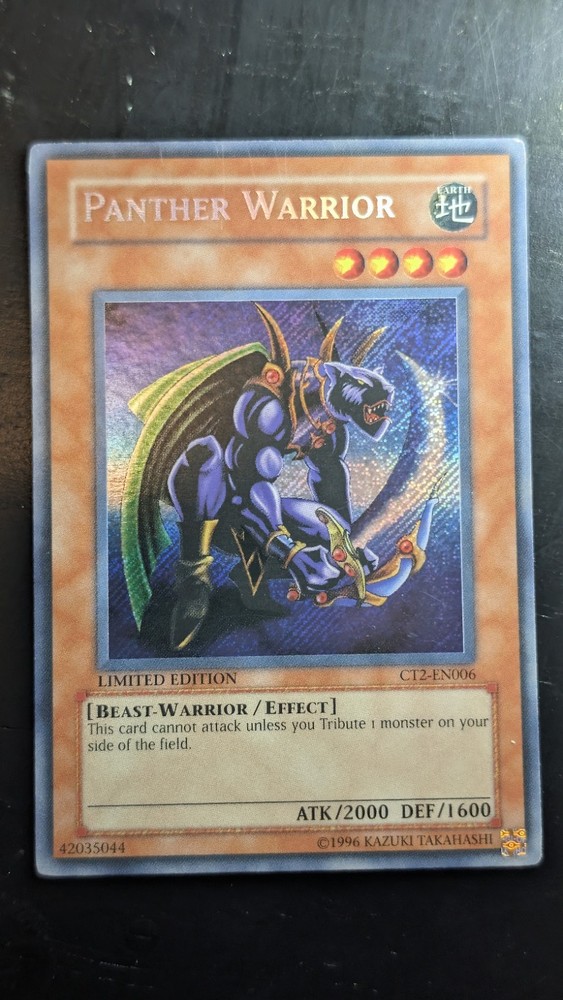 The Panther Warrior CT2-EN006 2005 Collectors Tin Limited Edition card is a highly sought-after Yu-Gi-Oh! TCG collectible from the set released in 2005. With a rarity of Secret Rare and a holo finish, this English-language card features the powerful Beast-Warrior type creature with 2000 Attack/Power and 1600 Defense/Toughness. Manufactured by Konami, this limited edition card is in near mint condition, making it a valuable addition to any card collection.