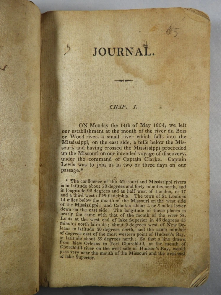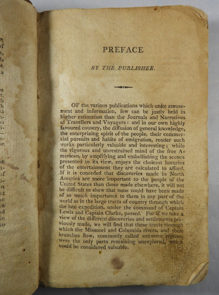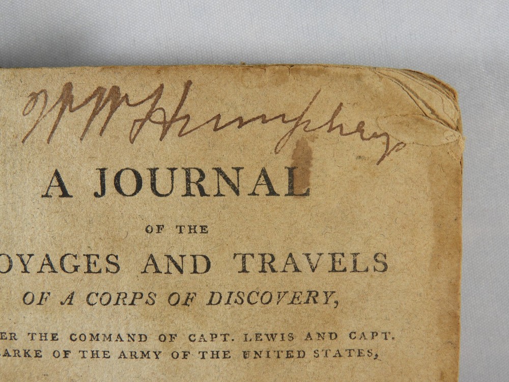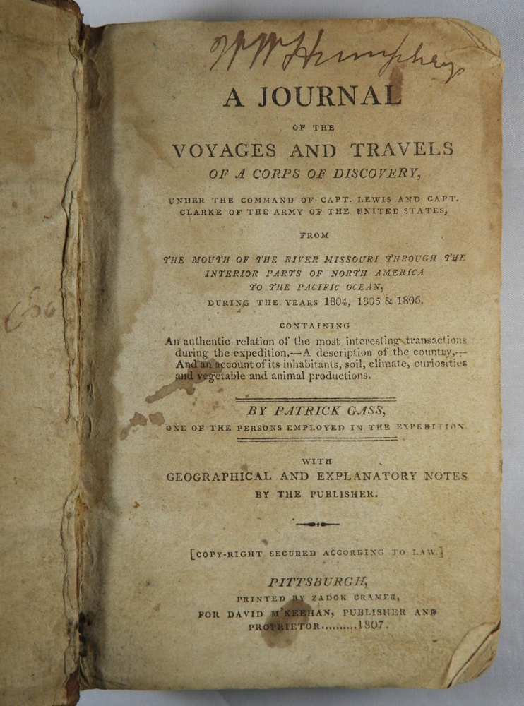 GASS, PATRICK (1771-1870) . A Journal of the Voyages and Travels of a Corps of Discovery, under the Command of Capt. Lewis and Capt. Clarke of the Army of the United States, from the Mouth of the River Missouri through the Interior Parts of North America to the Pacific Ocean, during the Years 1804, 1805 & 1806 . Pittsburgh: Printed by Zadok Cramer for David M’Keehan, 1807. First edition, original leather-backed calf boards, 262 pages, measures 6.5 by 4.25 inches, and in good to very good condition with extensive rubbing to the boards (primarily to the top and bottom right corners of the front board), the front and back flyleaves and half-title page absent, and staining, soiling, dampstaining, creasing, tearing, and handwritten notations to the pages. FIRST EDITION OF PATRICK GASS’S A JOURNAL OF THE VOYAGES AND TRAVELS OF A CORPS OF DISCOVERY, UNDER THE COMMAND OF CAPT. LEWIS AND CAPT. CLARKE…FROM THE MOUTH OF THE RIVER MISSOURI THROUGH THE INTERIOR PARTS OF NORTH AMERICA TO THE PACIFIC OCEAN… PRINTED BY ZADOK CRAMER FOR DAVID M’KEEHAN IN PITTSBURGH IN 1807 The first full account by a Lewis and Clark participant to be published. Due to Meriwether Lewis’s untimely suicide, it was the only reference book associated with the expedition to be available to the public for seven years. Lewis ordered the sergeants to write daily diaries as stated in his April 7, 1805 letter to President Thomas Jefferson, “we have encouraged our men to keep journals, and seven of them do so, to whom in this respect we give every assistance in our power.” THE FIRST FULL ACCOUNT BY A LEWIS AND CLARK PARTICIPANT TO BE PUBLISHED According to Wagner-Camp, “Although he had not learned to read and write until an adult, Gass nonetheless complied with Lewis's orders that each sergeant keep a daily journal...Gass became one of the best-known members of the expedition for several reasons: his key role as sergeant brought his name up frequently in the journals of Lewis and Clark; his account was the first to be published; he was the first to have a biography written about him; and finally, he outlived the other members of the Corps of Discovery by decades, dying at the age of ninety-nine in 1870.” A carpenter by trade, Gass helped build Forts Mandan and Clatsop and later provided valuable commentary on these fortifications. First editions of Gass’s Journal of the Lewis and Clark Expedition are excessively rare and highly desirable with two copies having commanded as much as $45,600 at Christie’s in April 2007 and $21,960 at Bonhams in December 2010. THE ONLY REFERENCE BOOK ASSOCIATED WITH THE EXPEDITION TO BE AVAILABLE TO THE PUBLIC FOR SEVEN YEARS Contains the ownership signature of General William Wirt Humphreys (1836-1893) on the title page. Humphreys was a South Carolina lawyer, editor, and soldier who led the Palmetto Sharpshooters under General James Longstreet’s command at the Battles of First Manassas, Williamsburg, Seven Pines, Gaines’ Mill, and Frayser’s Farm where he suffered a near-fatal wound. He would later continue to fight at the Battles of Spotsylvania, Second Cold Harbor, Bermuda Hundred, Siege of Petersburg, and Appomattox Court House. After the war, Humphreys served as a probate judge and the mayor of Anderson, was promoted to Major General of the State Militia, and appointed President of the Savannah Valley Railroad. Christie’s. Gass, Patrick (1771-1870). A Journal of the Voyages and Travels…. PBA Galleries. Patrick Grass’s Journal 1807 Lewis and Clark. Under the Kudzu: Hidden, Forgotten, and Lost History. William Wirt Humphreys.
