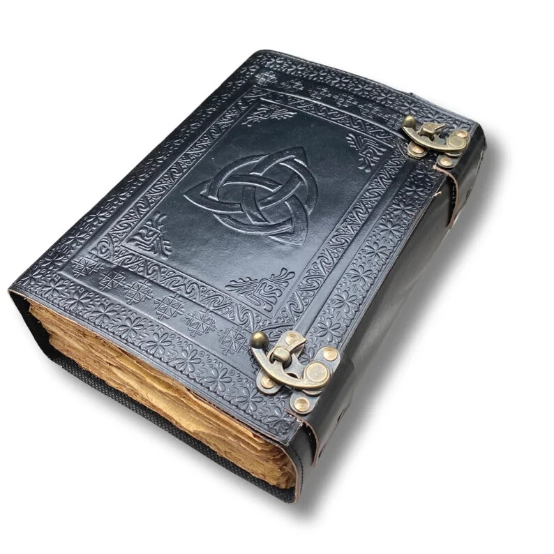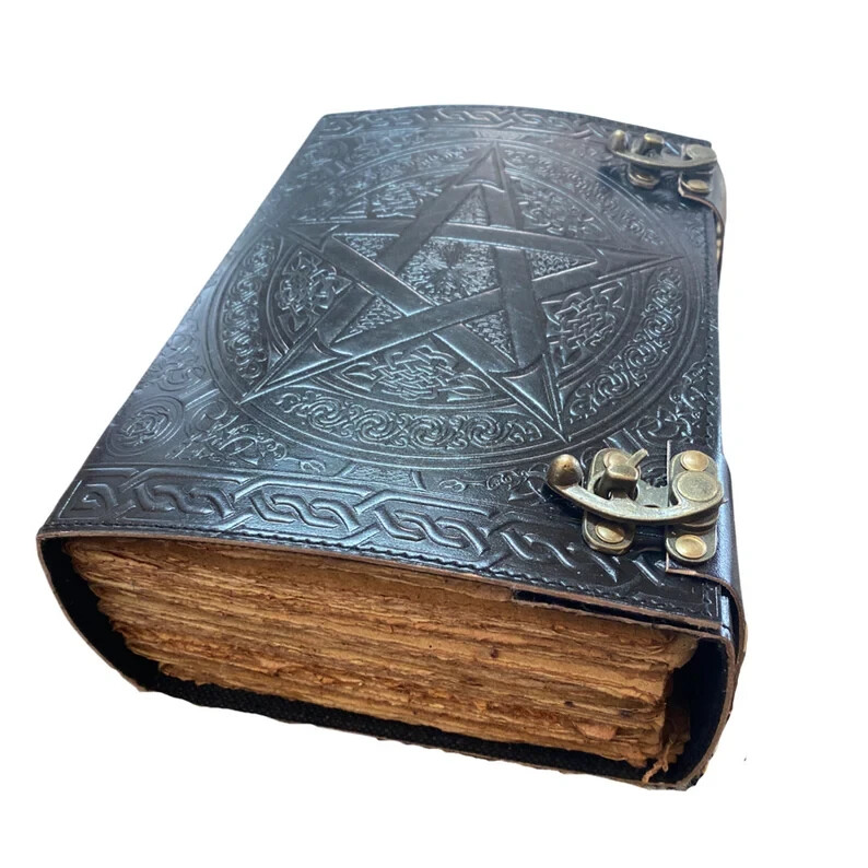 Leather Journal | Pentagram / Triquetra Leather Journal Antique paper- 2 x Brass C Clasps - 10x7in This genuine POROMO leather journal is made for drawing, writing, and travel, and features all the extras you need to stay ahead of your busy life. Whether you’re a mom balancing a family with tons of appointments, a business professional who needs to remember details meetings, or you just want to keep your notes and thoughts collected, the POROMO Leather Journal comes with all the style, comfort, and versatility you need to be at your best. Crafted with high-quality crazy horse leather and boasting a leather strap to keep it neatly secured, this all-purpose journal, planner , diary, and sketchbook is made for writing, drawing, sketching, and recording important information. And it lays flat for easier use, you’ll find that it’s the perfect choice for daily use, traveling, and keeping with you when days get their busiest. Journal Details: Crazy Horse Leather 10" x 7" Size Lay Flat Binding Leather Strap Closure Contains 300 Sheets (Kraft, Lined Paper) Order Includes: Leather Journal Gifts Get this genuine leather journal perfect for keeping track of your appointments, work schedule, and more by clicking ‘Add to Cart’ above now.