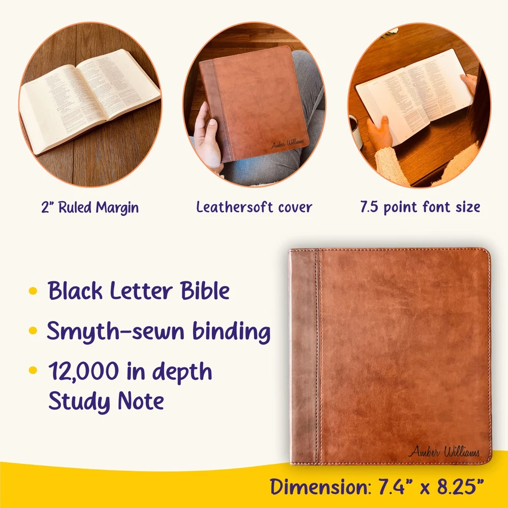 O R D E R ∙ P R O C E S S Make Your Bible a Cherished Treasure: ✨ 1. Enter Your Name: To personalize your order, please enter your full name (e.g., 'Amber Williams') in the personalization box. Note: The Bible cover and color cannot be changed. Need a hand? Message us anytime! :) P R O D U C T ∙ I N F O R M A T I O N ✔️ Engraved & Shipped from the USA ✔️ Perfect for Journaling ✔️ 12,000 Study Notes ✔️ Wide Bible Resources ✔️ Measuring 7.4" Length / 8.25" Width / 2.0 " Thick with a 7.5-point font size. ✨ Personalized English Standard Version Bible. This custom Bible comes with your name engraved on the cover, making it a special Christian gift. Perfect as a personalized Bible for memorable occasions like baptisms. 👍 Celebrate a baptism with this beautifully engraved Bible. The personalized touch and high-quality design make it a cherished keepsake for spiritual milestones. 😍 The ESV Journaling Study Family Bible features extra-large, 2-inch margins perfect for writing observations, prayers, and more as you study God’s Word. More 12,000 study notes adapted from the ESV Study Bible, this journaling Bible also includes nearly 900 special facts, 120 Bible character profiles, ten topical articles, a glossary of key terms, more than 80 maps and illustrations, and 80,000 cross-references. ✔️ A personalized Bible makes the perfect Christian Gifts for women, men, and kids! The Bible is also great for religious gifts or baptism gifts. Receiving an engraved Bible makes a thoughtful gift for a special birthday, life event, or holiday. 🙏 Made with love, delivered with care! Our small, family-owned business takes pride in offering fast, friendly service and high-quality craftsmanship in the USA.