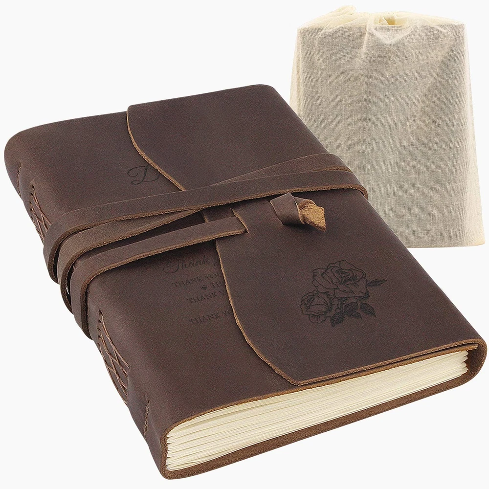 Personalized Handmade Vintage Leather Journal/Notebook A Beautiful Handicraft That Will Last A Lifetime The RUSTIC LEATHER NOTEBOOK is an ideal writing companion for diary lovers, writers, and anyone with a taste for things with an antique or vintage feel. HANDMADE WITH TRADITIONAL CRAFTSMANSHIP -capture and share your ideas, then fly away. include ✔Leather Journal - not refillable ✔ 100% Handmade Crazy Horse Leather - Soft and full of natural flavor ✔ Engraving UniqueText Design - Reminder of daily love, a treasure for life ✔ Hand-cut - Each is a unique artwork ✔ 280 Pages of100 Gsm Cotton Paper - No bleeding ✔ Leather StrapClosure - Protect privacy ✔ Cotton Gift Bag - environmentally friendly and easy to carry Perfectly Meet Your Daily Writing And Drawing Needs Features include a unique leather bound cover and wonderfully creamy, textured 7x5 inch sheets without lines. Prevents any ink bleeding through to make writing a joy. High-Quality Genuine Leather The superior leather cover is deliciously soft and supple, with a naturally inviting texture. Perfect Travel Companion The thick pages of our leather travel diary provide an unparalleled experience to record your thoughts or sketches during your travels. Unique Journal Gifts Ideal for writers, travelers, graduates, friends, or anyone who loves writing and taking notes. Whether you’re logging your life or jotting everyday things down, you’ll always get lots of compliments on it! Whether for a birthday, anniversary, or graduation, a personalized leather journal makes a wonderful present. Easy to care Slightly wipe dry with a tissue, or rub in circular motions to reduce scratches. Buy With Total Peace of Mind! Click add to cart ❶ BEAUTIFUL CRAFTSMANSHIP + RUSTIC CHARM GIFTS: Leather Journal/Notebook is made from Soft & Supple Brown Water Buffalo Leather with a real leather scent. Rub your markings and they will fade away. Handmade from 100% genuine leather, our journals can vary in appearance and shadows, producing a unique item, no two are ever the same - special souvenirs of thoughts and ideas. ❷ ADVANCED LASER ENGRAVING TECHNOLOGY + WARM LOVE REMINDER: Personalized Antique Writing Journal cover is engraved with stunning and meaningful graphics and text designs. Leather notebook is a perfect Graduation, Anniversary, Birthday, Mothers’ Day, Women's Day, Thanksgiving, Easter, Christmas gift for yourself, family, and friends. It is a truly exquisite & unique, commemorative & practical present for MOTHER/MOM. Help record 365 daily life. Hurry up and customize a book for him/her! ❸ ECO-FRIENDLY DAWLIN PAPER + DETAIL DESIGN: 140 sheets / 280 pages of featured unlined blank cream-colored paper, hand-crafted with recycled cotton which is acid-free, tree-free, & environmentally kind! NO BLEEDING -any pen can be used on this thick paper, weighing 100g. A leather wrap-around strap that effectively keeps your journal closed and acts as a handy bookmark. Hand-stitched Crazy Horse Leather binding firmly fixes the page while adding to the vintage charm of our timeless journals. ❹ PERFECT SIZE + MANY USES: 7x5.3x1.5 inches, easy to handwrite, draw or sketch, and compact for carrying in your bag. Journal for men & women comes beautifully wrapped in an earth-friendly COTTON BAG. Ideal for alternative Artists Sketchbooks, Girls Diaries, Travel, Watercolor, Youth/Teen Journals, Poetry Work, Journalists, Guestbook, Food Planner, Scrapbook, and Bible Diaries. ❺ NO RISK + GIFT WORTHY OF DAILY COLLECTION: If your vintage journal arrives damaged or you find anything faulty with the craftsmanship, please feel free to contact us. Our Service Team will help you solve it in 24 hours. Custom Luxury retro notebook is the best gift for men and women! Leather Journal is a gift that makes people love it!