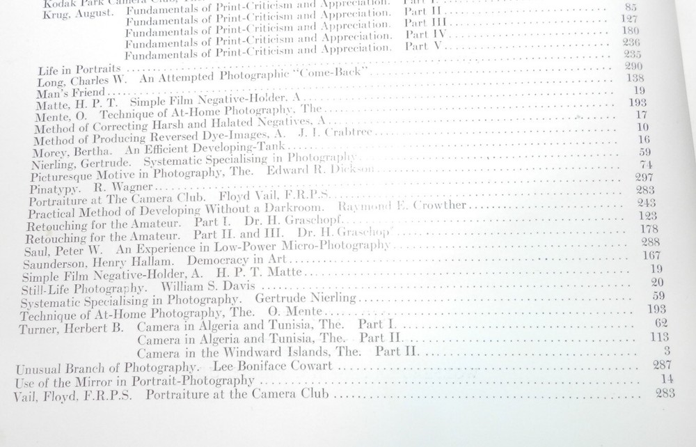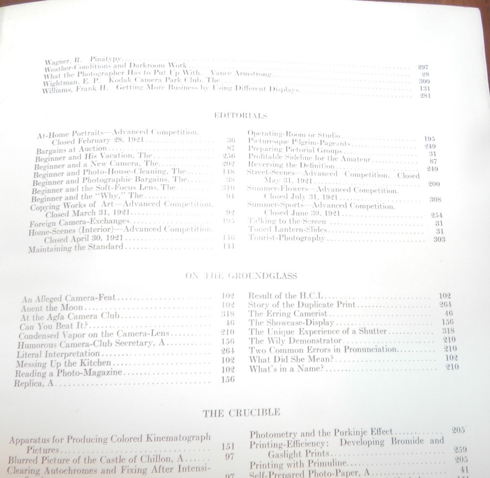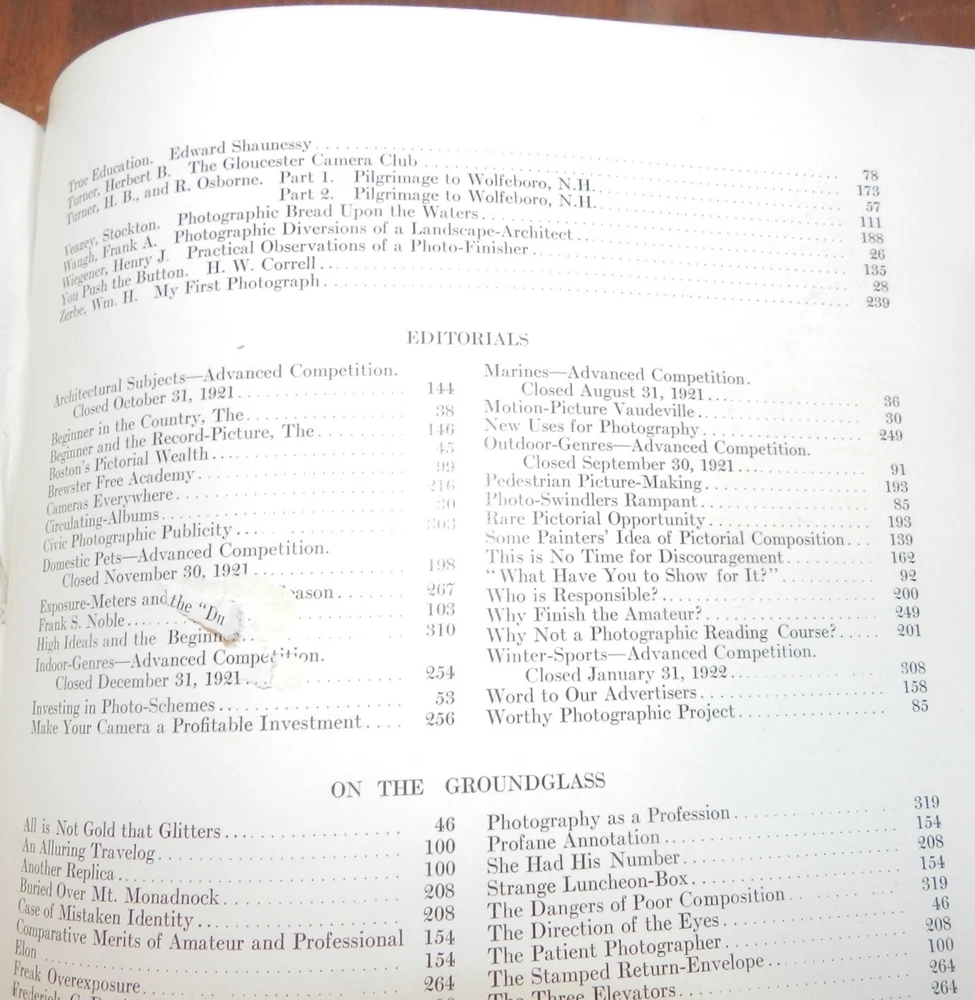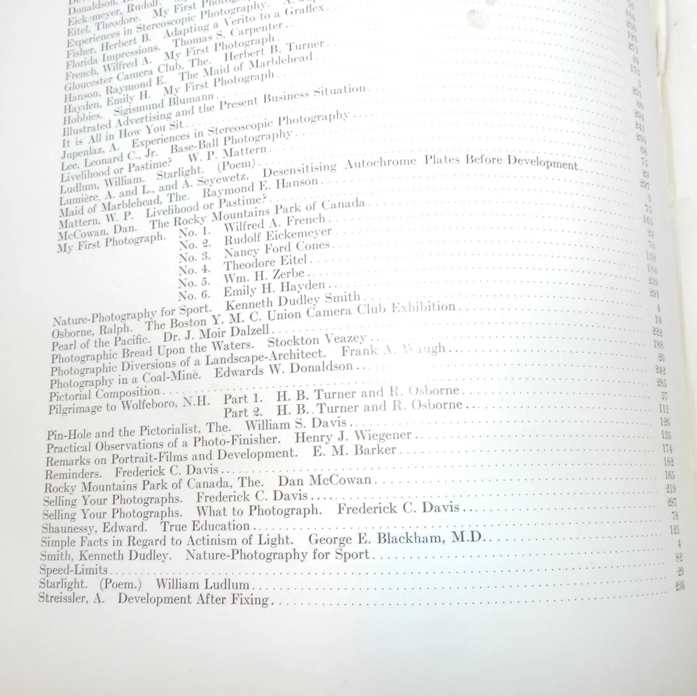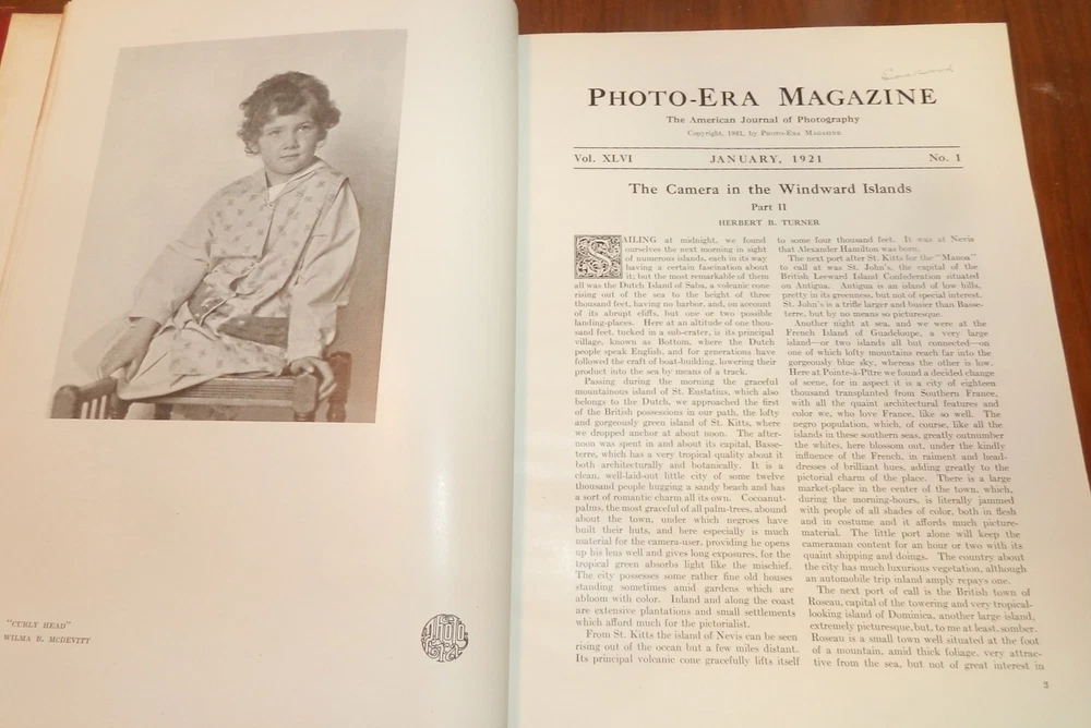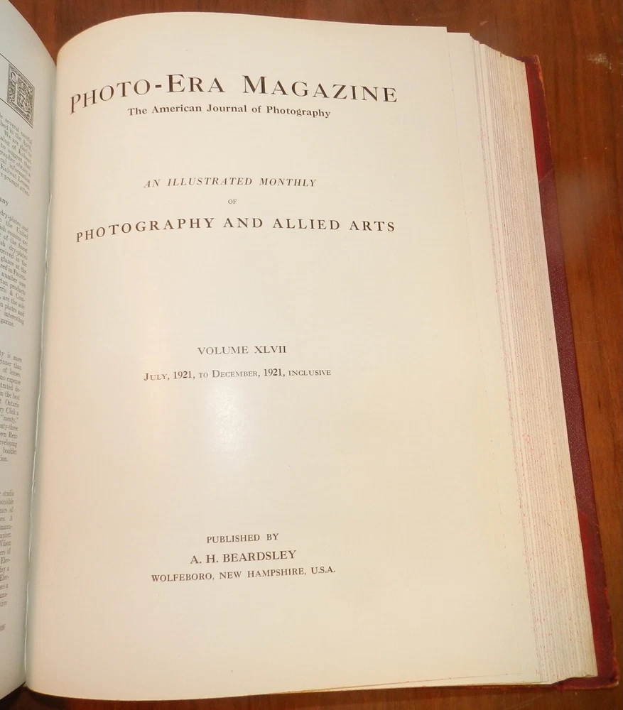 Photo-Era Magazine. The American Journal of Photography V. 46-47, 1921. Bound. Photo-Era Magazine. The American Journal of Photography V. 46-47, 1921. Bound. Photo-Era Magazine The American Journal of Photography An Illustrated Monthly of Photography and Allied Arts Volume XLVI January 1921 to June 1921 AND Volume XLVII July 1921 to December 1921 Two volumes bound together. A. H. Beardsley, Wolfboro, New Hampshire 1921. Hard cover volume. Three-quarter leather over paper-covered boards with gilt spine titles and decorations, quarto, 12 monthly issues, 326 + 324 pages, b&w photographs and photography & camera-related illustrations. Each volume includes the semi-annual Index and 6 monthly bound issues. The original wrappers are not included CONDITION: Very Good+. (Leather on covers is a bit worn at top of spine, moderate edge and corner wear. The Contents are complete, intact with infrequent small spots ) Check our other auctions and store listings for additional unusual items Check our other auctions and store listings for additional unusual items Listing and template services provided by inkFrog