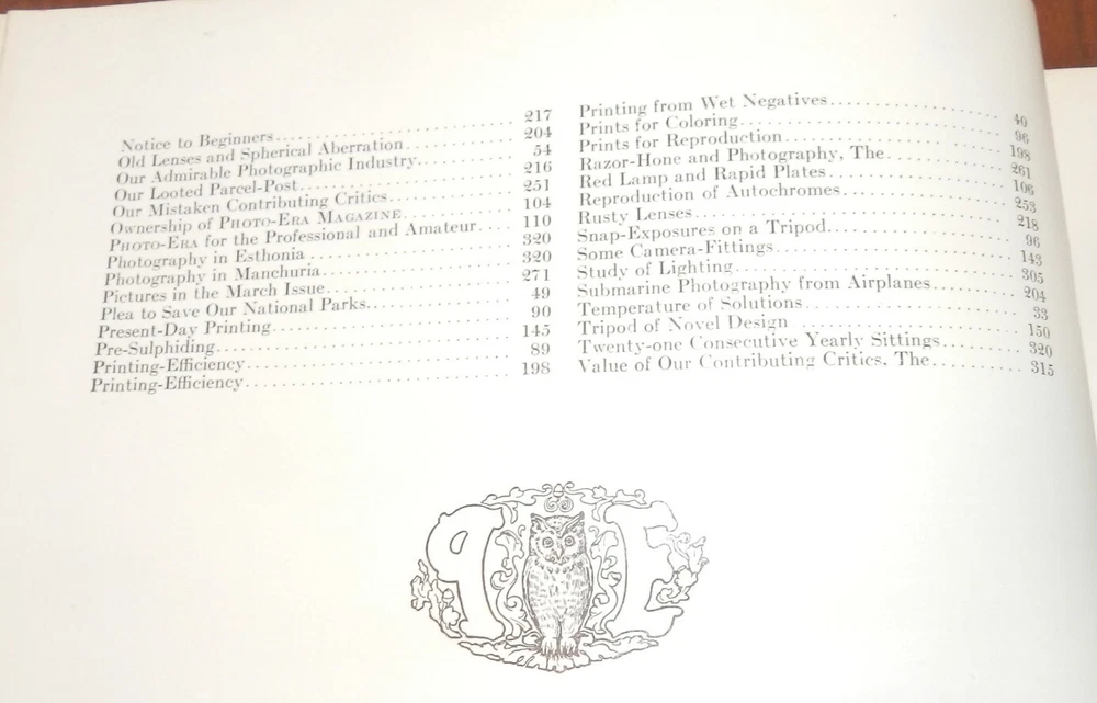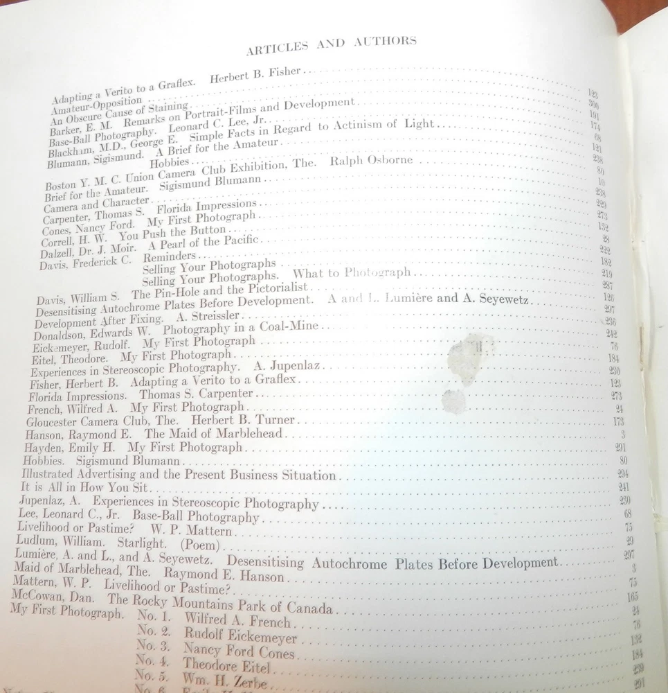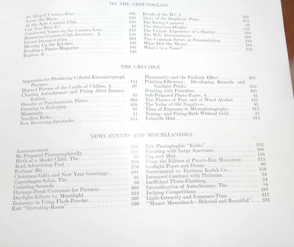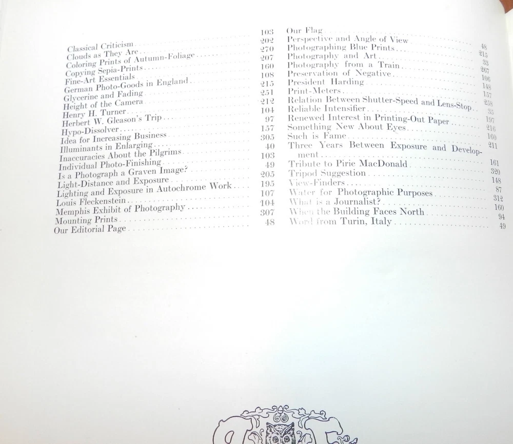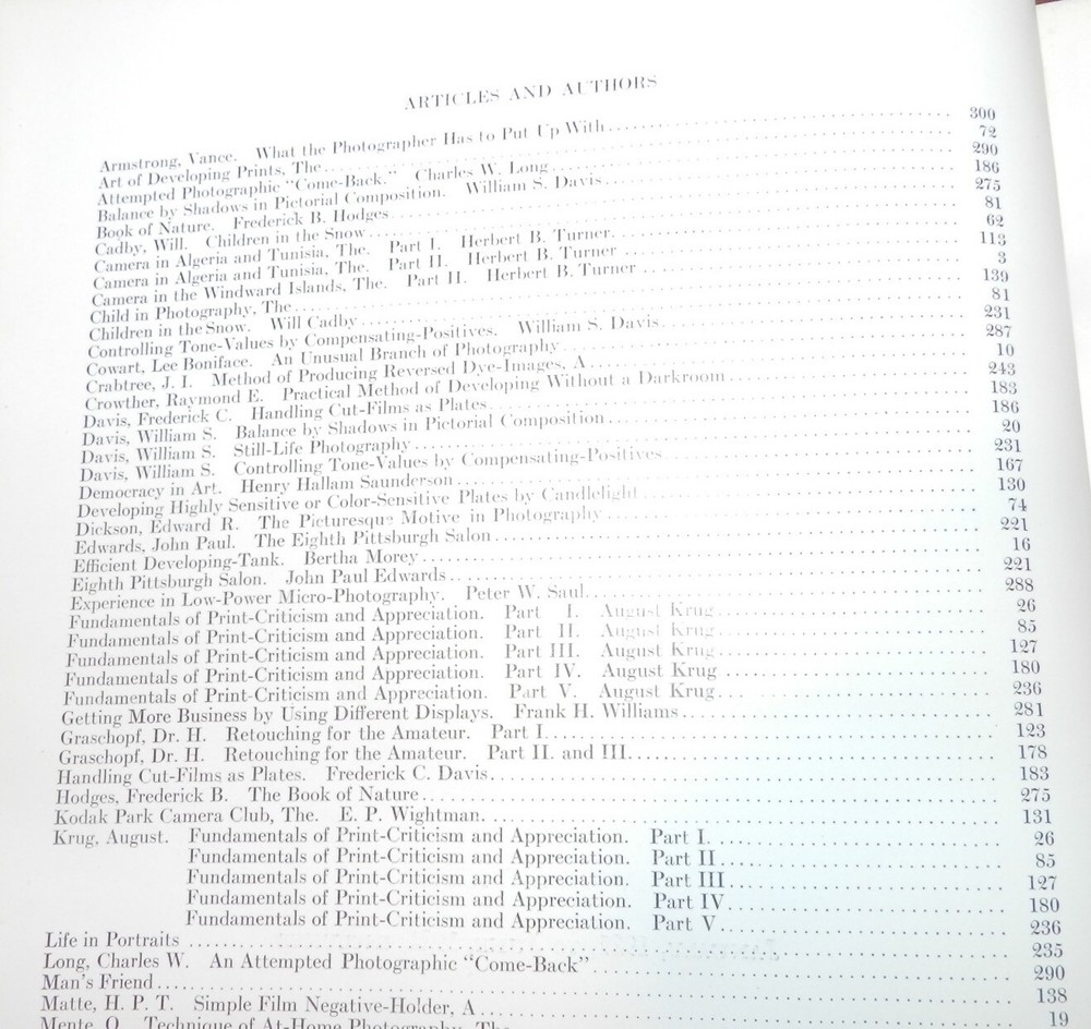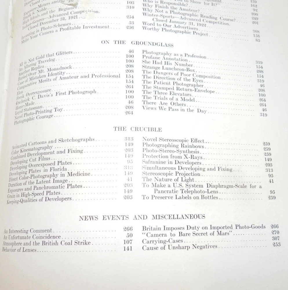 Photo-Era Magazine. The American Journal of Photography V. 46-47, 1921. Bound. Photo-Era Magazine. The American Journal of Photography V. 46-47, 1921. Bound. Photo-Era Magazine The American Journal of Photography An Illustrated Monthly of Photography and Allied Arts Volume XLVI January 1921 to June 1921 AND Volume XLVII July 1921 to December 1921 Two volumes bound together. A. H. Beardsley, Wolfboro, New Hampshire 1921. Hard cover volume. Three-quarter leather over paper-covered boards with gilt spine titles and decorations, quarto, 12 monthly issues, 326 + 324 pages, b&w photographs and photography & camera-related illustrations. Each volume includes the semi-annual Index and 6 monthly bound issues. The original wrappers are not included CONDITION: Very Good+. (Leather on covers is a bit worn at top of spine, moderate edge and corner wear. The Contents are complete, intact with infrequent small spots ) Check our other auctions and store listings for additional unusual items Check our other auctions and store listings for additional unusual items Listing and template services provided by inkFrog