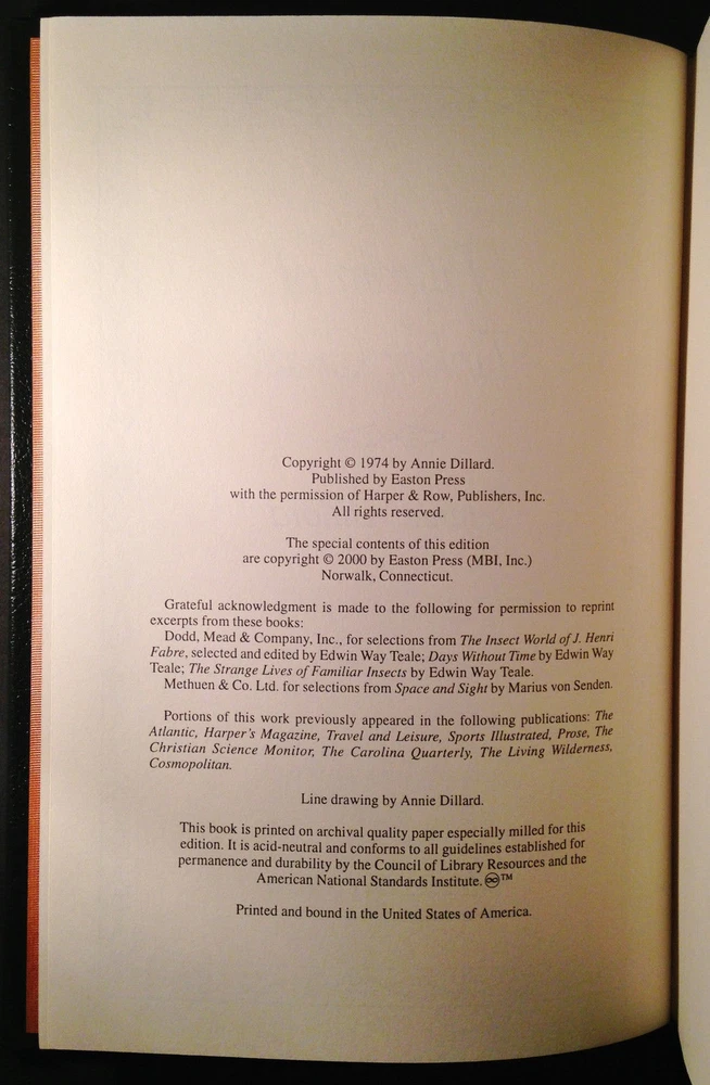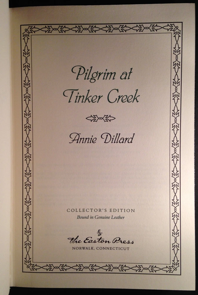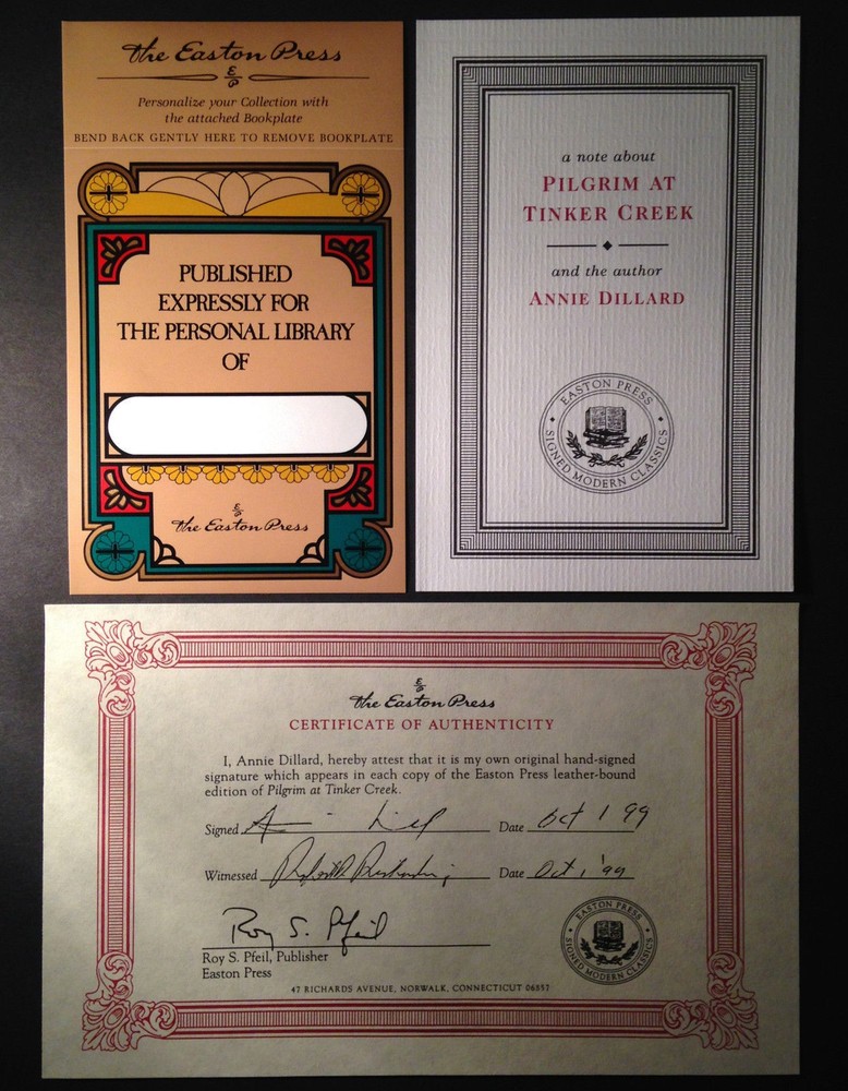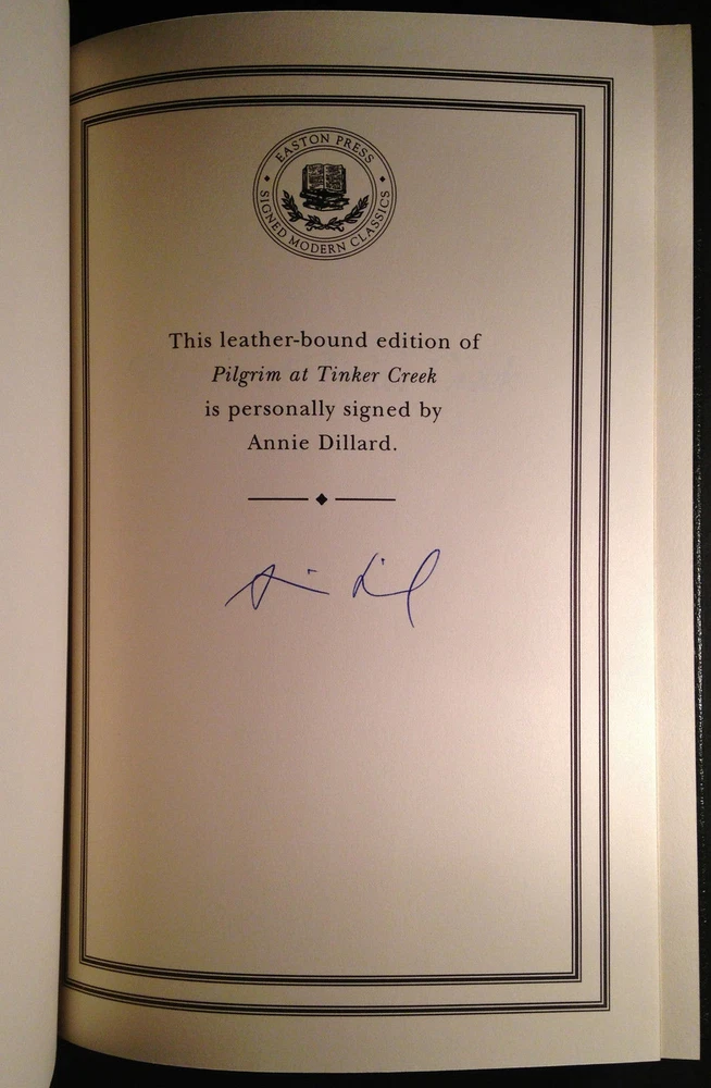 Pilgrim at Tinker Creek, Annie Dillard, Easton Press Signed Modern Classics, COA Pilgrim at Tinker Creek, Annie Dillard, Easton Press Signed Modern Classics, COA Pilgrim at Tinker Creek by Annie Dillard Leather Bound, With Certificate of Authenticity. Part of the SIGNED MODERN CLASSICS collection of The Easton Press, Norwalk Connecticut, 2000. This book is in excellent condition. The Easton Press books are bound in genuine leather binding, with 22kt gold accents and hubbed spines, gilded page ends, acid-neutral paper, Moire fabric endsheets, and evocative illustrations and decorations. We will be happy to combine shipping, wherever possible. Some items cannot be combined because of their size, weight or because they are fragile. Please ask if you have any questions. Your order will ship by the next business day after receiving payment. All items are from a smoke-free environment. Thank you, and Happy Reading!