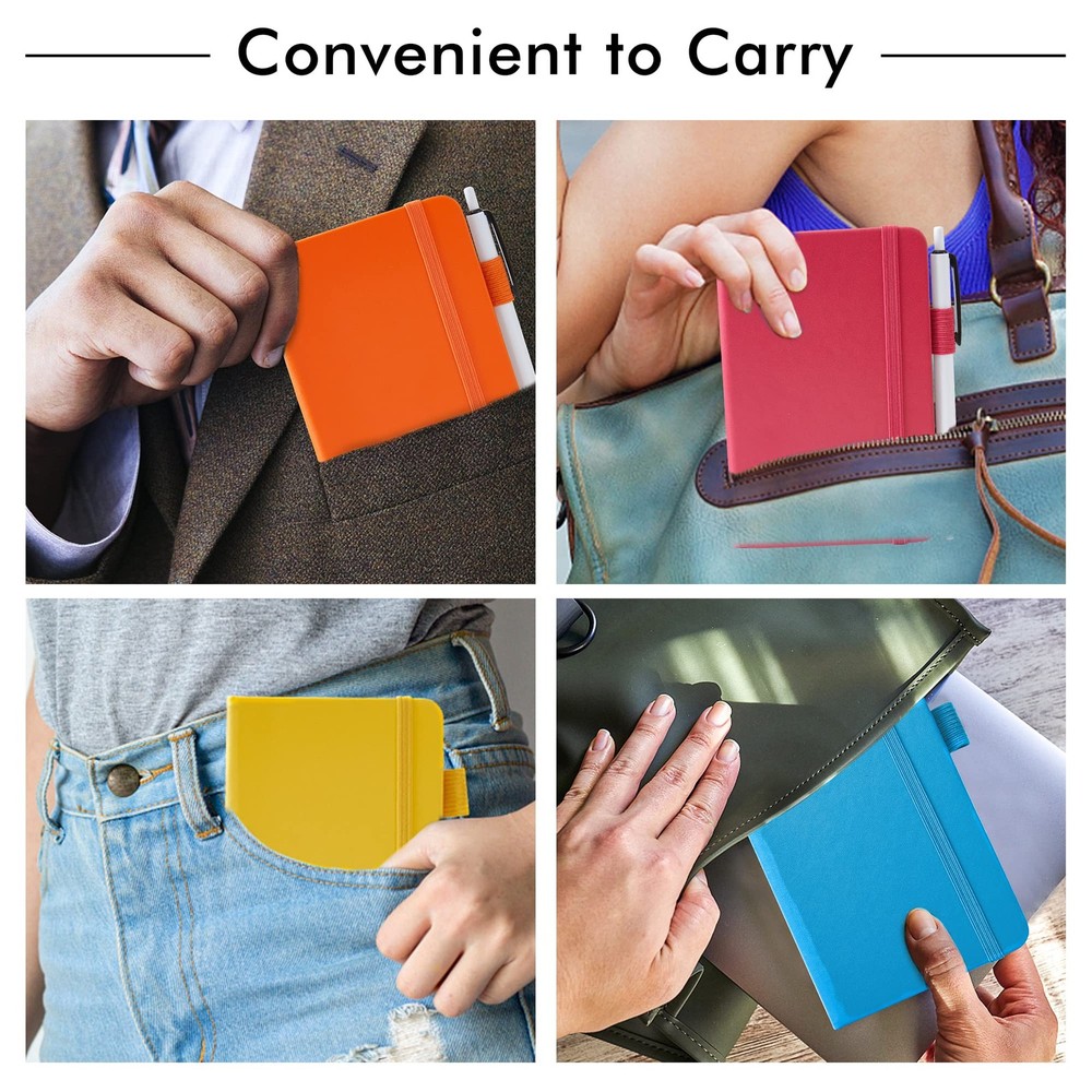 Absolutely love these mini notebooks! The hardcover feels sturdy, and the college-ruled pages are perfect for notes. The included pens fit snugly in the holder, making them super handy for school or work. Compact size fits easily in pockets or bags, and the solid colors look sleek. Great value for the price—highly recommend!