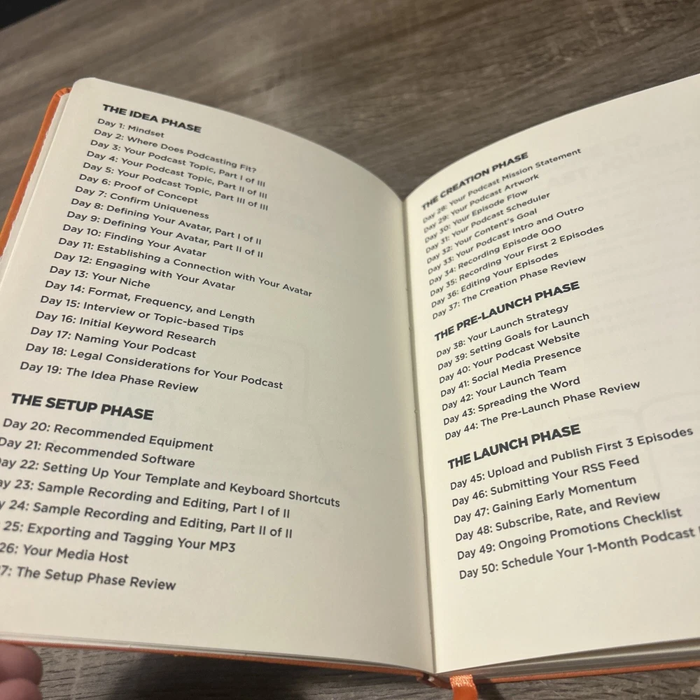 Podcast Journal: Idea to Launch in 50 Days is a 2018 leather textbook by John Lee Dumas. It focuses on education in the subject area of podcasting, targeted at adult learners. The book is in English and published by Entrepreneuronfire, offering a comprehensive guide for individuals interested in starting a podcast within a 50-day timeline.