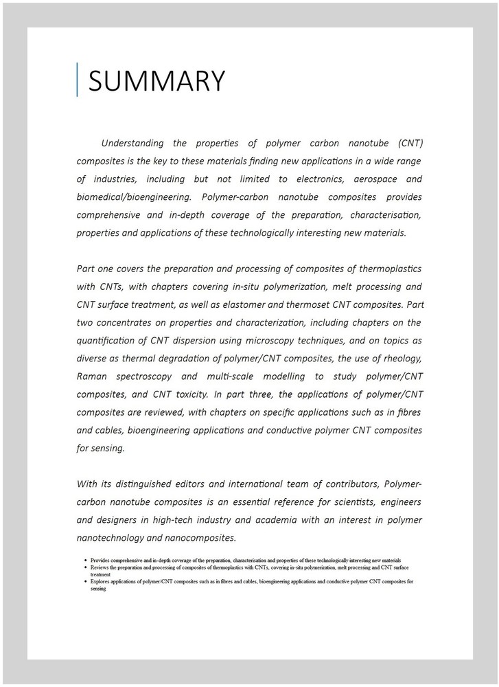 Polymer-carbon Nanotube Composites : Preparation, Properties and Applications, Paperback by Mcnally, Tony (EDT); Pötschke, Petra (EDT), ISBN 0081017278, ISBN-13 9780081017272, Brand New, Free shipping in the US Understanding the properties of polymer carbon nanotube (CNT) composites is the key to these materials finding new applications in a wide range of industries, including but not limited to electronics, aerospace and biomedical/bioengineering. Polymer-carbon nanotube composites provides comprehensive and in-depth coverage of the preparation, characterisation, properties and applications of these technologically interesting new one covers the preparation and processing of composites of thermoplastics with CNTs, with chapters covering in-situ polymerization, melt processing and CNT surface treatment, as well as elastomer and thermoset CNT composites. Part two concentrates on properties and characterization, including chapters on the quantification of CNT dispersion using microscopy techniques, and on topics as diverse as thermal degradation of polymer/CNT composites, the use of rheology, Raman spectroscopy and multi-scale modelling to study polymer/CNT composites, and CNT toxicity. In part three, the applications of polymer/CNT composites are reviewed, with chapters on specific applications such as in fibres and cables, bioengineering applications and conductive polymer CNT composites for its distinguished editors and international team of contributors, Polymer-carbon nanotube composites is an essential reference for scientists, engineers and designers in high-tech industry and academia with an interest in polymer nanotechnology and nanocomposites.
