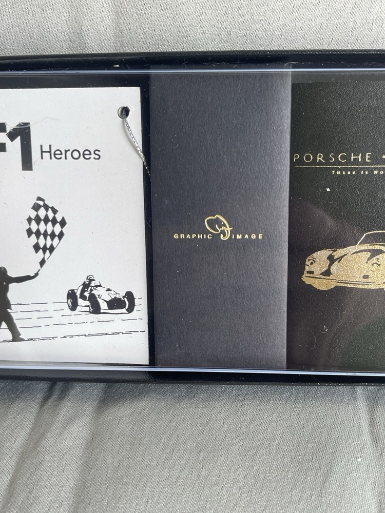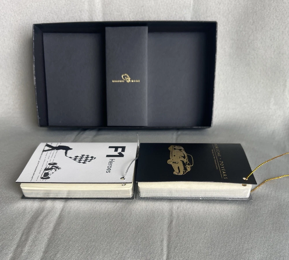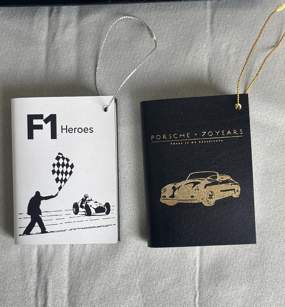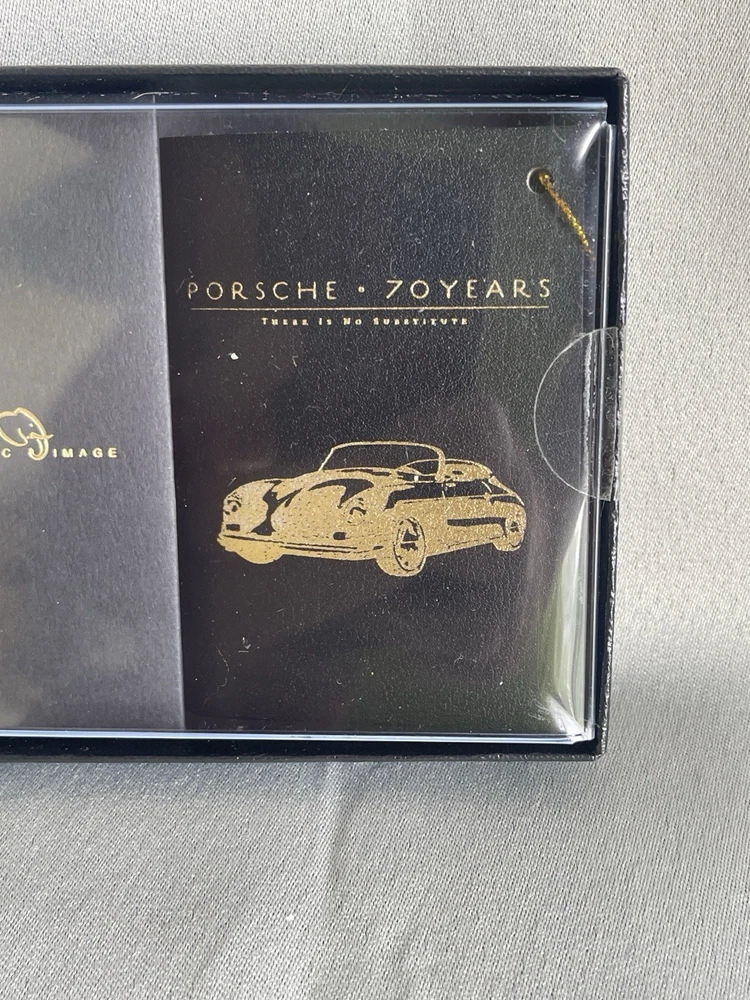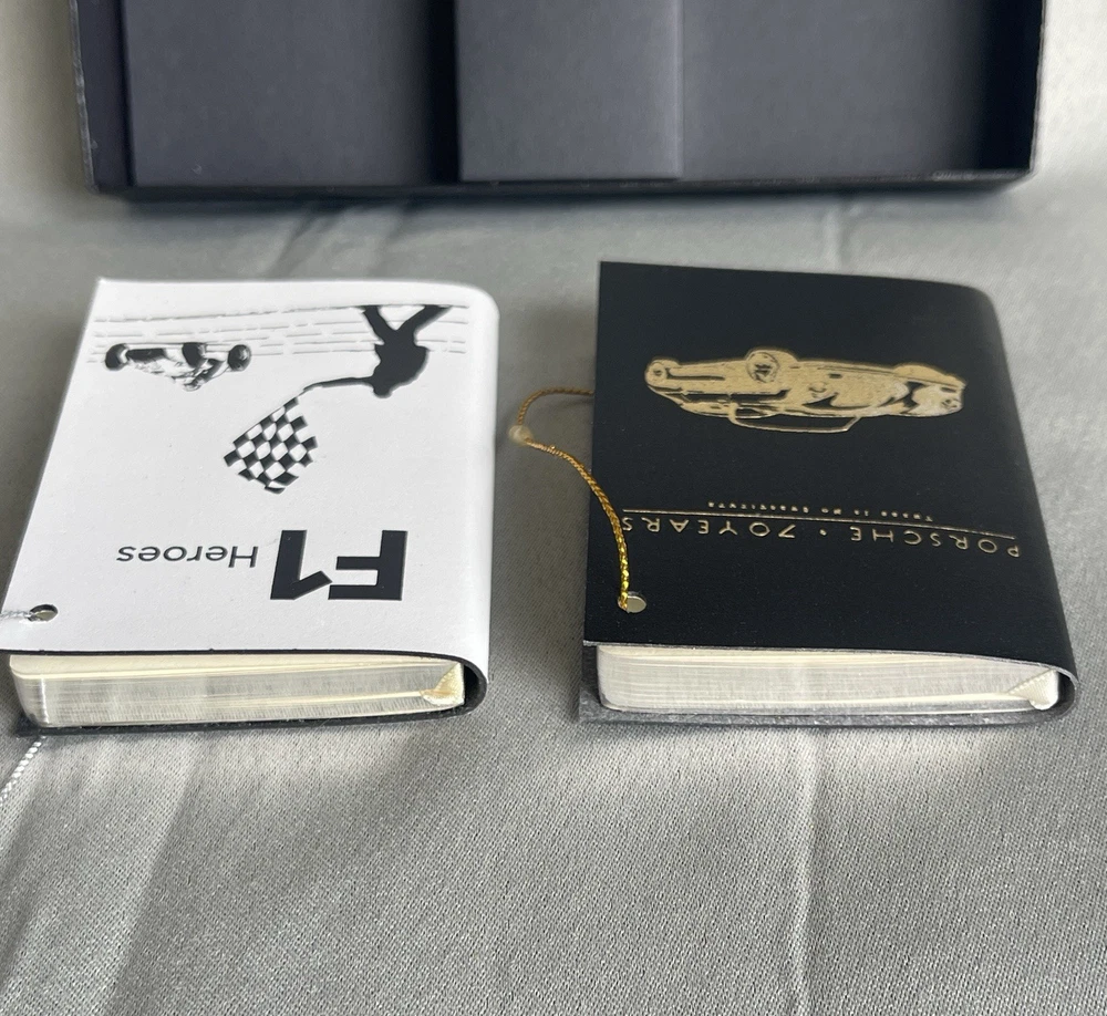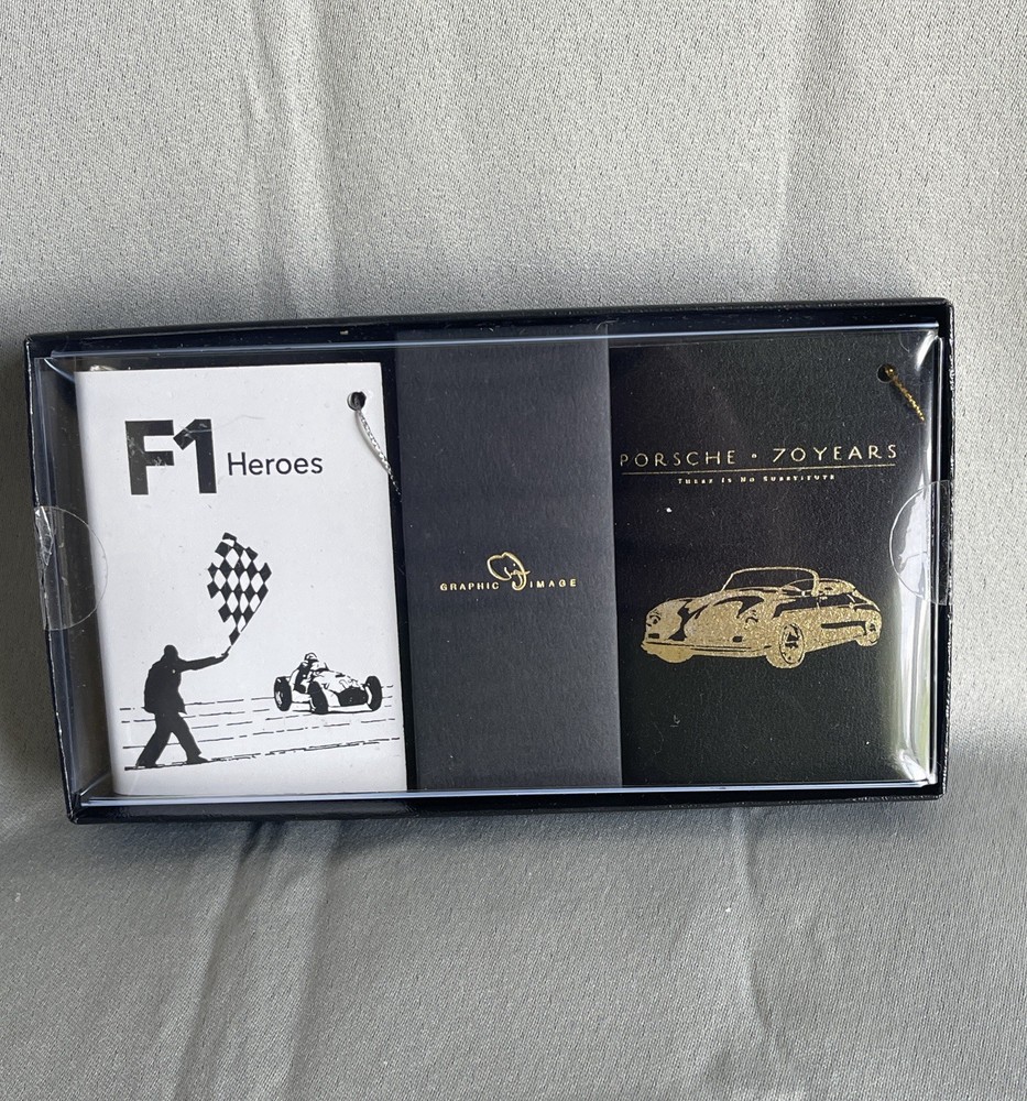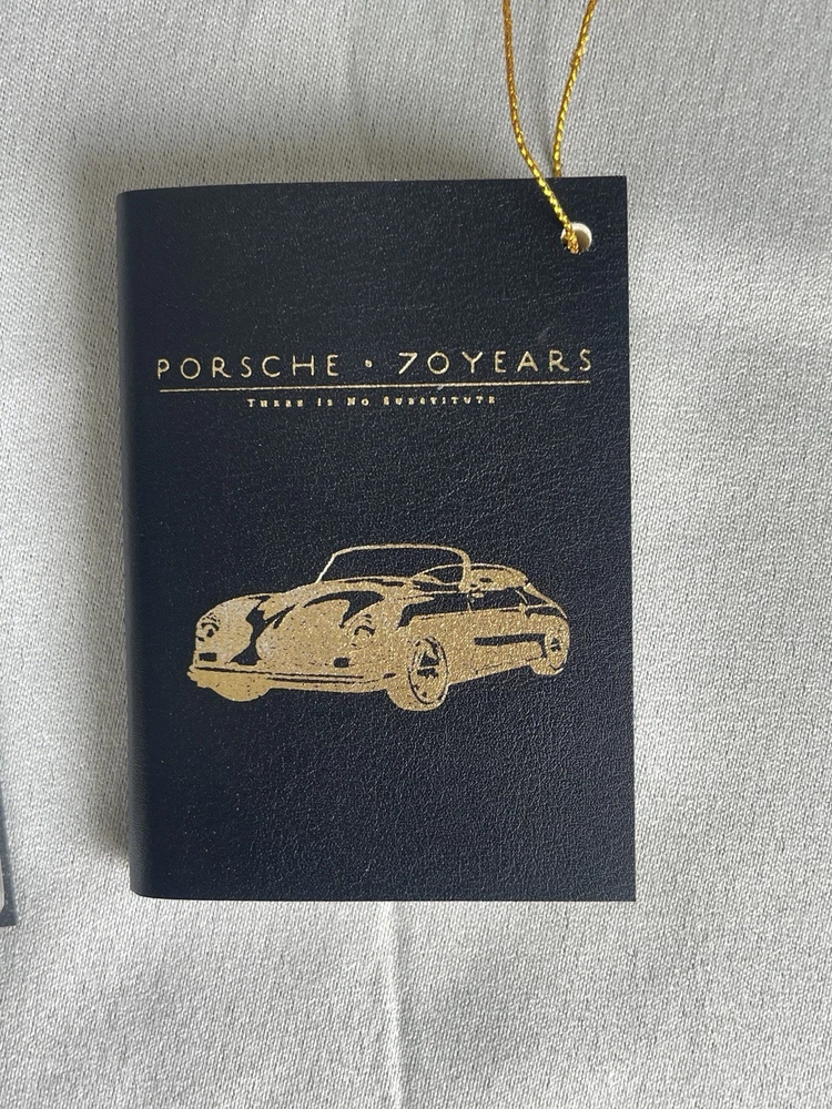 The Porsche 70 Years Set of 2 Mini Leather Bound Journals is a limited edition box set featuring two travel journal ornaments. The set, published in 2018 by Graphic Image, are intended to celebrate the history and general information about Porsche automobiles. The leather-bound format adds a touch of luxury to this collection that would make a perfect gift for any Porsche enthusiast or collector. 83