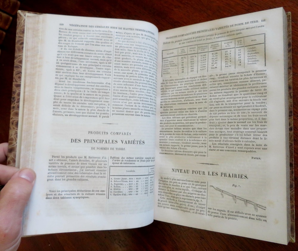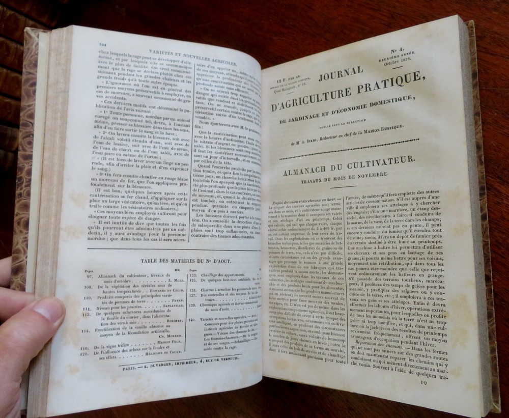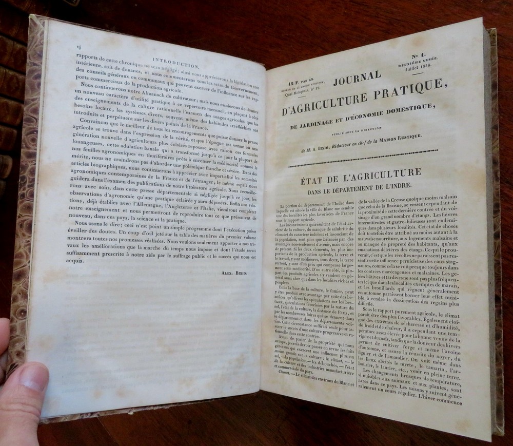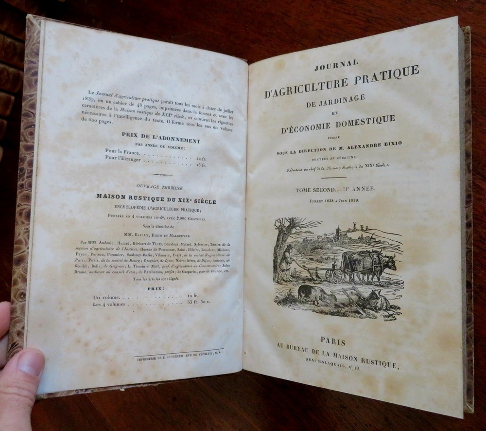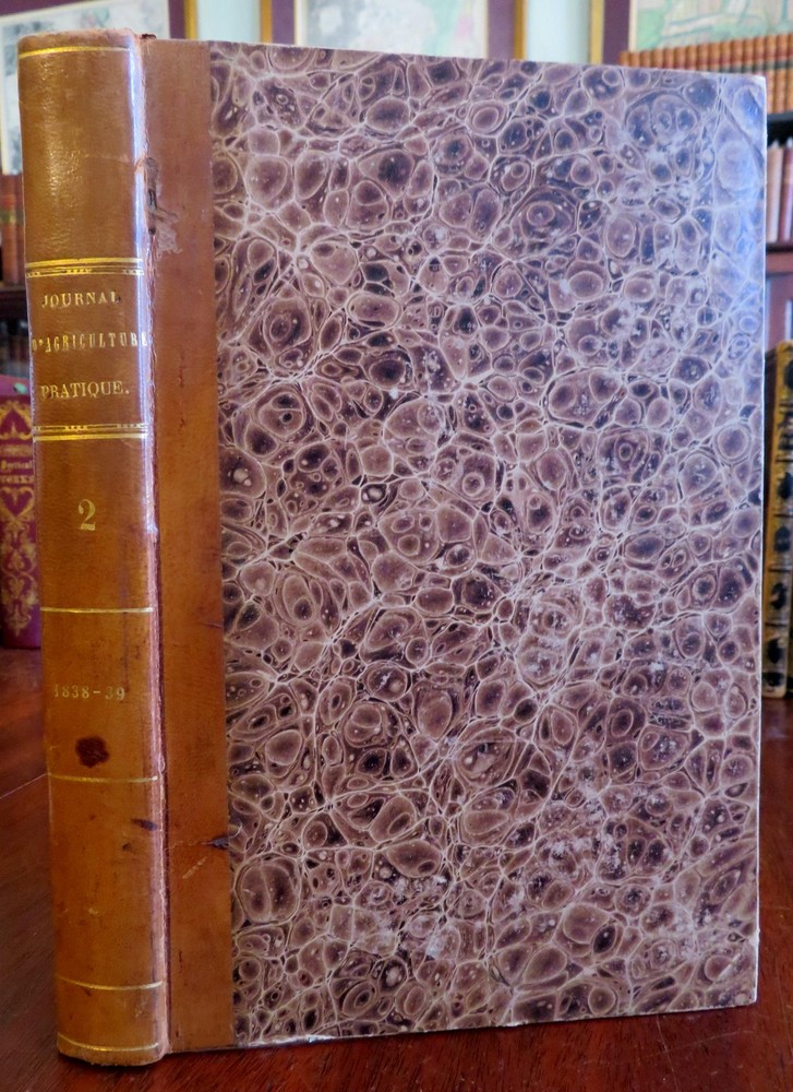 Practical Gardening Journal of Agriculture 1839 French leather book 12 issues Practical Gardening Journal of Agriculture 1839 French leather book 12 issues (Old Books, 19th Century Books, Leather Books, French Books, Agriculture, Gardening). Journal D'Agriculture Pratique De Jardinage et D'Economie Domestique. Published 1839, Paris by Bureau de la Maison Rustique. 576 pages. Text in French. Illustrated throughout with scattered small wood engravings. Second year- called Vol. 2, but complete unto itself and standing alone. Covers 12 months July 1838-June 1839. Attractive antiquarian 1/4 leather binding, smooth spine, gilt bands & title lettering, marbled covers. Book is physically old and shows some signs of handling and time. Binding gently age worn but still appealing, leather and joints slightly rubbed but still supple, remains overall very attractive as an object. Text block paper is gently age toned as typical, internally book remains mostly clean, tight and sound. A book which has been taken care of but may/ does not look like new. Still attractive on the shelf. Book displays a pleasing and unique age patina and is in rather nice antiquarian condition, any age flaws seem easy to overlook or forgive. Please review photos for more detailed attempt to present this book as it survives. We often over-describe any flaws that many sellers would not even bother to mention since most people would overlook them as minor and unworthy of comment. Many people tell us the books they receive from us are nicer in person than they appears on the screen. We want you to be clear about what you are buying, so we take numerous photos and try to describe it openly and honestly. Book Measures c. 10 1/4" H x 6 1/2" W. [B7462].