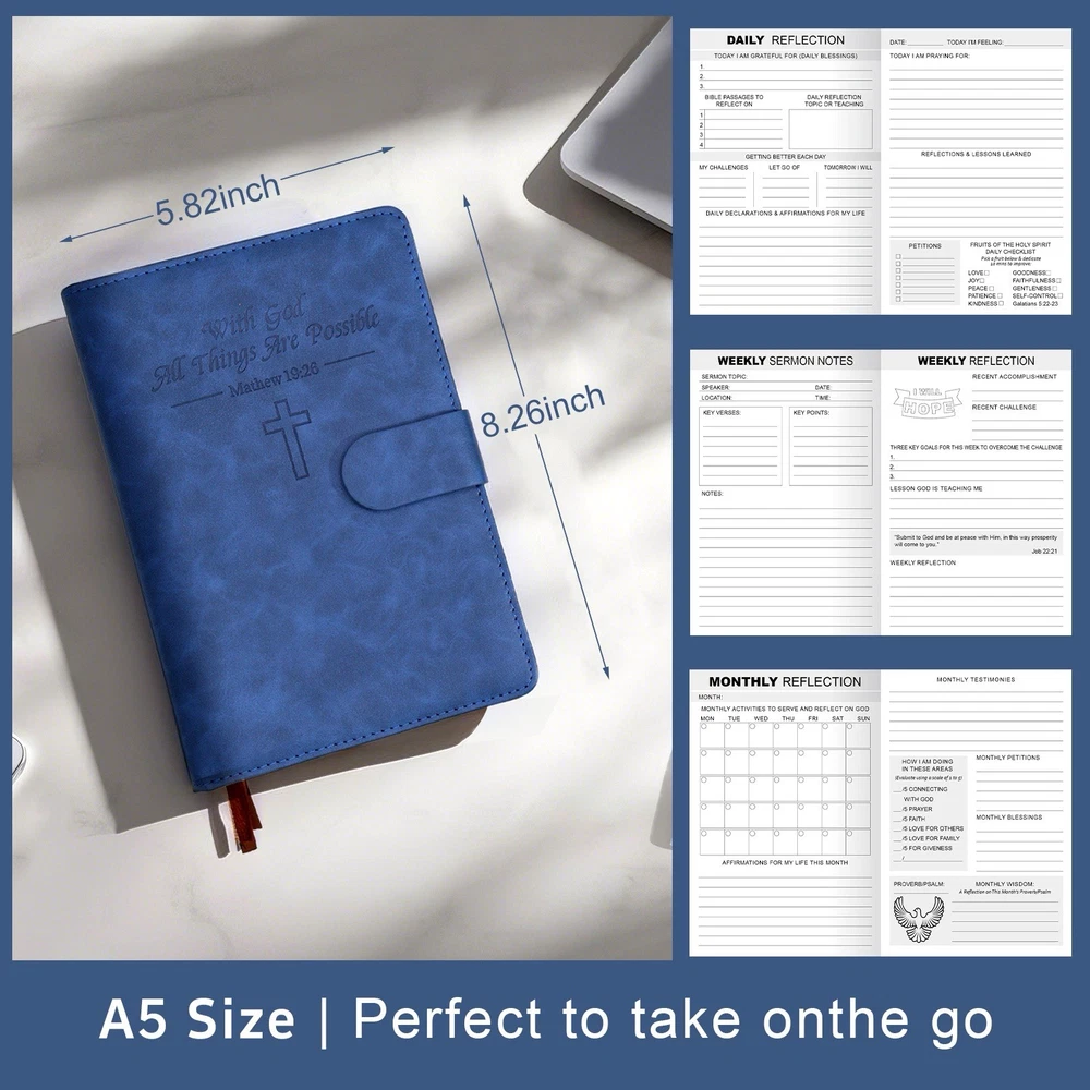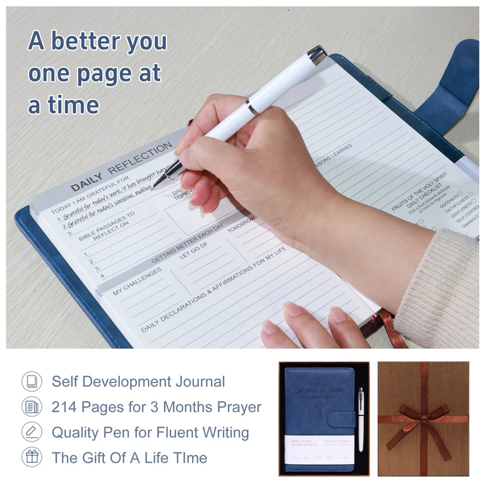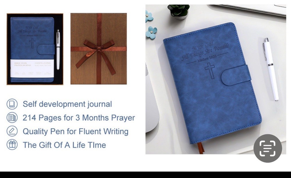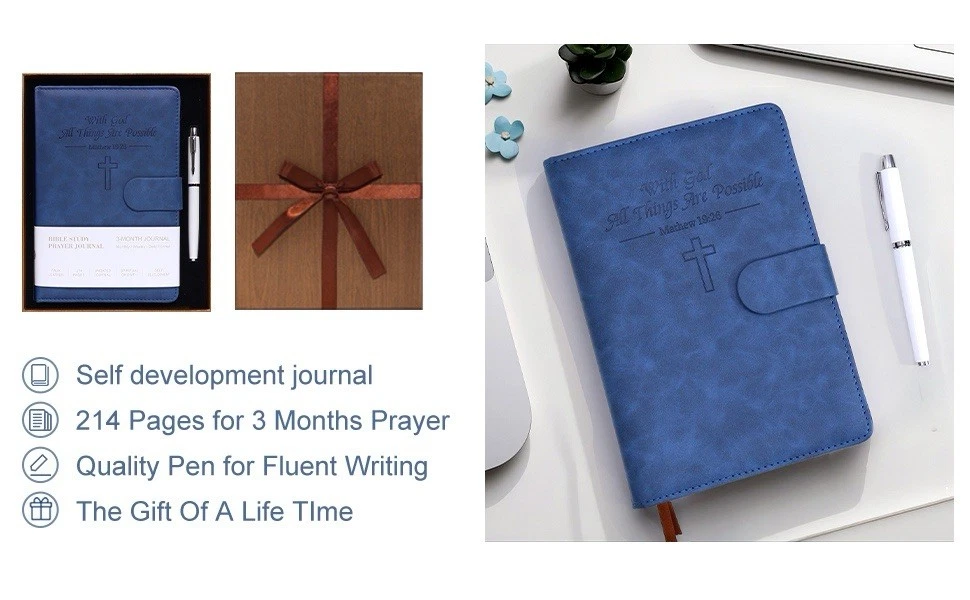 Prayer Journal – A Guided Path to Spiritual Growth & Reflection "With God, All Things Are Possible" – Matthew 19:26 Transform your spiritual journey with the Bible Study Prayer Journal, a beautifully designed 3-month undated journal that serves as a sacred space for deep reflection, scripture study, and personal growth. Whether you’re seeking clarity, strengthening your faith, or cultivating a more meaningful prayer life, this journal is designed to help you stay connected with God every day. 📖 A Thoughtfully Designed Interior for Spiritual Growth ✔️ Scripture Reflection Pages – Dive deeper into God’s Word with dedicated sections to write down key verses, insights, and personal interpretations. ✔️ Daily Prayer & Gratitude Journaling – A space to pour out your heart to God, express gratitude, and document answered prayers. ✔️ Guided Prompts for Spiritual Reflection – Thought-provoking questions to help you explore your faith, set spiritual goals, and find purpose. ✔️ Weekly & Monthly Check-ins – Keep track of your spiritual progress, challenges, and breakthroughs as you grow in faith. ✔️ Plenty of Writing Space – With 214 pages, you’ll have ample room for journaling, doodling, or jotting down revelations during prayer or Bible study. ✔️ Undated & Flexible Format – Use it at your own pace without pressure, making it perfect for any stage of your faith journey. ✨ Features & Benefits for Spiritual Development: ✔️ Elegant Faux Leather Cover – Luxurious, durable, and soft to the touch, embossed with an inspirational Bible verse as a daily reminder of God’s presence. ✔️ Built-in Pen Holder & Secure Magnetic Closure – Thoughtfully designed to keep your journal protected and ready for your next moment of inspiration. ✔️ Designed for Spiritual Growth – Helps you strengthen your faith, track answered prayers, and witness your spiritual transformation over time. ✔️ Perfect Gift for Him or Her – A meaningful and thoughtful gift for birthdays, holidays, Bible study groups, or anyone seeking spiritual renewal. 🎁 A Beautifully Packaged Gift of Faith & Reflection Arrives in a premium wood-textured gift box, elegantly wrapped with a satin ribbon—making it a ready-to-gift item for loved ones. 🌿 More than just a journal—it’s a daily companion for faith, reflection, and spiritual renewal. 🌿 💡 Ideal for: ✔️ Spiritual Growth & Faith Strengthening ✔️ Bible Study & Daily Devotions ✔️ Gratitude & Prayer Journaling ✔️ Church & Group Studies ✔️ Personal Self-Reflection & Healing Your faith deserves to be nurtured. Let this Prayer Journal be your guide to a stronger relationship with God, a renewed sense of peace, and a deeper spiritual connection. 📦 Ships Fast – Order Now & Begin Your Spiritual Journey Today!
