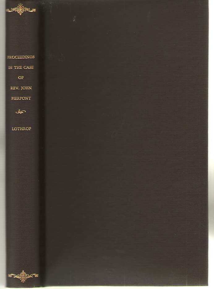 • 26330 Lothrop, Samuel K. Proceedings of an Ecclesiastical Council, in the Case of the Proprietors of Hollis-Street Meeting-House and the Rev. John Pierpont, Their Pastor, Prepared from the Official Journal and Original Documents 1841 The Press of W. W. Clapp & Son , Boston, MA VG /NDAI. This hardcover has been handsomely rebound. The boards are brown cloth with gold lettering on the spine only. New marbled endpapers/free endpapers both front and back. Signed on the second free end paper "O. C. Everett from his friend, John S. Williams, Esq. Feb 1842" . Interesting record of some of the tensions between Rev. John Pierpont and the Unitarian congregation served. Pierpont is better known as a poet and the grandfather of J. P. Morgan. Powered by eBay Turbo Lister The free listing tool. List your items fast and easy and manage your active items.