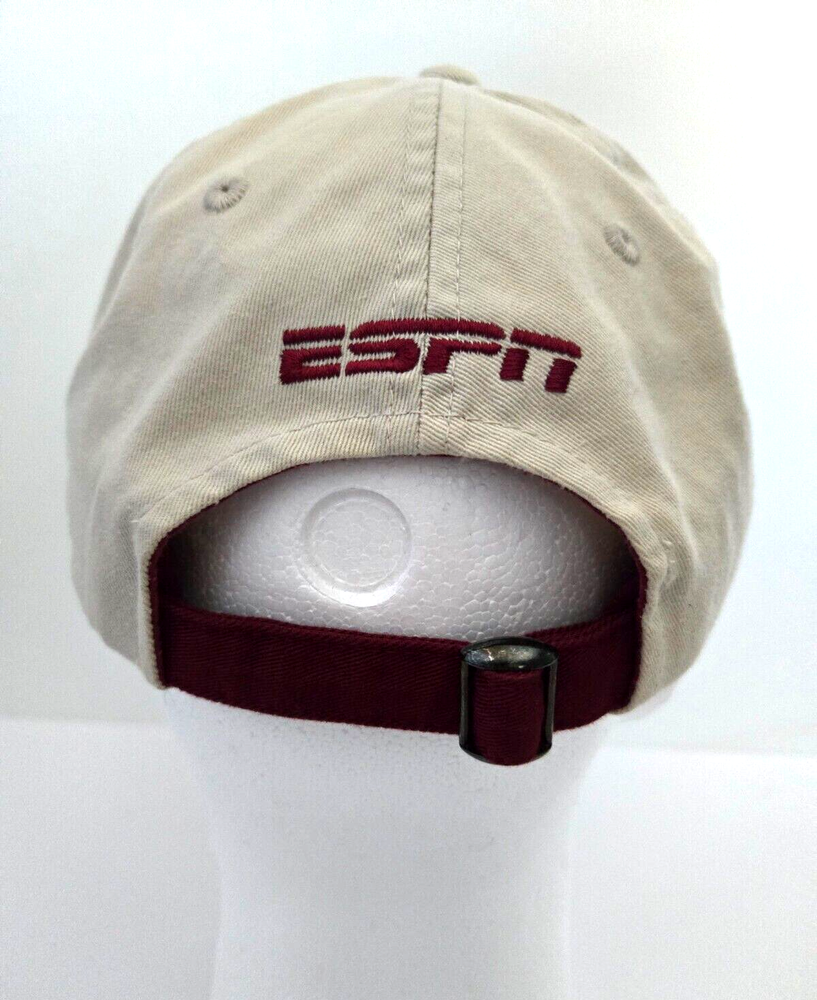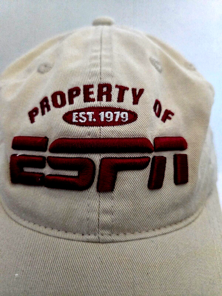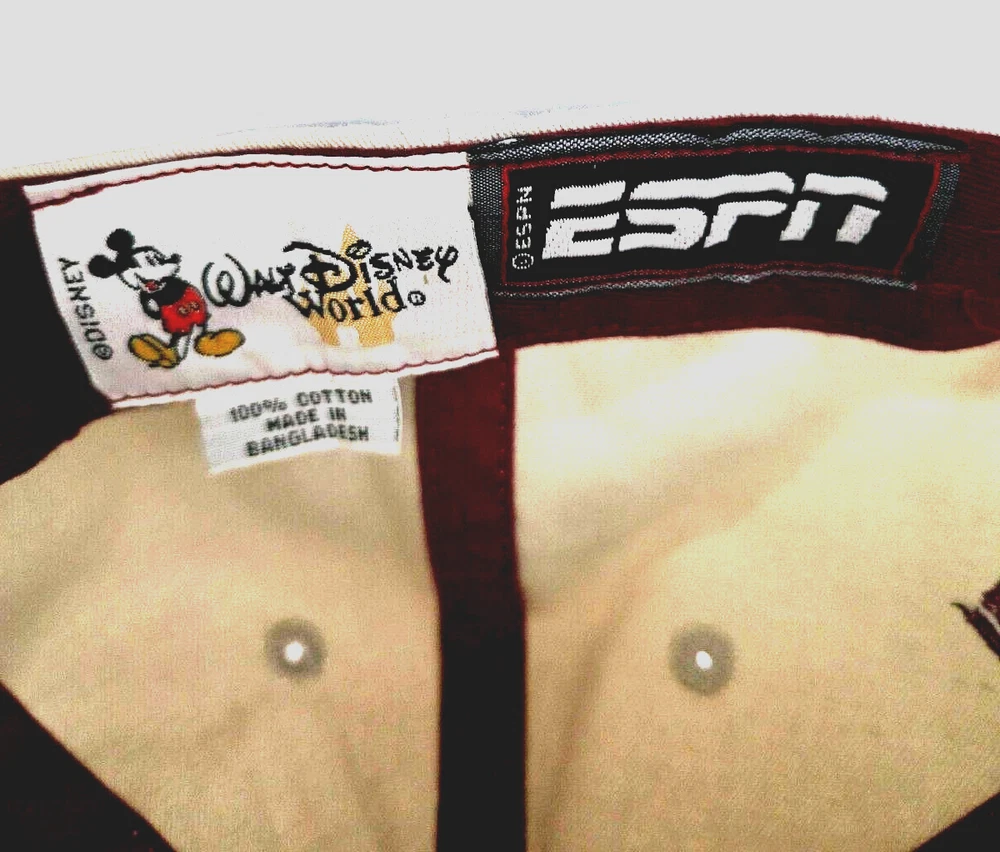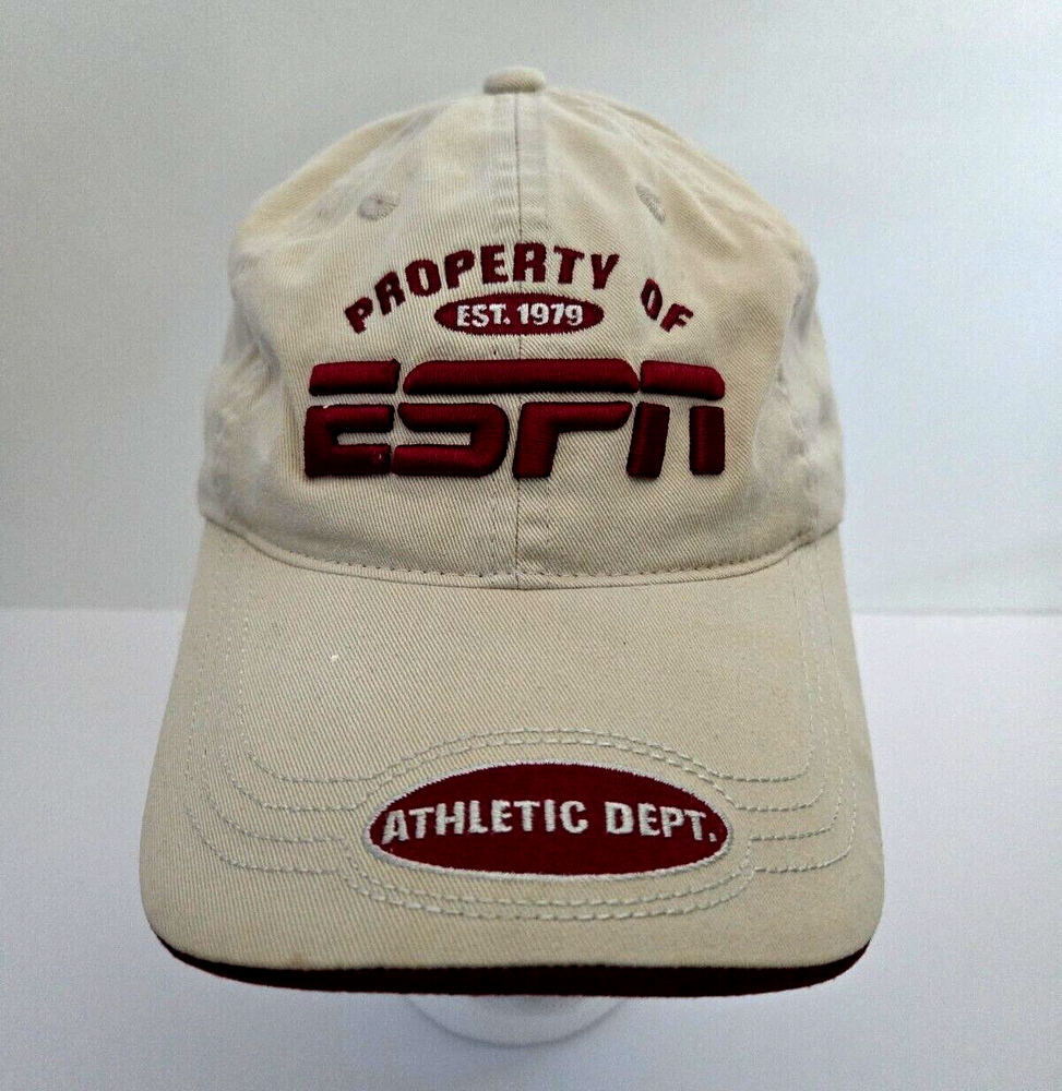 Property of ESPN Athletic Dept Strap back Hat - Walt Disney World This is a beige and maroon strap back hat featuring the "Property of ESPN Athletic Dept" design, with the Walt Disney World logo. It is part of the Disney franchise and suitable for both men and women. The hat is adjustable and was manufactured in Bangladesh. We carefully pack each item to prevent breakage. We only charge what the shipper charges and cannot control the shipping costs. We do not accept returns/refunds unless item is not as described per eBay policy or the item arrives damaged or broken beyond anything noted in the condition field or pictures. If you have any questions about any of our listed items, feel free to email us.