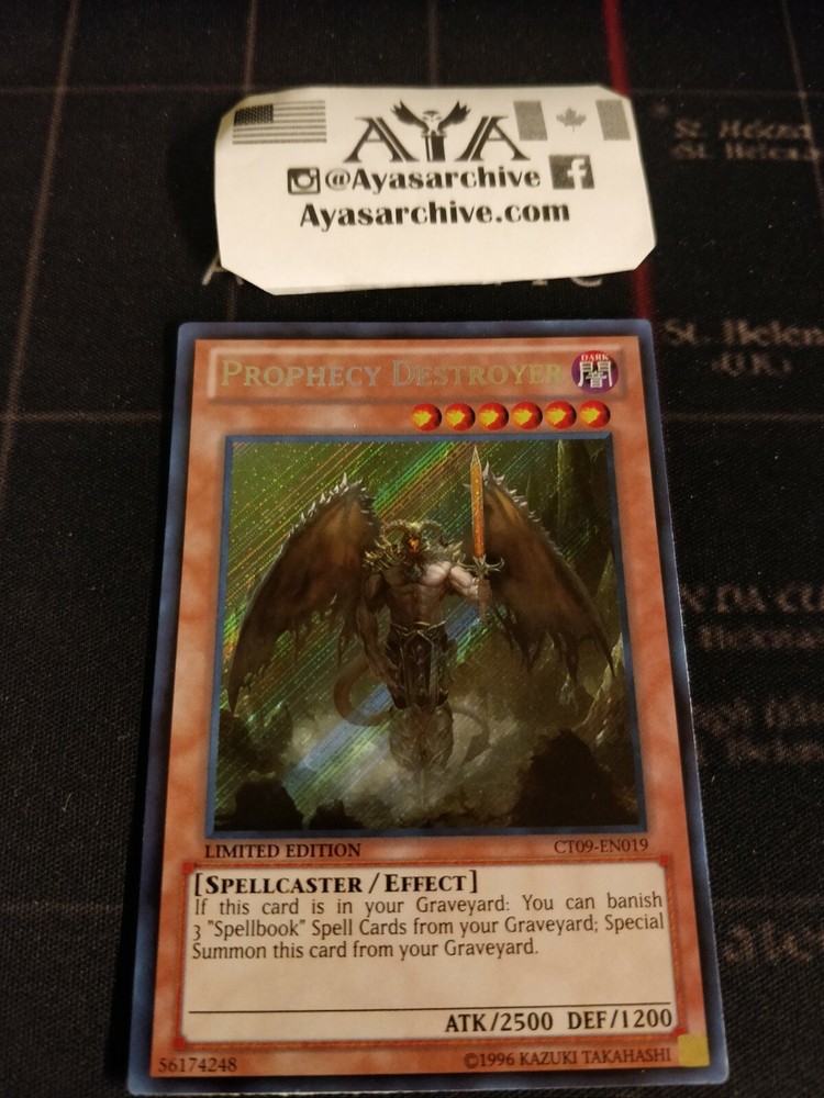 You will receive: 1 x Prophecy Destroyer - CT09-EN019 - Secret Rare - Limited Edition Condition: NM/VLP, English HUGE INVENTORY ON OUR WEBSITE . PLEASE CHECK OUT OUR STORE FRONT FOR MORE INFORMATION. ♠ We have more copies on our website & a large collection of cards (Discounts/Coupons, Rewards and more) SET GUIDE : ALL CARDS ARE = 1ST ED/NM UNLESS DENOTED UNL= UNLIMITED LTD= LIMITED C= COMMON R= RARE SR= SUPER UR= ULTRA SEC= SECRET ULT=ULTIMATE Follow us on our Instagram page & e B A Y Store @ ayasarchive for your daily YGO Eye Candy from our collection. Feedback Feedback is Given , once Feedback is Left . ;) For flash deals, follow our store, and subscribe to our email list. New cards every week. Shipping Shipping within Canada: (3-8 business days) Shipping from Canada to the U S A : (7-15 business days) We treat our cards and shipping process with the utmost importance, every delivery is recorded in our database. Every transaction is monitored. For future reference, if any disputes were to arise, documentation will be provided. These cards are : Shipped within 1 Business day. 100% authentic, tournament legal cards! Near Mint Condition, unless specified. Shipped sleeved and in a toploader! Delivery Delays: Suggested delivery range from eBay is not always accurate. Delays can be caused by many factors which are out of our control ie: Weather, customs, government disruption, strikes ...etc We ship our cards out within 1 business day by dropping them off at the Canadian post office. Thank you for understanding. Guide Mint ( NM/M ): No apparent imperfections; possible light scratches on surface. Has crisp corners, and unblemished edges. Near Mint ( NM) MAY contain very minor imperfection, possible light scratches on surface, 1-2 light blemish on edges of card, if you need please inquire for more photos Near Mint ( NM/VLP) MAY contain some minor imperfection, possible light scratches on surface, light blemish on edges of card Light Play (LP): Light edgewear or corner wear and/or multiple small bends/creases/dents. Moderate Play (MP): Very visible condition issues visible at a casual glance; border wear, corner wear, scratching or scuffing, creases or whitening, minor dirt buildup, water damage, etc. Heavy Play ( HP ): Major/multiple bends, creases, and/or dents throughout card, heavy border wear, tearing. Damaged (DMG) : The card is damaged, please refer to the picture in the listing for the location of the damage. (Even when sleeved, These cards cannot be used in official tournaments .) CANT FIND WHAT YOU'RE LOOKING FOR? Our website has a large selection, included many unlisted cards. If you want it, we may have it. Private message us or DM us on instagram. Much love for choosing AYATCG. Be sure to check out our store for more CARDS & SLEEVES,