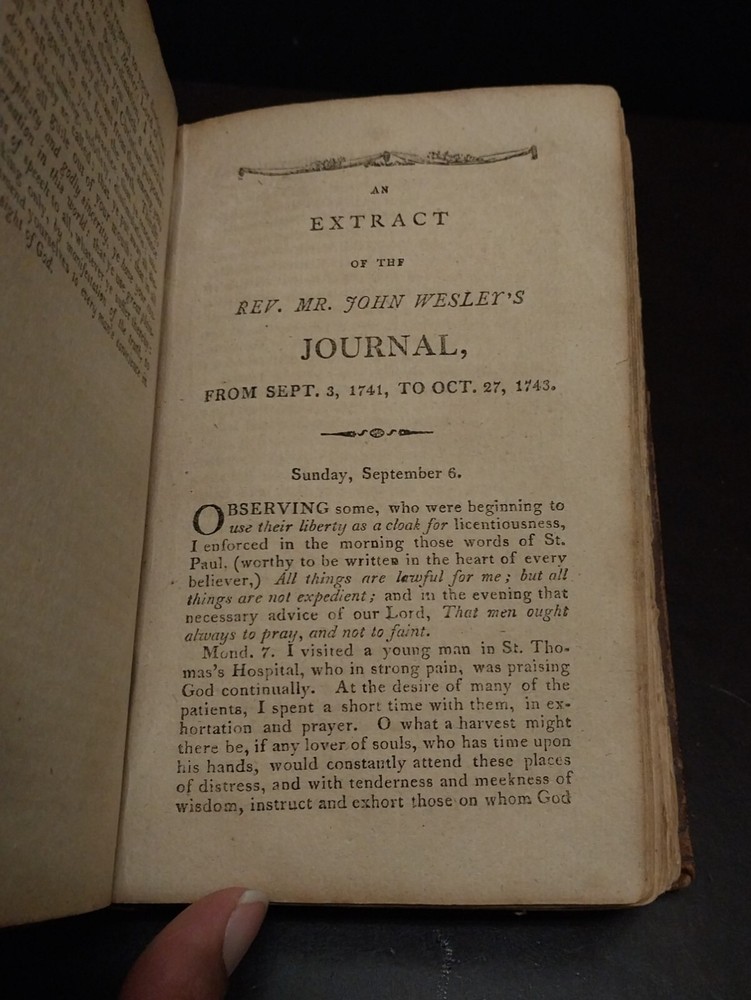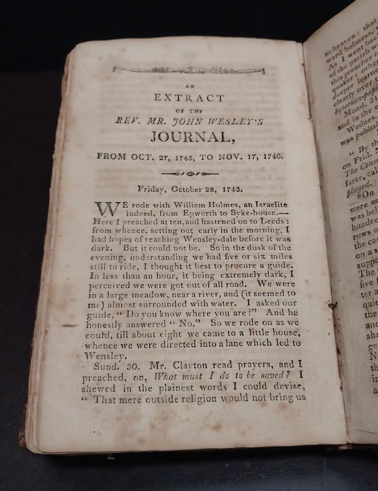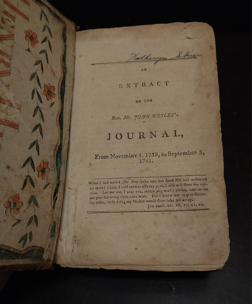 This is a published collection of extracts from the journal of Rev. John Wesley. There is no publication date, but there is an inscription on the back flyleaf that is dated 1822. The first extracts are from November 1, 1939 to September 3, 1741 and the second is from October 27, 1743 to November 17, 1746. There is a German Fraktur inside the front cover. Measures approx. 4.25 in. x 7 in. Tennessee Bible Museum Box 319
