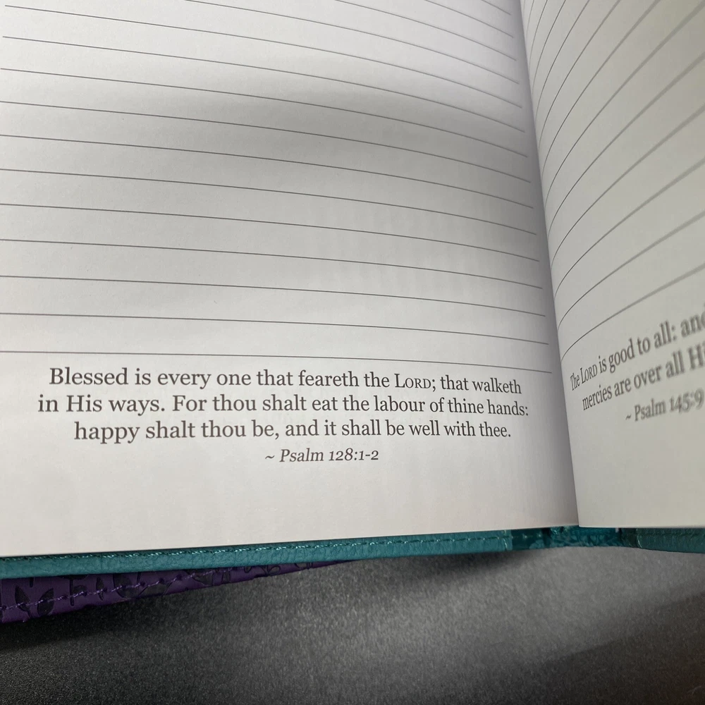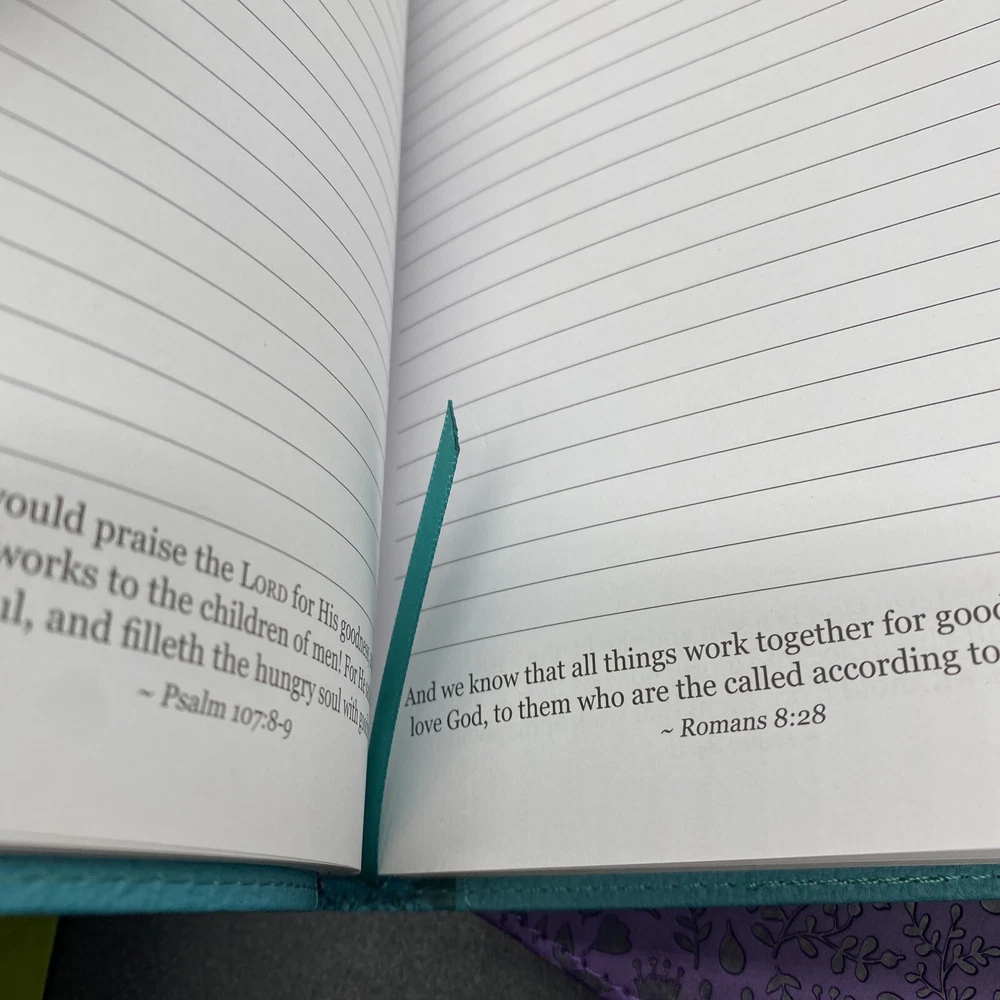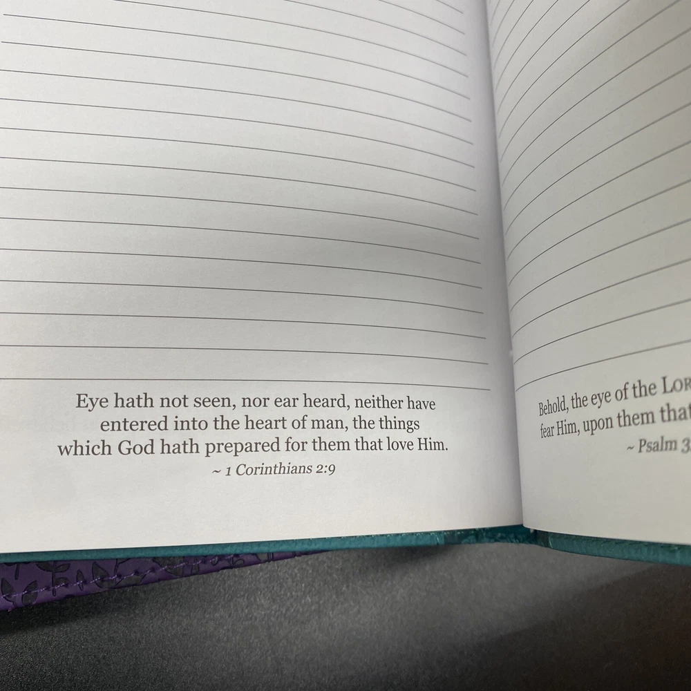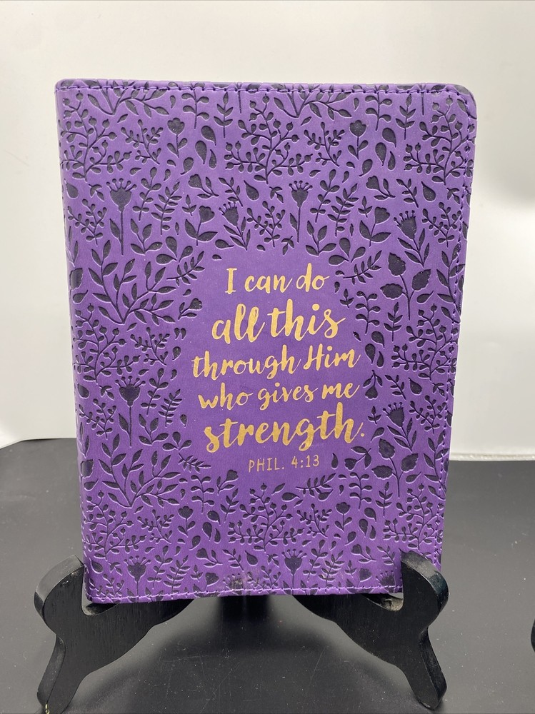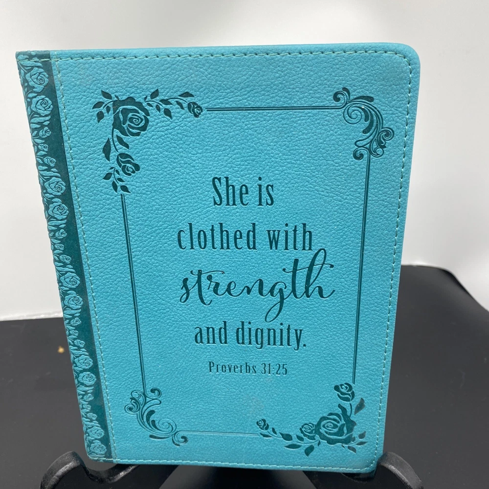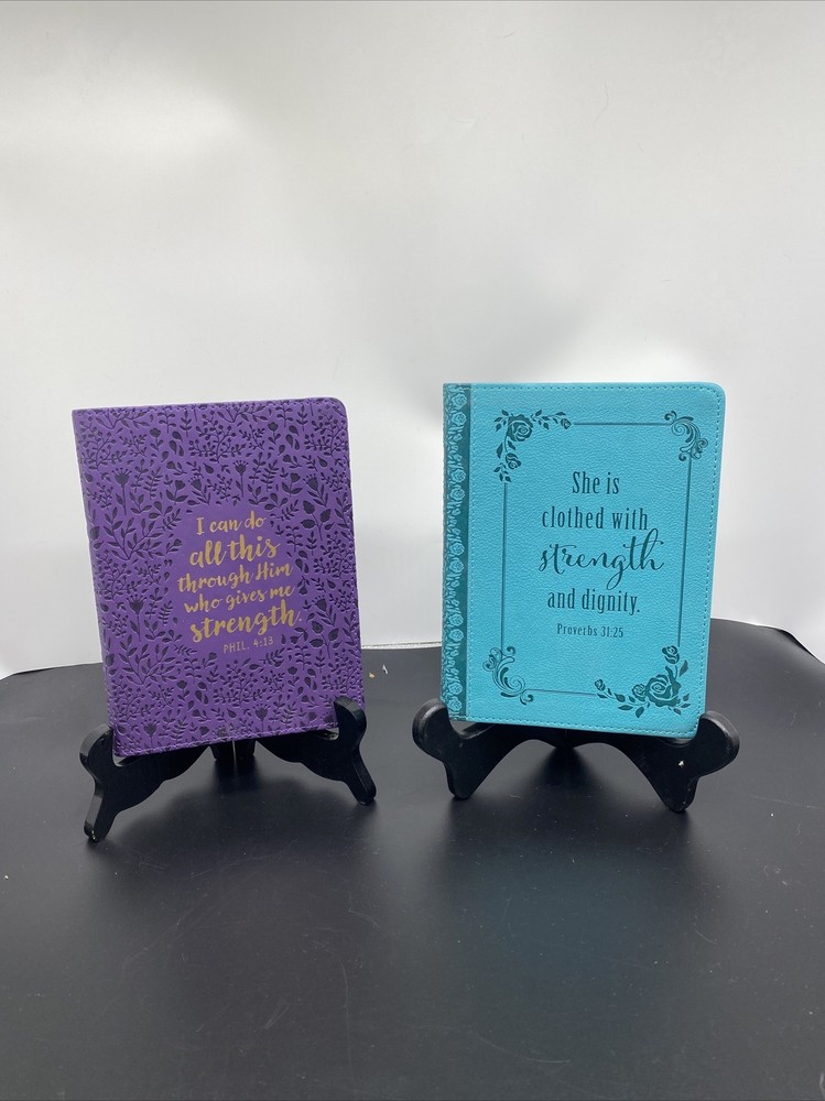 both of the journals are in excellent to like new condition. It would be a perfect gift for the upcoming holidays. Please see pictures closely for specific details of condition or message me with any questions you may have. This purple/lavender faux leather journal is perfect for young adults and adults alike. With a heat-debossed floral design , it is both stylish and secure. The journal features 336 lined pages with thick paper to minimize bleedthrough and a ribbon marker for easy page tracking. Each page includes scripture, including the popular verse from Philippians 4:13, "I can do all things through him who gives me strength." The journal is part of the Christian Art Gifts brand and includes features such as a full-color print and flexcover. The size is 9" x 6.4" x 0.9" (229 x 163 x 23mm). This journal is perfect for those looking for a religious and inspirational writing experience. Is teal / light blue journal is perfect for young adults and adults . With a heat - debossed floral design on the spine design. The journal 300 and line thick paper to minimize bleedthrou and a ribbon for easy page tracking Each page include scripture including the popular verse from Proverbs 31:25 she is clothed with strength and dignity. The journal is part of Christian art kits and includes a full color, print and flex cover size is 9” x 6.4 “ x 0 .9 ” this journal is a is looking for a opera writing experience.