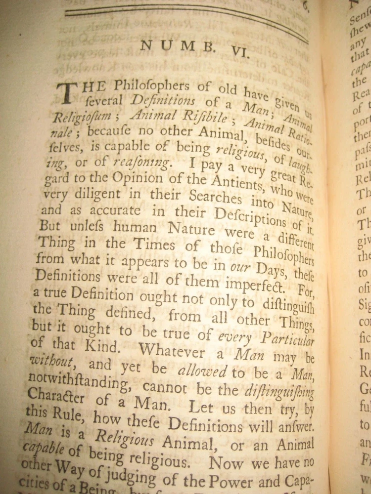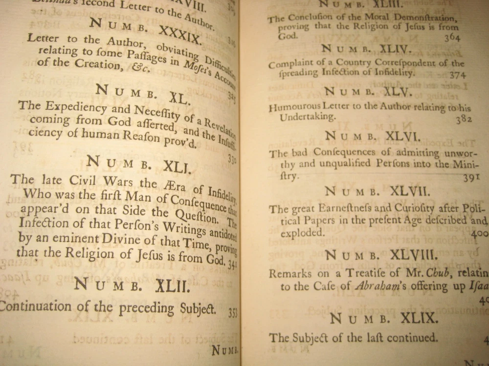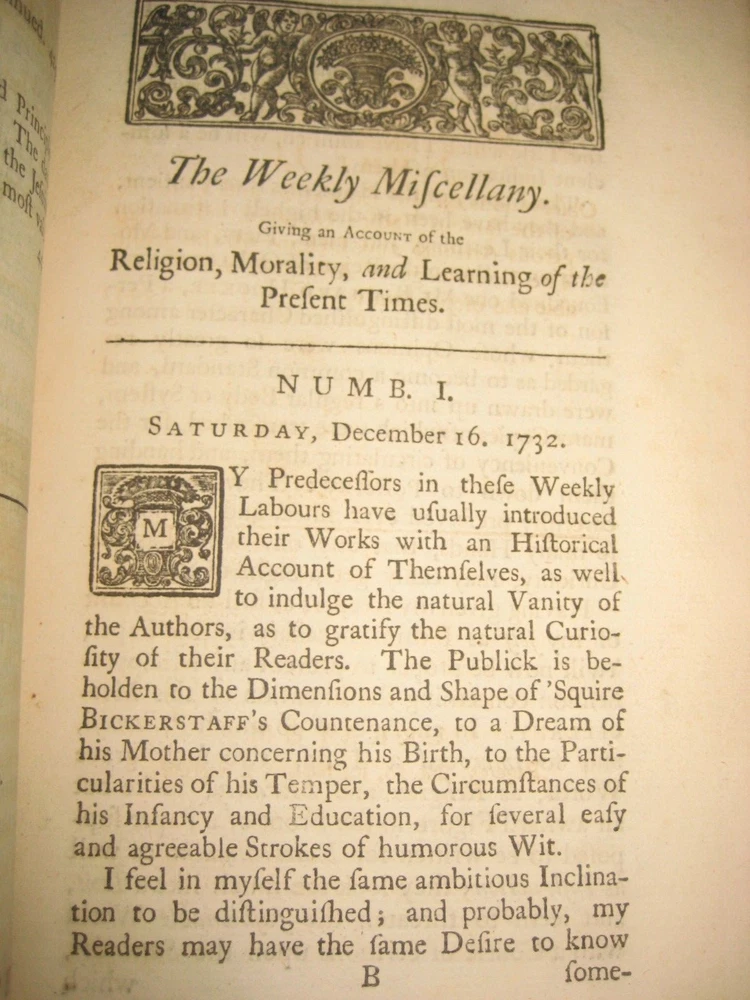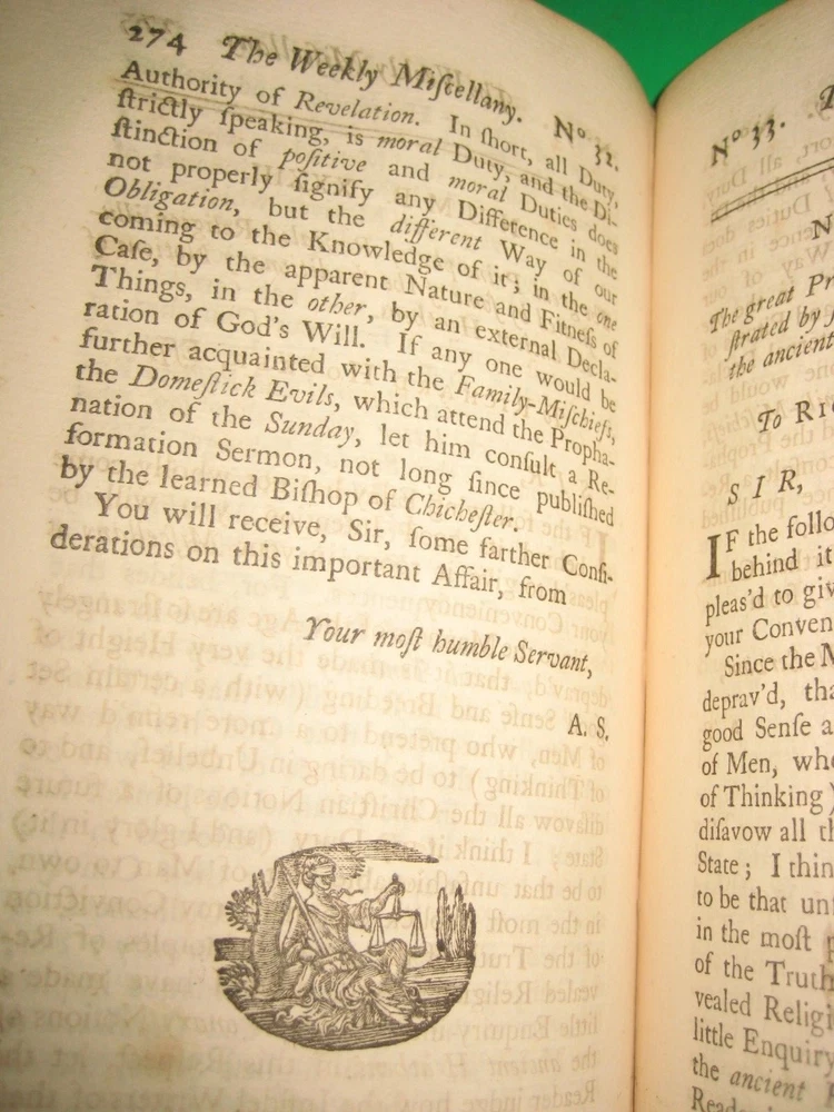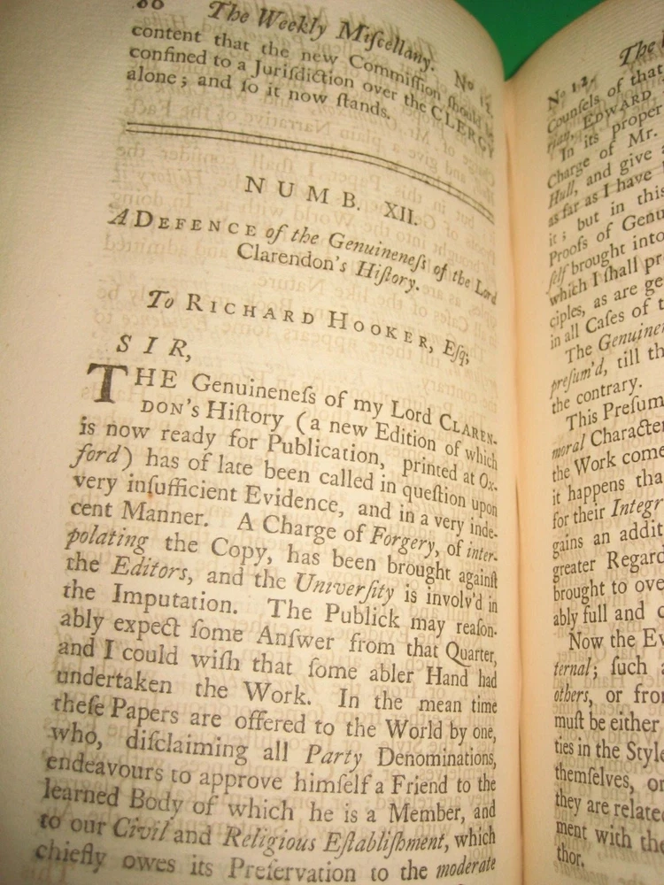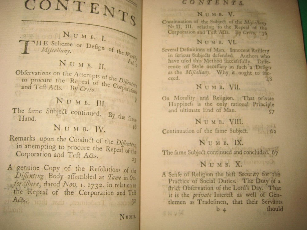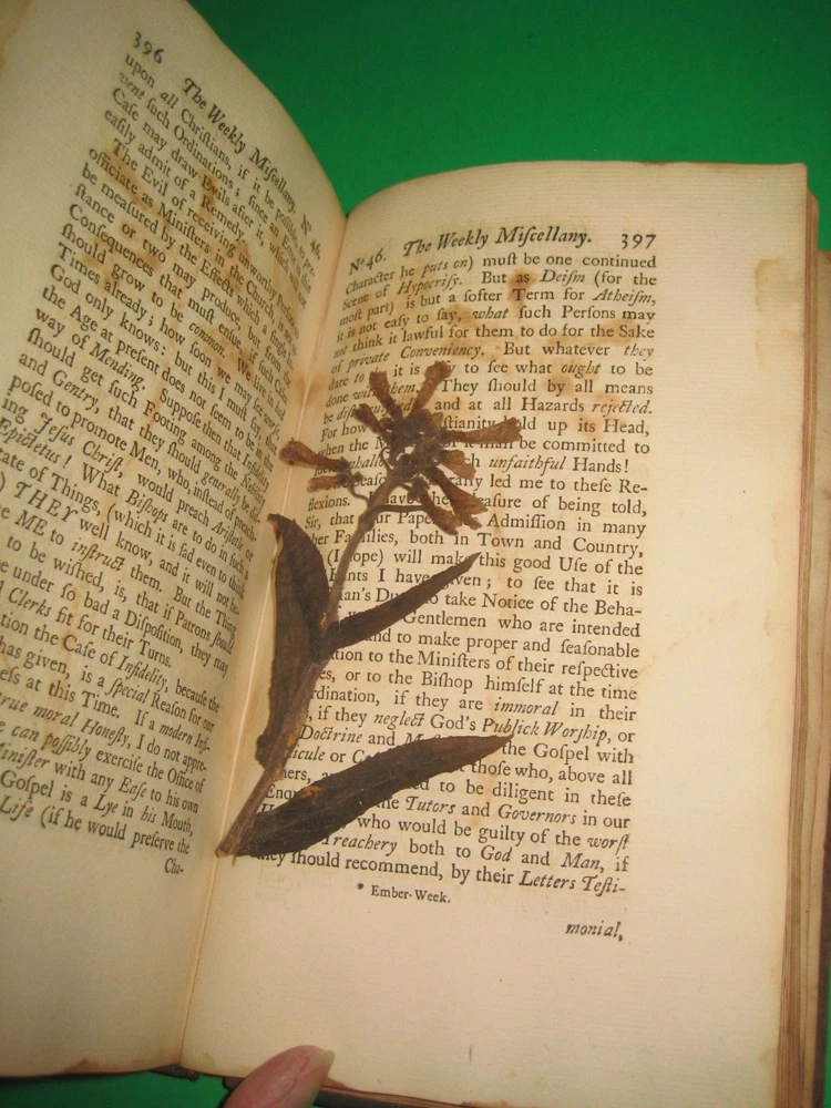 due to ebay raising the book fees to 12 %, including the shipping cost --I have some books posted in either an antique, art, or a collectible category, but you can......... CLICK HERE to see my other rare antique books . and PLEASE CLICK HERE ; To see my son's old books -he has some GREAT ONES! EXTREMELY RARE ~This is the only bound copy of this I could find anywhere. I have only been able to find 1 for sale, and it was just 1 newspaper. He was asking just over $100 with shipping. These are the 51 periodicals, starting with Dec 16th 1732 . 450 pages! UPDATE - THE 1 NEWSPAPER SOLD, but there is now another newspaper on abebooks for $90 w/ shipping -I have all 51 here! Title : The Weekly Miscellany , Giving an Account of Religion, Morality, and Learning of the Present Times. Volume 1 [not sure if vol 2 was ever published] author : By Richard Hooker of the Temple, Esq . [ William Webster] Published : in London, printed for the author, and sold by J Clarke. .. 1736. 37 pages for preface and dedication, 9 pages of contents, then 450 pages . Size = apx 8.75 by 5.5". From Wiki: William Webster (1689–1758) was a British clergyman in the Church of England and a voluminous theological writer. In 1723 he edited The Life of General Monk (London), from the manuscript of Thomas Skinner , contributing a preface in vindication of George Monck's character. A second edition appeared in 1724. In 1730 he translated ‘The New Testament, with Critical Remarks’ (London, 2 vols.), from the French Of Richard Simon. On 16 December 1732 , under the pseudonym of ‘Richard Hooker of the Inner Temple,’ he began to edit a periodical entitled The Weekly Miscellany ; not very successful, it was discontinued on 27 June 1741. From the number of religious essays it contained it became known as ‘Old Mother Hooker's Journal. ’ It is known for the attacks made in its columns on William Warburton's Divine Legation of Moses. Webster's contributions to the controversy were republished probably in 1739, under the title of Remarks on the Divine Legation . They earned him a place in the Dunciad, Alexander Pope, in 1742, inserting a passage in which Webster was coupled with George Whitefield, who had also criticized Warburton. Later in life, he fell into great poverty. He died unmarried at Ware on 4 December 1758. Condition: Please zoom in on photos carefully as they are part of the description. In full leather , front cover is detached, along with the ffep. Back cover holding on by the strings. Both covers heavily chipped. Spine cover is cracked. Hard to see, but the original label is still there. Short of the 3 dried flowers and the last few pages foxed [along with a few pages having minor water staining to the edges], these pages are generally clean , free of marks, rips, folds, or writing, ever so lightly toned. The flower picture shows how light the water staining is -some pages are just a bit darker than that. There is a small sticker with a name "Bella " on the back of the front cover along with "1736" written small in pen. A must have _ EXTREMELY RARE _ for any Christian or book collector -this could be worth quite a bit more. PLEASE Add me to your Favorites list and check back now and then to see what's new! I do combine ship, but only if you "request total from seller" BEFORE YOU PAY -otherwise I can't send you a new invoice. media mail SHIPPING TO USA ONLY well packed- I use recycled packing materials to save the planet and to save you $ -thanks! #022 -B2 refund policy - due to the excuses used for returns/ refunds - I do except returns BUT - I do not refund any shipping costs OR refund paypal's % if they don't refund me [apx 3% when money was sent to me, 3% paypal will take out of your refund] -so please ask questions if you are unsure or I missed anything. THANKS for understanding --