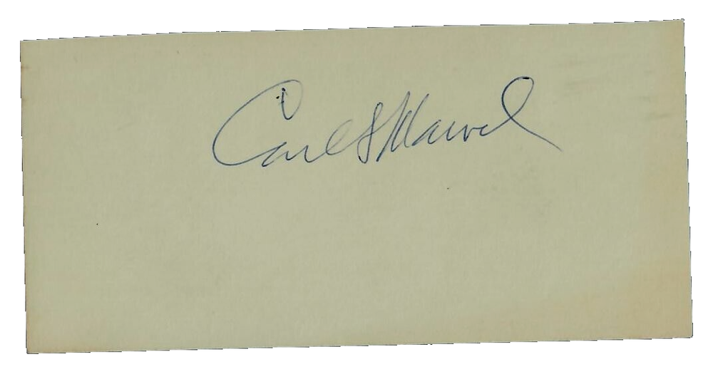 Up for auction "Polybenzimidazole" Carl "Speed" Marvel Hand Signed 2.25X5 Card. ES-4648E Carl Shipp "Speed" Marvel (September 11, 1894 – January 4, 1988) has been considered "one of the world's outstanding organic chemists. Throughout his career, almost no area of polymer chemistry escaped his interest. He made important contributions to U.S. synthetic rubber program during World War II, and later worked at developing polybenzimidazoles , temperature-resistant polymers that are used in the aerospace industry , in fire-fighting equipment, and as a replacement for asbestos . He received numerous awards, including the 1956 Priestley Medal and the 1986 National Medal of Science , presented by President Ronald Reagan. Carl Shipp Marvel was born on September 11, 1894, in Waynesville, Illinois , U.S., to farmers John Thomas Marvel and Mary Lucy Wasson Marvel. An uncle urged him to study chemistry. Marvel attended Illinois Wesleyan University from 1911 to 1915. He graduated with an A.B. and M.S. in chemistry. On the recommendation of his advisor, Alfred W. Homberger, Marvel obtained a $250 scholarship to the University of Illinois. Marvel had to take extra classes to "catch up" during his first year at University of Illinois . He obtained the nickname "Speed" early on in his career as a chemist from his habit of rushing to breakfast after studying all night. While at Illinois, Marvel became a friend of fellow student Wallace Carothers . Marvel received his M.A. in Chemistry from the University of Illinois in 1916. Marvel's studies were interrupted by World War I . As the war cut off previous sources of supply, it became difficult to obtain many of the chemicals used in synthetic organic chemistry and related industrial processes. Clarence Derick set up the Organic Chemical Manufactures unit at Illinois to make and sell chemicals that had previously been imported from Germany. From 1916 to 1919 Marvel worked at the production unit under Roger Adams . His work in the Organic Chemical Manufactures unit gave him extensive experience in chemical preparation. [2][5] Students were required to take careful notebook records of each preparation, including the cost of chemicals, apparatus, and the time needed. Marvel was known for his ability to modify poor procedures to make them more effective, and to describe procedures so that others could follow them. Many of these laboratory procedures were later published, first as pamphlets on Organic Chemical Reagents , by Roger Adams, O. Kamm, and C. S. Marvel, and later in the journal Organic Syntheses . Marvel was a member of Tau Kappa Epsilon . He was initiated into Alpha Chi Sigma at the Zeta Chapter, University of Illinois , in 1918. In 1919, Marvel returned to graduate study full-time, supported by a fellowship from DuPont . Marvel received his Ph.D. in Chemistry from the University of Illinois in 1920, working with department head William Albert Noyes . His thesis was A Study of the Possible Asymmetry of Aliphatic Diazo Compounds .