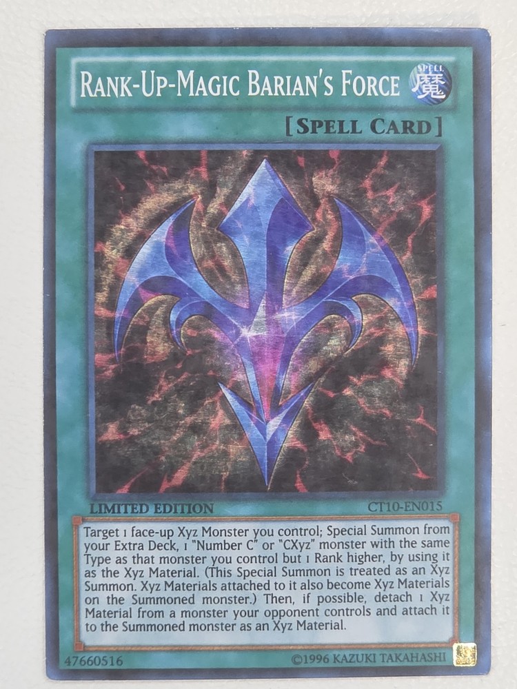 This is a nice example of a 2013 Collectors Tins #CT10-EN015 Rank-Up-Magic Barian's Force Other important information about this card: Super Rare In 2013 Rank-Up-Magic Barian's Force played for the . Please check out our other listings for more great cards.