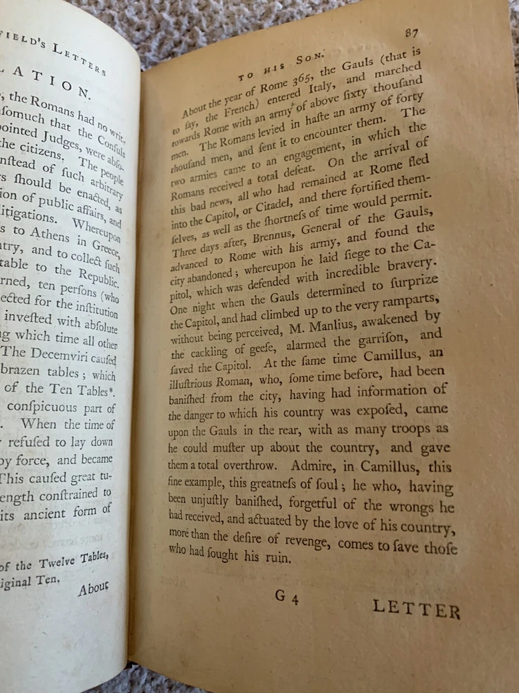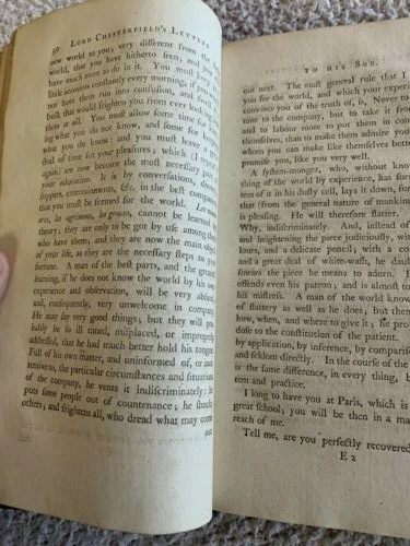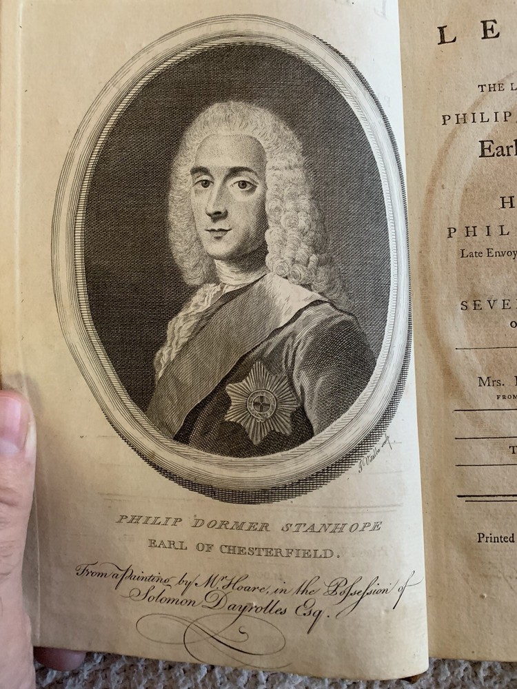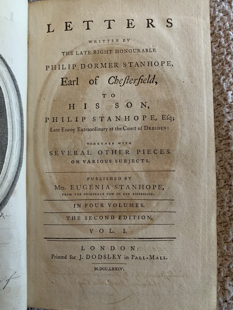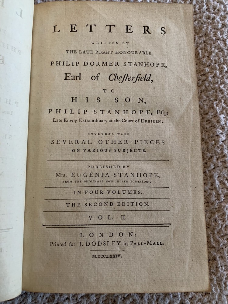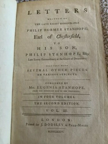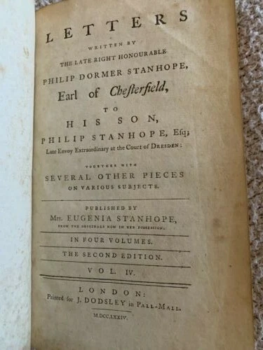 1774 Second English Edition, Four Volumes, Letters by Earl of Chesterfield to his Son Letters Written by the Late Honourable Philip Dormer Stanhope Earl of Chesterfield to his Son Philip Stanhope, Esquire, Late Envoy Extraordinairy at the Court of Dresden Together with Various Pieces on Various Subjects Published in England by Eugenia Stanhope & J. Dodsley, in Pall-Mall Very good condition for their age Covers show wear with minimal loss, bindings are tight A little foxing and edgeworn covers See pictures Leather covers Previous owner bookplate on the covers: Sir John Robert Chancellor (Lt. Colonel, Colonial Administrator) Vol. 1: pp. 352 Vol. 2: pp. 355 Vol. 3: pp. 376 Vol. 4: pp. 364 Dimensions: 8 1/2" x 5 1/2" x 1 1/4" These 4 volumes contain a collection of 393 letters from a British Statesman father to his son on subjects including geography, history and classical education. This was when the American colonies were getting ready to declare independence from England.