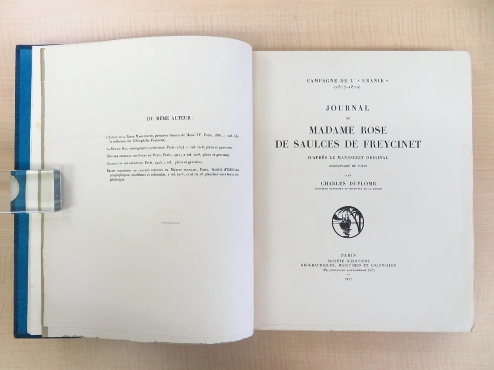 Item Description Title: Journal de Madame Rose de Saulces de Freycinet d'apres le manuscrit original Editor: Charles Duplomb Publisher: Societe d'Editions geographiques, maritimes, et coloniales, Paris Publication Year: 1927 Language: French Edition: First Edition Volumes: 1 Binding: Full Leather Binding with Gilt Decorations, Marbled Endpapers Illustrations: 25 Lithographic Plates Condition: Overall good, some light wear to slipcase, minor spine and cover wear, light toning to final blank page Rarity: Rare, out of print/sold out Additional Details: ISBN: N/A Signed: No Personalized: No Region of Origin: Europe Country of Origin: France This is a rare first edition of "Journal de Madame Rose de Saulces de Freycinet d'apres le manuscrit original", published in 1927. The book is the travel journal of Madame Rose de Freycinet, who accompanied her husband, the renowned French explorer Louis de Freycinet, on his 1817-1820 world voyage. The journal provides a unique and invaluable firsthand account of this important maritime expedition, offering insights into the customs and interactions encountered by the Freycinet party across the globe. The work is illustrated with 25 lithographic plates, adding to the visual richness of the narrative. This copy features a beautiful and elaborate full leather binding, with gilt decorations and marbled endpapers. The binding is signed "jill 1937", indicating the work of a skilled bookbinder. While the slipcase shows some light wear and the spine and covers have minor signs of use, the interior pages are in excellent condition, with only light toning to the final blank page. This first edition of "Journal de Madame Rose de Saulces de Freycinet" is a rare and highly sought-after volume, providing both a captivating historical account and a stunning example of fine bookbinding. It is an essential addition to any collection focused on 19th-century exploration, travel literature, or the history of maritime voyages. Shipping Worldwide Flat Rate Expedited Shipping ...3~8 days Cost : 0.00 Other Term International Buyers Please Note: Import duties, taxes and charges are not included in the item price or shipping charges. These charges are the buyer's responsibility. Please check with your country's customs office to determine what these additional costs will be prior to bidding/buying. These charges are normally collected by the delivering freight (shipping) company or when you pick the item up - do not confuse them for additional shipping charges. We do not mark merchandise values below value or mark items as "gifts" - US and International government regulations prohibit such behavior. Track Page Views With Auctiva's Counter