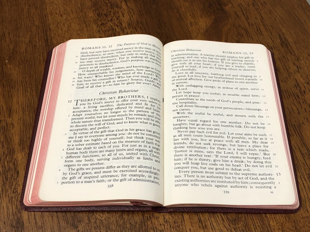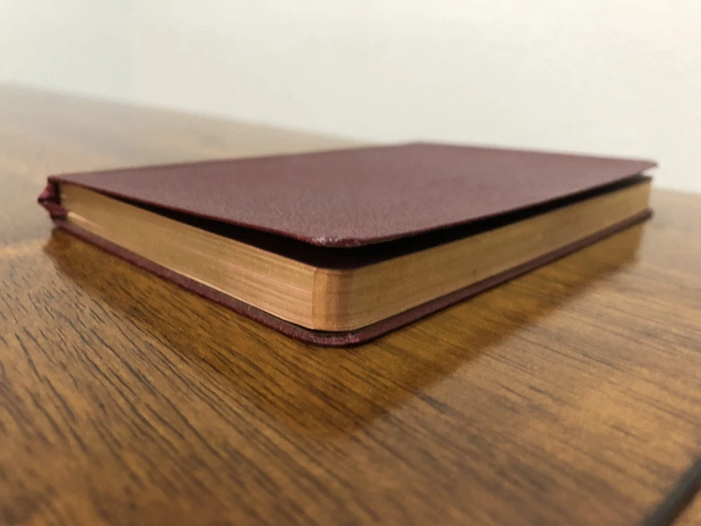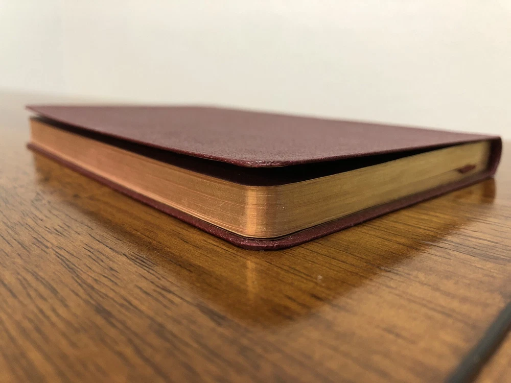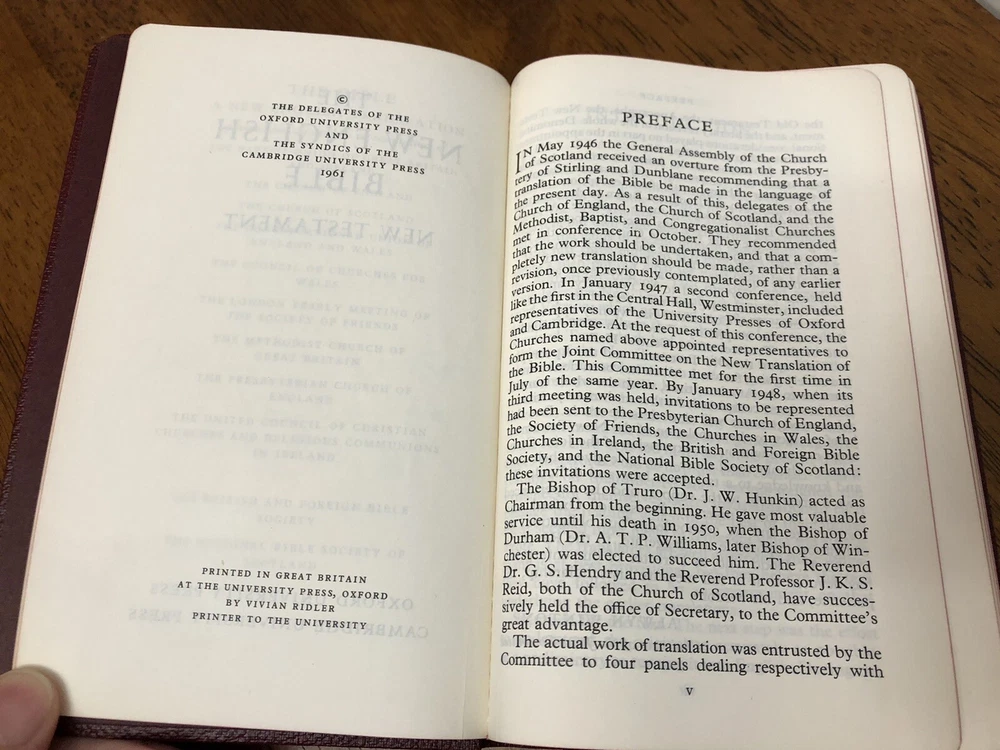 Oxford Cambridge NEB NT New English Bible Burgundy Leather Art Gilt 130H These are exceedingly rare, but over years and diligent searching I’ve acquired several of these and decided to part with them from my personal collection. This is a burgundy 130H NEB with the New Testament only. It features perhaps the most pleasant reading format available for the Bible, single column with a rather perfect character line count, with the verse numbers outside the text. This has what appears to me to be mint art gilding, except a tiny abrasion has perfect binding (it’s imitation leather and stiff), and has no writing I could find except the confirmation gift inscription on a blank intro page. Quite a few pages still stick. Talk about a diamond in the rough! $175 Black letter Reinforced sewn text block 6 x 4 x .4 Note: I always list any writing, stains, tears, or imperfection of any kind. Unlike the vast majority of sellers out there, I refuse to hide imperfections through cleverly taken pictures or obscure descriptions. I try to include as many pictures as necessary to highlight the imperfections rather than the beauty of the items, which is part of why I have an elevated Seller Status and perfect feedback in which many consistently report back “just as described” or “better than described.” If I miss something by accident, please contact me so I can make it right. My flawless feedback should speak for itself, but you won’t be disappointed! Thank you for your business and God bless!