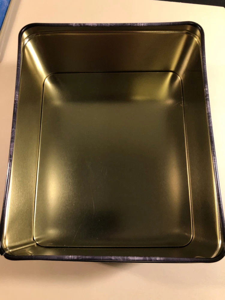 The surface of the tin is missing some paint in a few places, and one corner of the plastic packaging inside the tin is mangled.