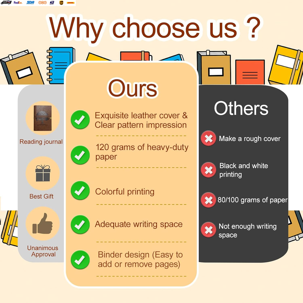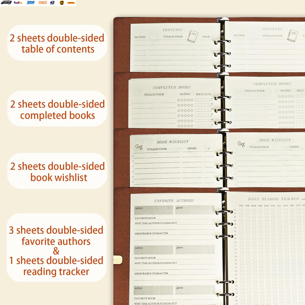 This leather reading journal is a book lover's dream! The elegant brown cover feels luxurious, and the 70-book tracking layout keeps my reading progress organized. I love jotting down thoughts after finishing a book—it’s like a personal library diary. Shipping was super fast, and the quality exceeded my expectations. Perfect gift for fellow readers or a treat for yourself! Highly recommend.