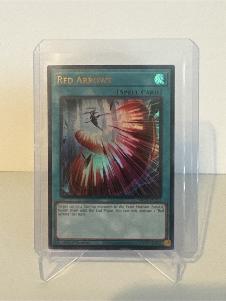 The Red Arrows MP24-EN253 25th Anniversary Tin: Dueling Mirrors 1st Edition is a highly sought-after card in the Yu-Gi-Oh! TCG. This ultra rare Spell card from the set features a unique Dueling Mirrors theme, making it a valuable addition to any collector's deck. Manufactured by Konami, this English-language card is a must-have for fans of the game looking to enhance their gameplay with a rare and powerful card like Red Arrows.