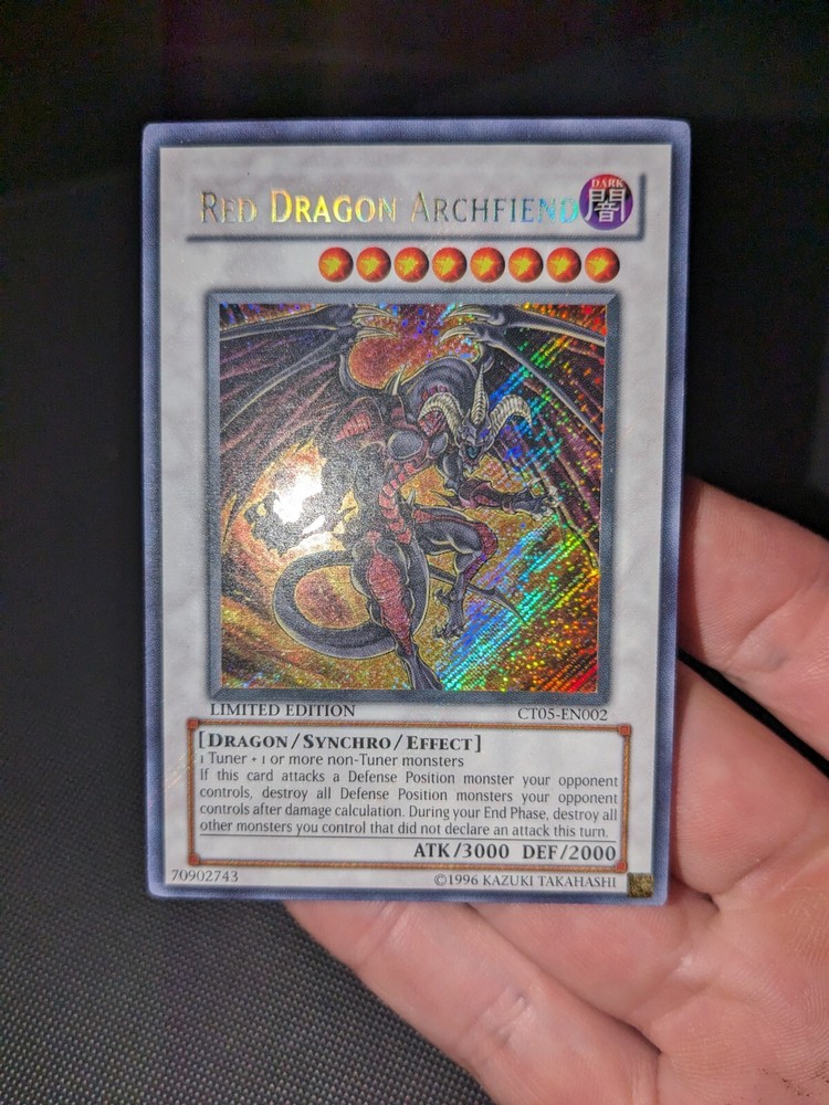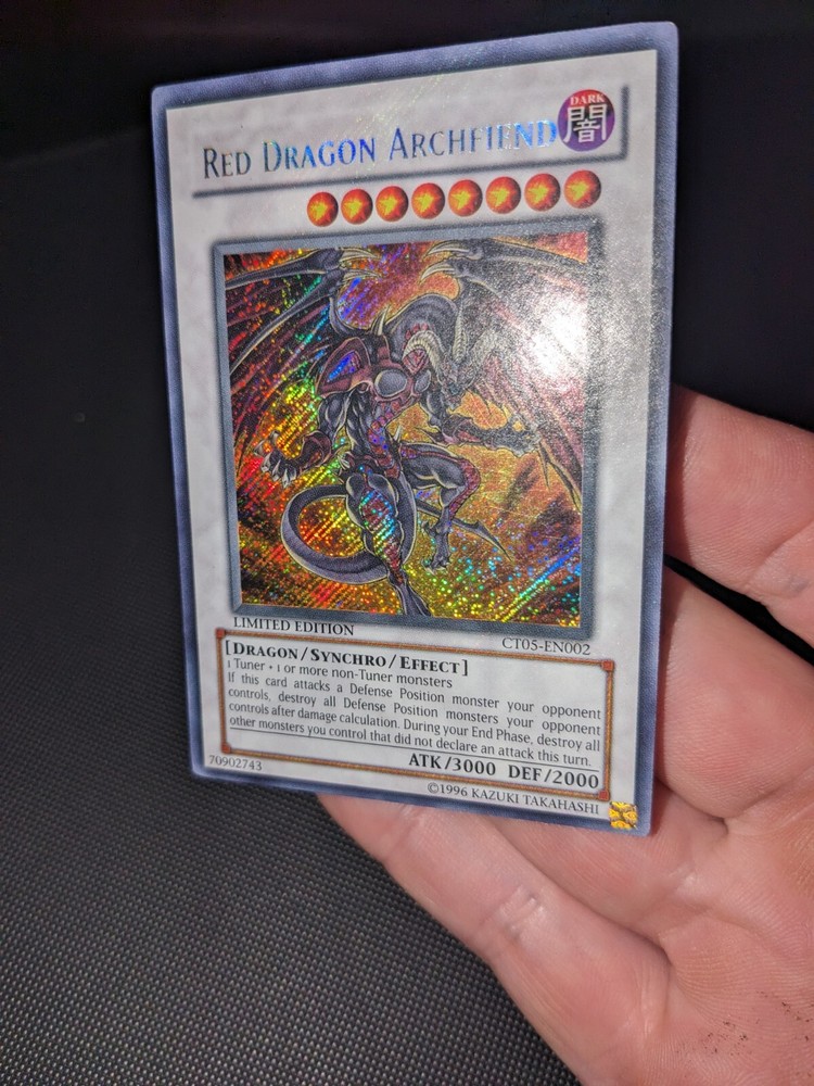 This limited edition Red Dragon Archfiend card is a must-have for any Yu-Gi-Oh! collector. With a vintage Secret Rare rarity and a card number of CT05-EN002, this card is sure to be a prized possession. The card features a Dark attribute and a Dragon creature type, with an attack power of 3000 and a defense/toughness of 2000. The card is made of high-quality card stock material and was manufactured by Konami in the United States in 2008. It is a Synchro/Effect Monster card type and comes in standard size. This card is perfect for those who are looking to complete their collection or for those who want to add a rare and unique card to their deck.