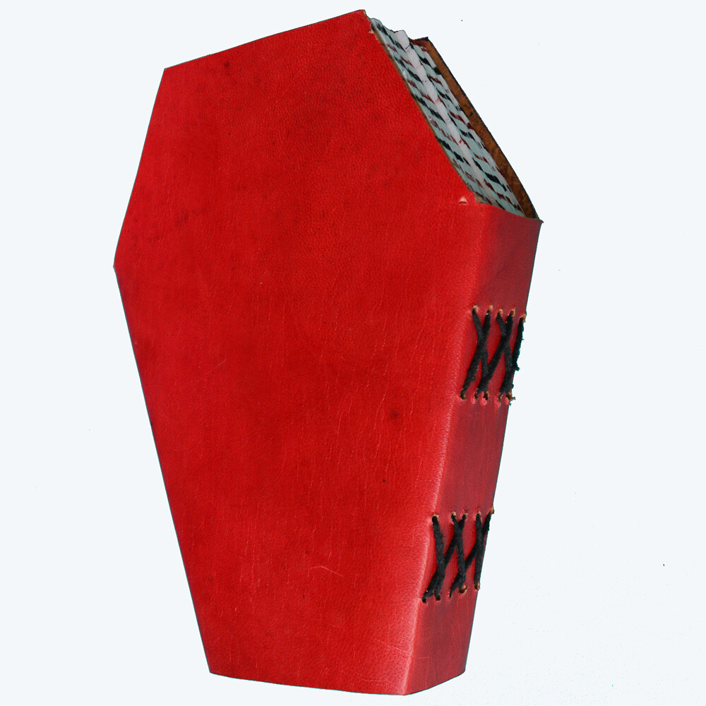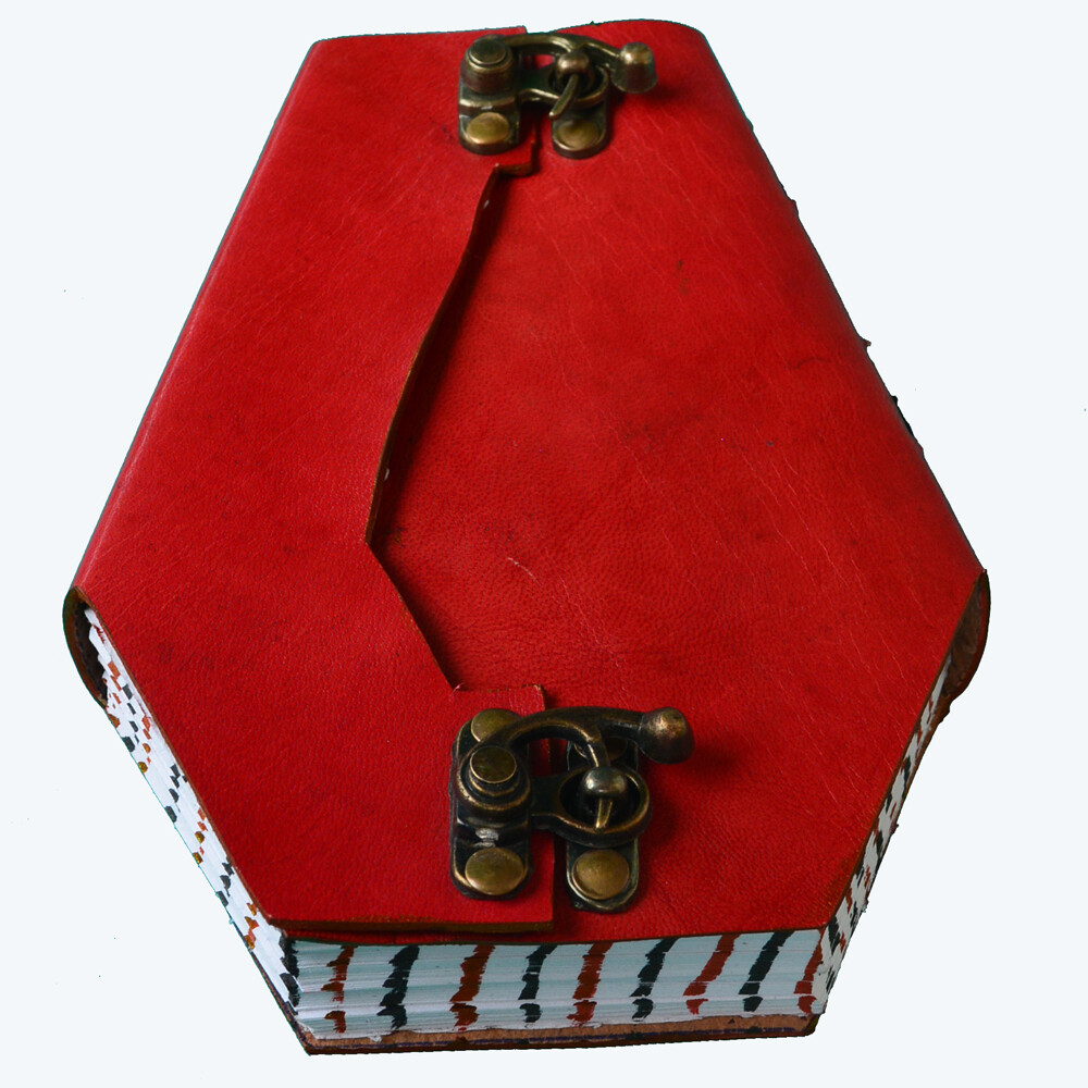 Handmade Materials: Handmade Paper, Leather Cover, Brass locks Read the full description Description Cover Description - Leather Cover in Coffin Shape with Black or Red Plain Color Closure - One Lock or Two Lock Closed Paper - 200 sides of Handmade Paper edges are colored in red or in red black stripes to give intense effect to the diary Usage - To write personal feelings and emotions. to distribute in any occassion of grief , mourning or of church as a remembrance . Can be personalized Size - 7" x 5" x 1.5" Payment: We accept Paypal Payments. Shipping: The parcel with be shipped through International Indian Postage Services. It may take up to 18 to 20 days to reach to your country. Returns: We accept 30 days return for our buyers. If you dis-satisfied with any item please contact us before placing any return. Feedback: Your feedback is very important to us. If you liked the product, then please provide us positive feedback.
