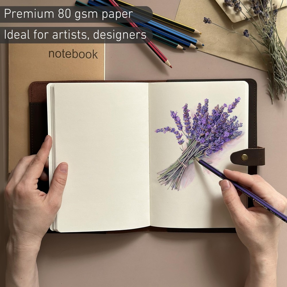 Discover an all-in-one solution with our A5 notebook cover set. Inside the box, you'll find an A5 notebook cover along with lined and blank notebooks, each containing 200 pages. Whether you're sketching, journaling, or planning, this versatile set has you covered. Additionally, enjoy the convenience of a leather bookmark and a leather key ring included in the set. This makes it a stylish and practical gift suitable for professionals, entrepreneurs, students, and creative individuals alike. With its durable construction and elegant design, this set is perfect for anyone seeking organization and inspiration in their daily life. Premium Genuine Leather Cover: Crafted from high-quality, soft, and supple genuine leather that feels amazing in your hands and develops a unique patina over time, offering a timeless and elegant look. Includes Two Versatile Notebooks: Comes with one lined and one blank notebook, each with 200 pages of thick, ink-proof paper that lays flat, making writing and sketching a pleasure. Customers love the quality and versatility of the paper. Perfect A5 Size for Portability: Measuring 5.5 x 8.2 inches, it’s the ideal size to carry in your bag, providing a perfect balance between portability and functionality. Fits standard A5 notebooks for easy refills. Thoughtful and Functional Design: Features a built-in pen holder, inside pocket, and card slots, ensuring all your essentials are at hand. The secure clasp closure keeps your journal safely closed. Durable and Long-Lasting: Customers praise the sturdy construction and the refillable design that allows for years of use, making it a sustainable choice for daily journaling, note-taking, or sketching. Versatile Use for Everyone: Ideal for writers, artists, professionals, students, and anyone who values quality craftsmanship. Use it as a diary, planner, sketchbook, or travel journal. Elegant Gift Packaging: Presented in a stylish box, making it a perfect gift for birthdays, graduations, anniversaries, or any special occasion. Many customers have given it as a gift and report that it was well-received. Additional Accessories Included: Comes with a leather bookmark and key ring, adding extra value and functionality—features that customers find thoughtful and useful.