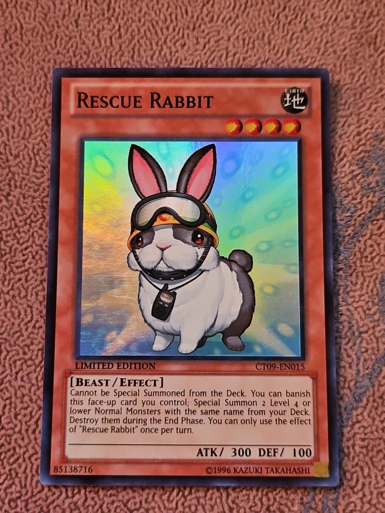 This limited edition collectors tin features the popular Yu-Gi-Oh! TCG card, Rescue Rabbit, with an Earth attribute and Beast creature/monster type. Manufactured by Konami in 2012, this Super Rare card has a Defense/Toughness of 100 and Attack/Power of 300. The card number is CT09-EN015 and it is an Effect card type. This item is perfect for collectors of CCG individual cards and fans of the Yu-Gi-Oh! TCG game. The card is in English language and comes from the 2012 Collectors Tin set. Don't miss your chance to add this rare and valuable card to your collection!