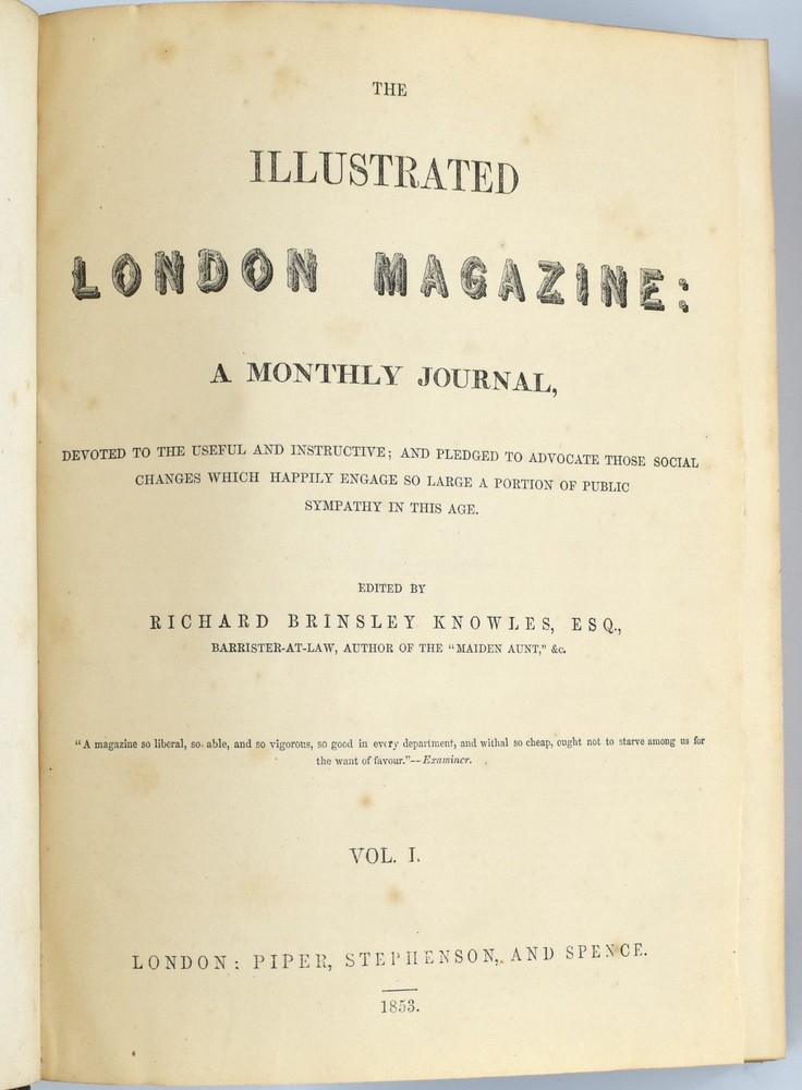 [VICTORIAN] [JOURNALS] [CHESS] THE ILLUSTRATED LONDON MAGAZINE: A MONTHLY MAGAZINE. 4 VOLUMES BOUND IN TWO Author: Richard Brinsley Knowles, Esq Title: [VICTORIAN] [JOURNALS] [CHESS] THE ILLUSTRATED LONDON MAGAZINE: A MONTHLY MAGAZINE. 4 VOLUMES BOUND IN TWO Publication: London: Piper, Stephenson, and Spence, 1853-1856 Description: Half Leather. Two small quarto volumes (10” x 7 1/2”), in black half calf over marbled board; raised bands with decorations and titling in gilt; the first four volumes of The Illustrated London Magazine, each volume consisting of 6 issues, for one half a year--July 1853-December 1853 (282 pages); January 1854-June 1854 (264 pages); July 1854-December 1854 (260 pages); Janaury 1855-June 1855 9272 pages).~~The first 24 issues of the relatively short-lived Illustrated London Magazine. “Illustrated” is certainly the case, as in-text steel engravings are numerous. The articles range from seances to hunting to travel to a visit to Newgate Prison. Of particular interest are the chess columns and diagrams: “”For the sake of those readers who are chess players we have engaged for the present and subsequent numbers of the Illustrated London Magazine, the valuable services of Mr. Williams, the celebrated chess player. In each month he will supply the latest games of any interest, played by the best players.”. Very Good binding. Seller ID: 295477 Subject: History & Military Black Swan Books Richmond VA We specialize in antiquarian books, classic literature, the Civil War, Viriginiana, travel, art, children's books, and other subject areas, including religion and philosophy . Terms Payment via PayPal is preferred. All orders ship within two [2] business days, Monday through Friday by standard mail, USPS Media Mail. Combined orders and expedited shipping is available. Please contact us for a shipping quote before ordering. All items are guaranteed as listed and described. Any item may be returned within 30 days for any reason in the condition is which they were sent. This listing was created by Bibliopolis.