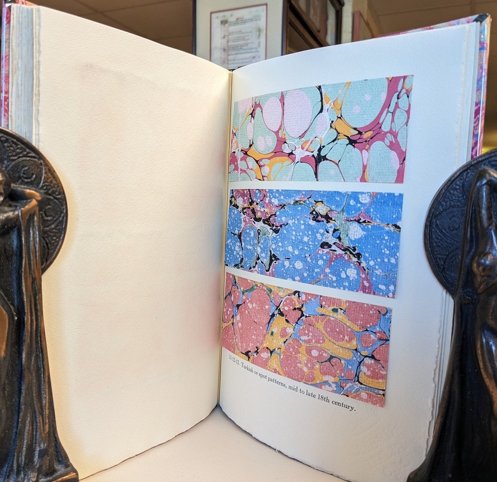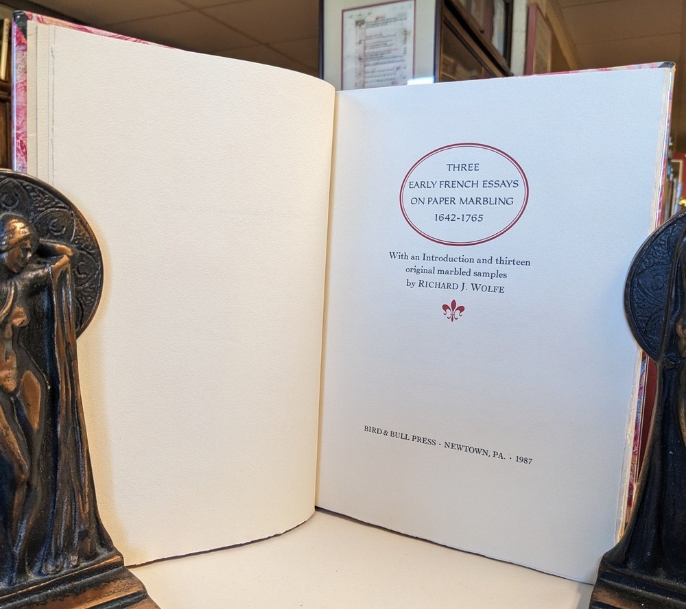 Three Early French Essays on Paper Marbling 1642-1765 Author: WOLFE, Richard J., editor Title: Three Early French Essays on Paper Marbling 1642-1765 Publication: Newtown, PA: Bird & Bull Press, 1987 Edition: Limited to 310 copies Description: large octavo, three-quarter marbled boards with morocco spine and tips, leather spine label, in original mylar jacket. 106 pp. Hand printed by Henry Morris, Bird & Bull Press on Umbria handmade paper (Heaney A43). Thirteen original marbled paper samples tipped-in. The three essays are translated by Wolfe: For the Making of Marbled Paper, Called Turkish Paper, from a 1642 unpublished manuscript from Lyon; The Best Method of Making Marbled Paper, published in the Journal Oeconomique, 1758; and The Marbler of Paper, printed in the Diderot-D'Alembert Encyclopdie, 1765. 1/2" chip to acetate at top of spine, else a fine copy. Seller ID: 33605 Subject: Books About Books, net-price-sale, Papermaking The Colophon Book Shop The Colophon Book Shop specializes in the fields of antiquarian and in-print books about books , literary first editions , and military history , especially World War I Aviation and World War II Aviation . The Colophon Book Shop was established in 1971 in LaGrange, Illinois, by Robert and Christine Liska. The move to New Hampshire was made in 1982 and we are now located in Exeter, New Hampshire, one hour north of Boston Terms Items will be shipped within five days of payment. Standard mail is via USPS. Please inquire about expedited and international shipping options before placing your order. We offer combined shipping on multiple orders. All items are guaranteed to be as described or they may be returned within 30 days of receipt for a full refund. This listing was created by Bibliopolis.