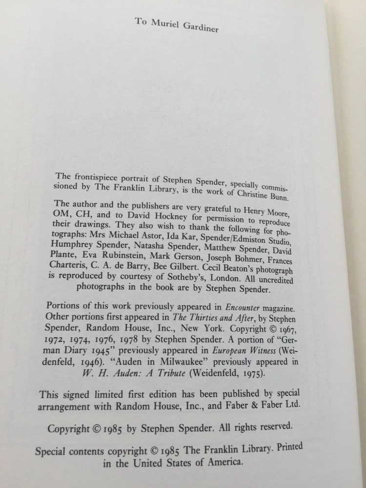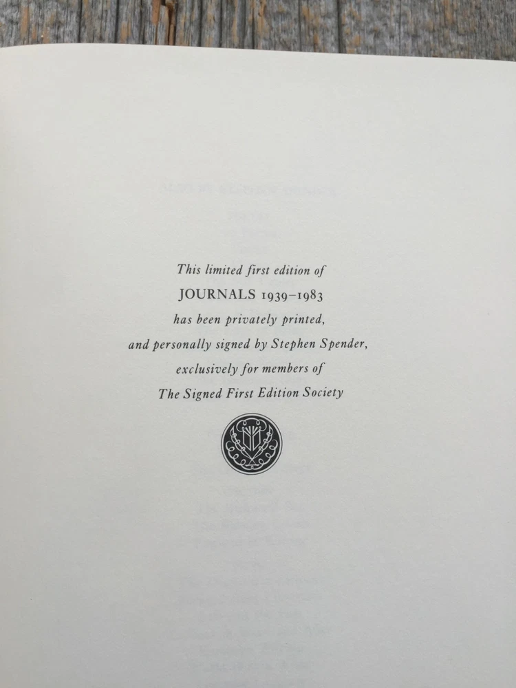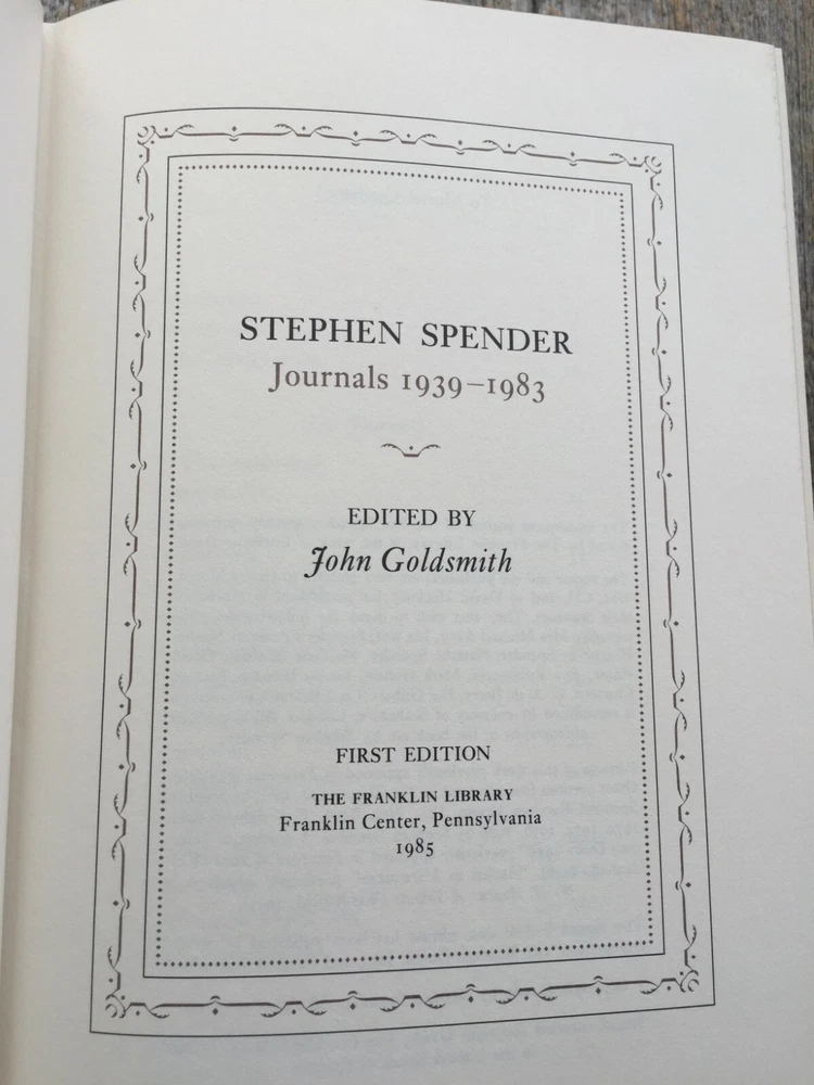 JOURNALS 1939-1983 Stephen Spender Book Description: The Franklin Library. Franklin Center, Pennsylvania. 1985. Autographed Copy. 1st Edition. Hardcover. Book Condition: Very Good. Bound in fine genuine leather with 22kt gold decorations. Printed on archival paper with gilded edges. 510 numbered pages, including black and white photographs. Raised spine hubs. Marbled endpapers. SIGNED by the author, STEPHEN SPENDER on the center of a special tipped-in page, in blue ink. Sewn-in satin ribbon bookmark. No dust jacket as issued. The frontispiece portrait of Stephen Spender, specifically commissioned by The Franklin Library, is the work of Christine Bunn. There is no ex-libris label, embossed stamp, inscription or writing from the previous owner in this book. Shipping: Your hardback will be carefully packaged and travel in a sturdy box to ensure a safe delivery. FREE domestic shipping, via Fed ex . Satisfaction Guaranteed.