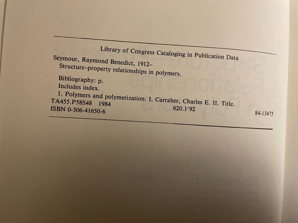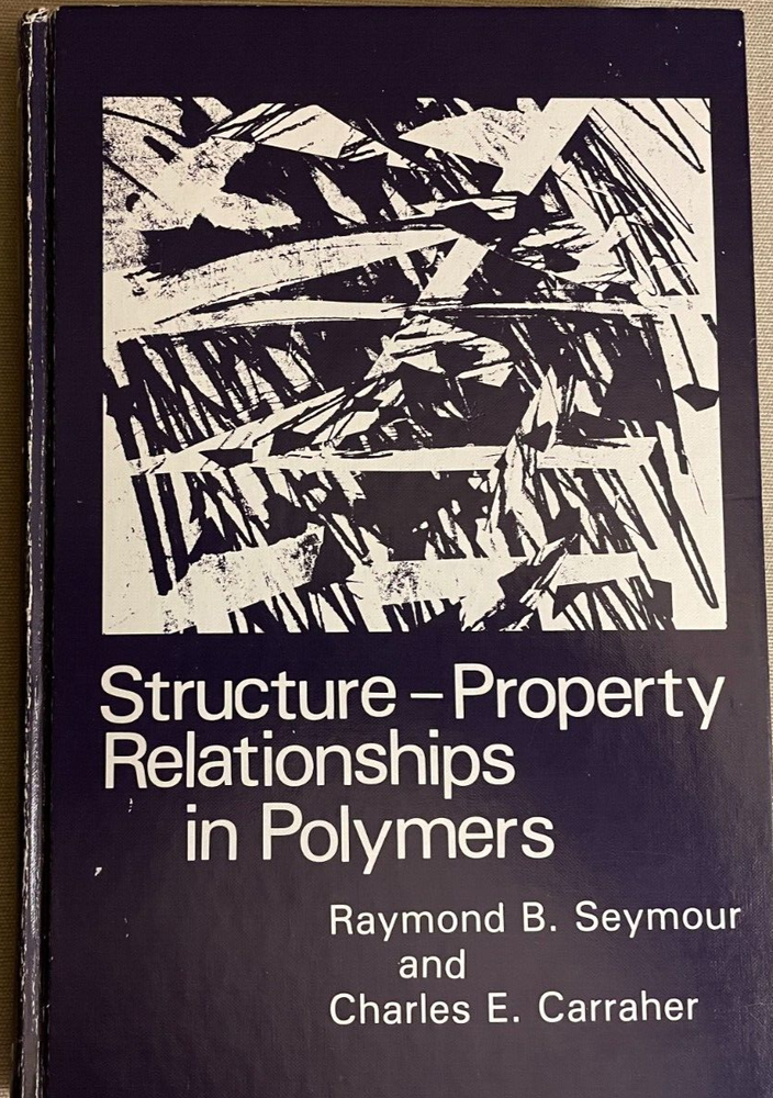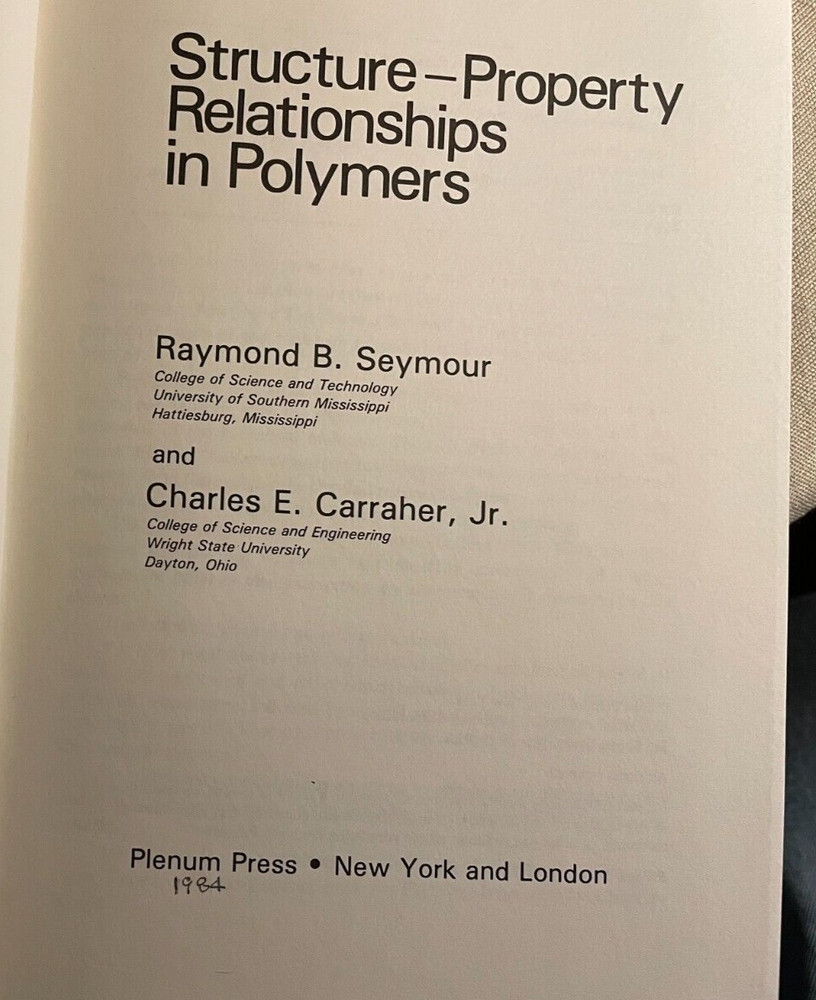 STRUCTURE-PROPERTY RELATIONSHIPS IN POLYMERS BY RAYMOND B. SEYMOUR AND CHARLES E. CARRAHER, JR. PUBLISHED BY PLENUM PRESS, NEW YORK 1984. BOOK IN GOOD CONDITION: WITH SOME WEAR ON COVER EDGES. 232 PAGES, ILLUSTRATED. EMAIL ANY QUESTIONS (16-S)