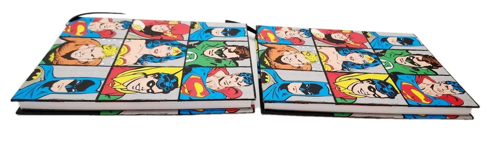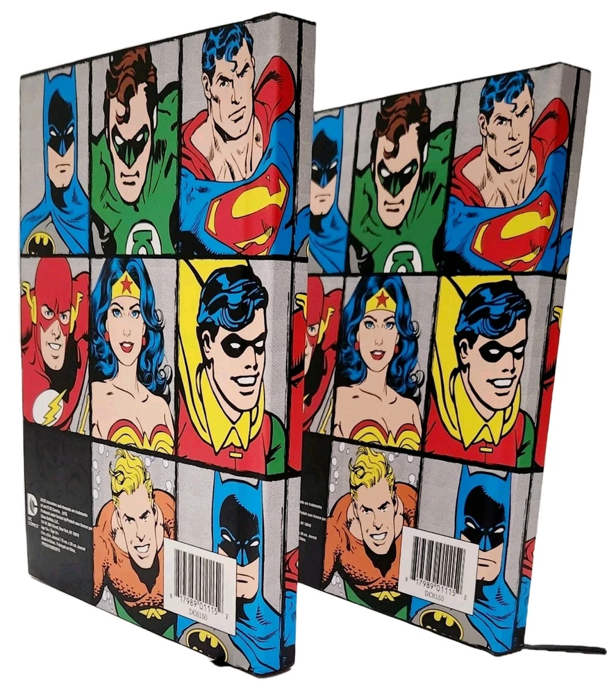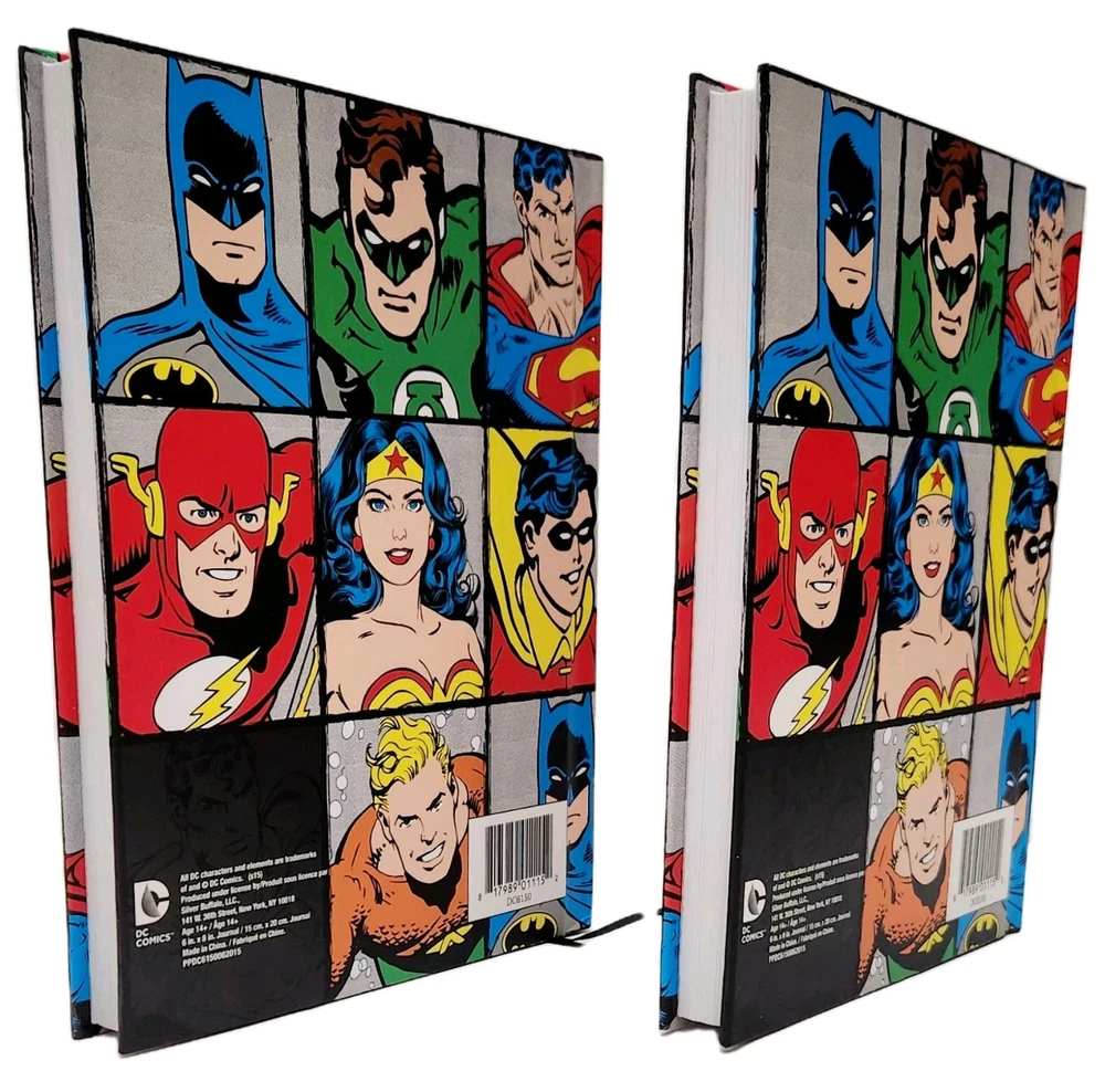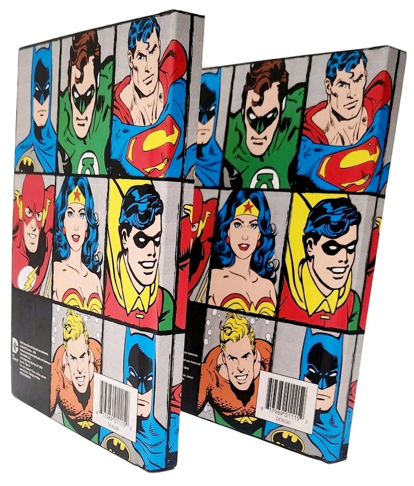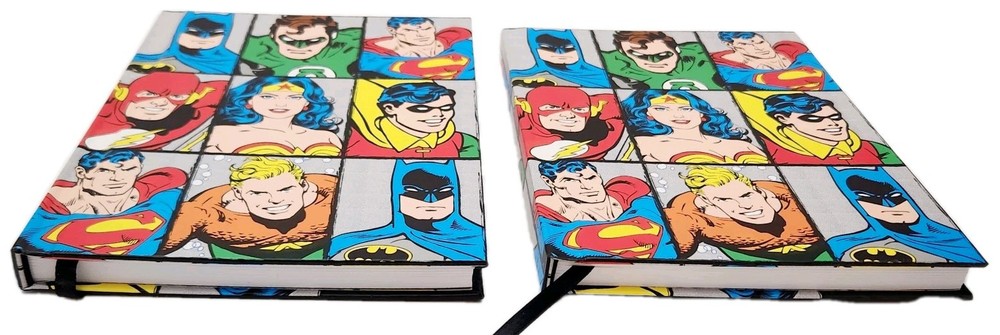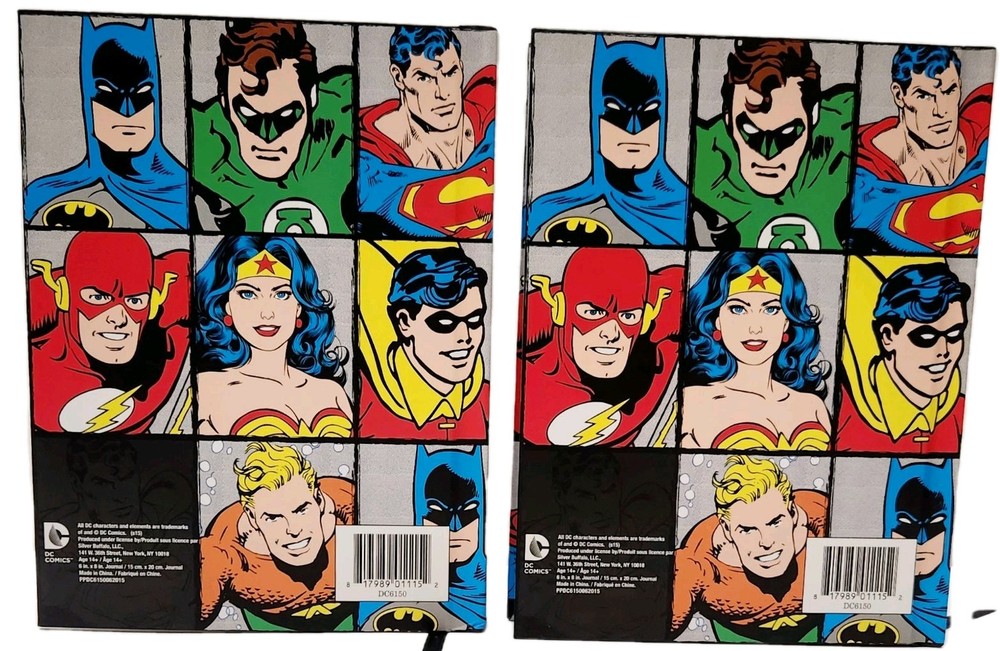 The product is a Lot of two DC Comics-themed hardcover journals featuring DC Comic Characters like Superman, Batman, Wonder Women, and more on the front and back covers. Each journal is decorated with a grid design and includes a ribbon bookmark for easy page tracking. The journals are made of durable hardcover cardboard and are not personalized or signed. Ideal for fans of DC Comics looking for a stylish and functional way to jot down notes or keep a journal. * Specifications: * Brand - DC Comics * UPC - 817989011152 * Model - DC6150 * Vintage - No ***** * Condition - New ***** * Included - (Lot Of 2) DC Comics Hardcover Journals featuring DC Comic Characters * Color - Multi-Color * Recommended Age - Ages 14 & Up * Number of Pages ( Approximately) 75 to 80 Lined, Two-Sided Sheets Which Include a Ribbon Book Mark To Assist With Tracking Your Pages. * Charaters on Book Cover includes Super Man, Batman, Wonder Women, and more! * Measurements - 8 Inches (L) x 6 Inches (W) ***** * Excellent Gift for Collectors, Birthdays, Christmas & All Other Special Occasions ***** * Honest Seller *****
