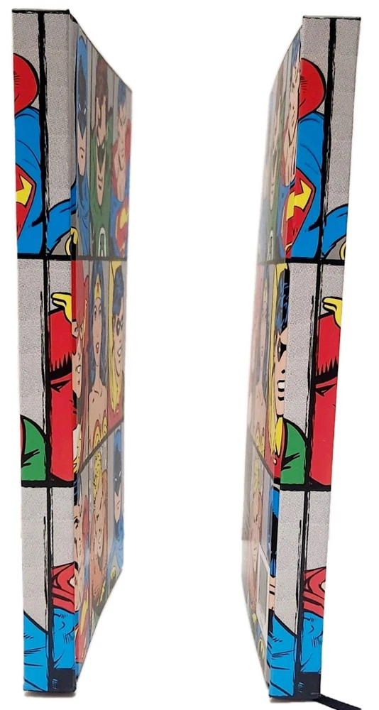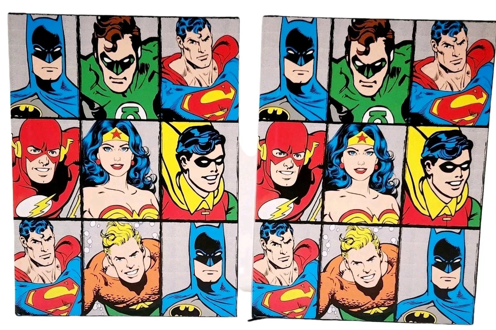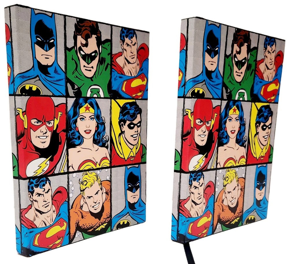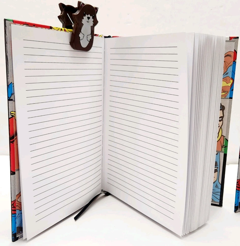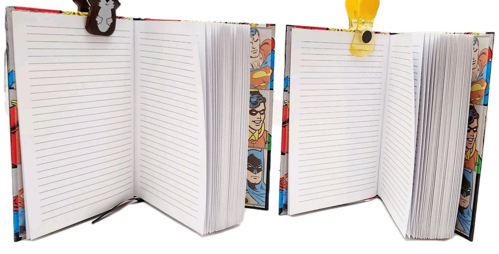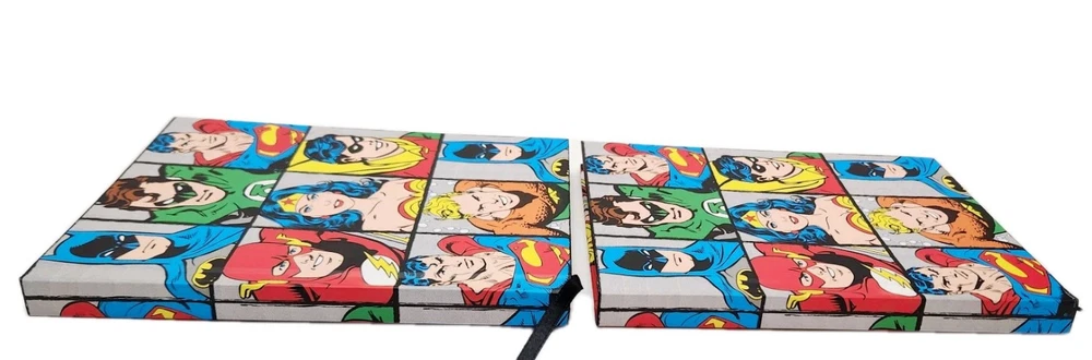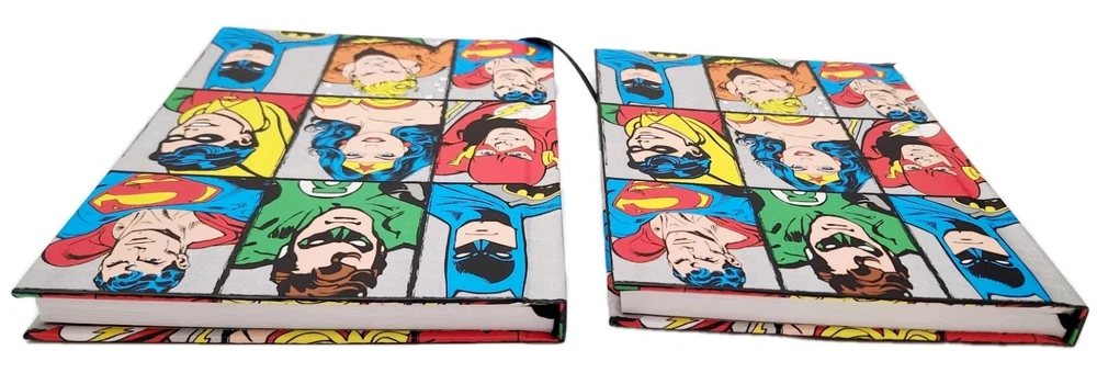 The product is a Lot of two DC Comics-themed hardcover journals featuring DC Comic Characters like Superman, Batman, Wonder Women, and more on the front and back covers. Each journal is decorated with a grid design and includes a ribbon bookmark for easy page tracking. The journals are made of durable hardcover cardboard and are not personalized or signed. Ideal for fans of DC Comics looking for a stylish and functional way to jot down notes or keep a journal. * Specifications: * Brand - DC Comics * UPC - 817989011152 * Model - DC6150 * Vintage - No ***** * Condition - New ***** * Included - (Lot Of 2) DC Comics Hardcover Journals featuring DC Comic Characters * Color - Multi-Color * Recommended Age - Ages 14 & Up * Number of Pages ( Approximately) 75 to 80 Lined, Two-Sided Sheets Which Include a Ribbon Book Mark To Assist With Tracking Your Pages. * Charaters on Book Cover includes Super Man, Batman, Wonder Women, and more! * Measurements - 8 Inches (L) x 6 Inches (W) ***** * Excellent Gift for Collectors, Birthdays, Christmas & All Other Special Occasions ***** * Honest Seller *****
