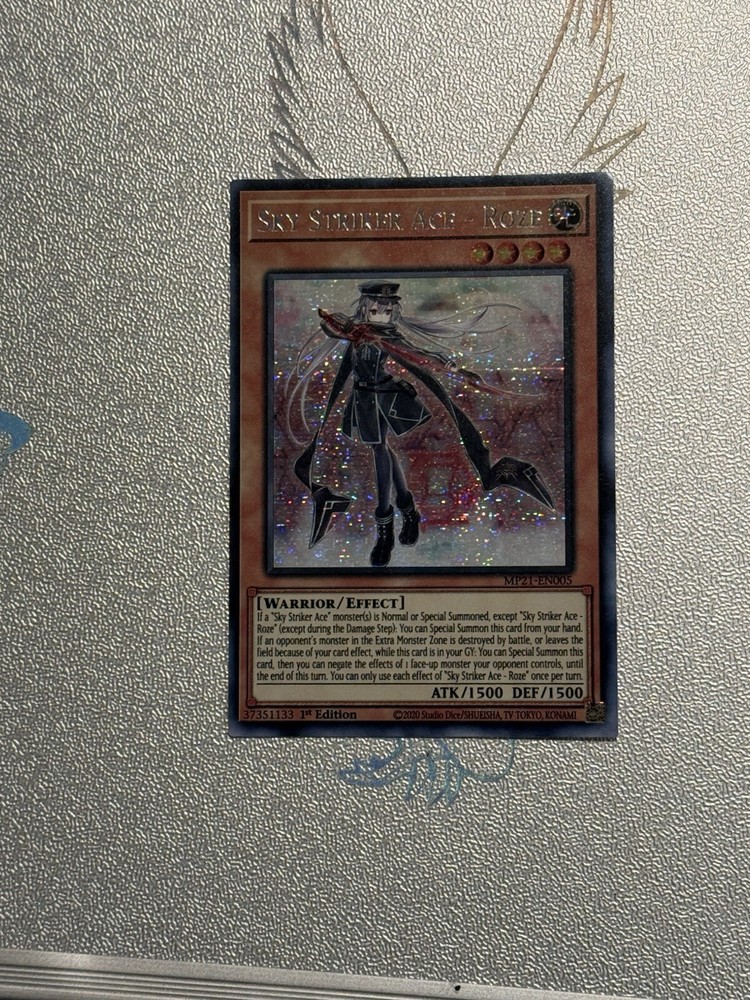 The "Sky Striker Ace - Roze" card is a powerful Warrior monster with 1500 Attack and 1500 Defense points, belonging to the Light attribute in the Yu-Gi-Oh! Trading Card Game. This card is a Prismatic Secret Rare from the 2021 Tin of Ancient Battles set, featuring English language and 1st Edition printing. Manufactured by Konami, this Effect card has the card number MP21-EN005, making it a valuable addition to any collector's deck.